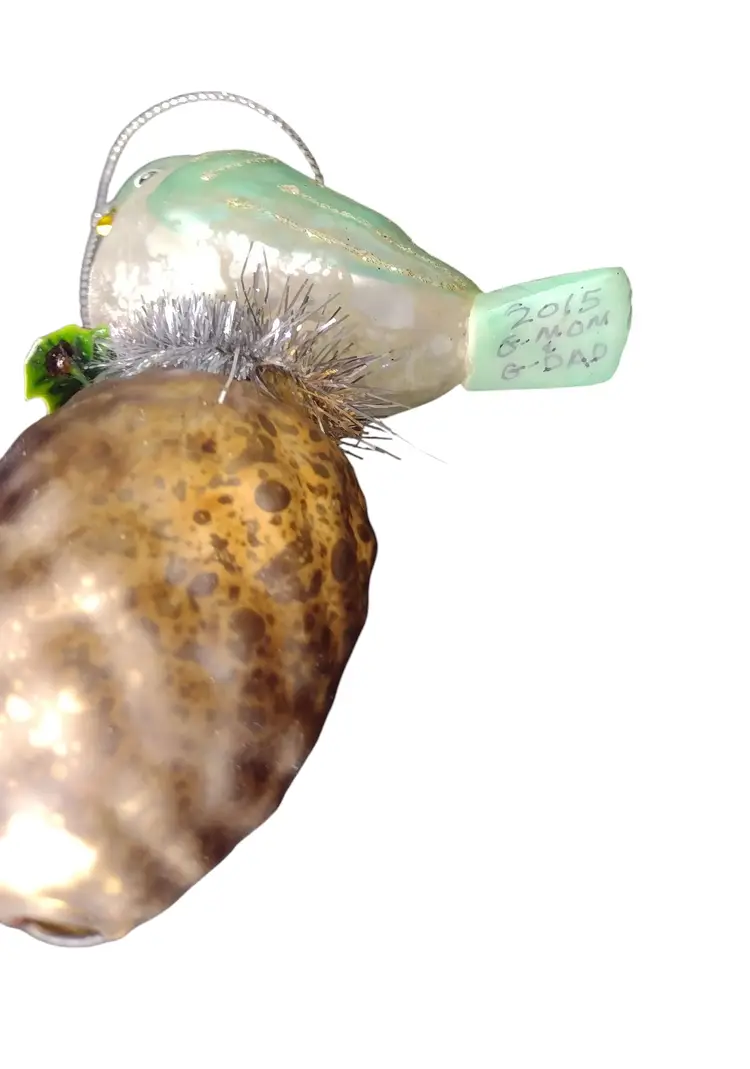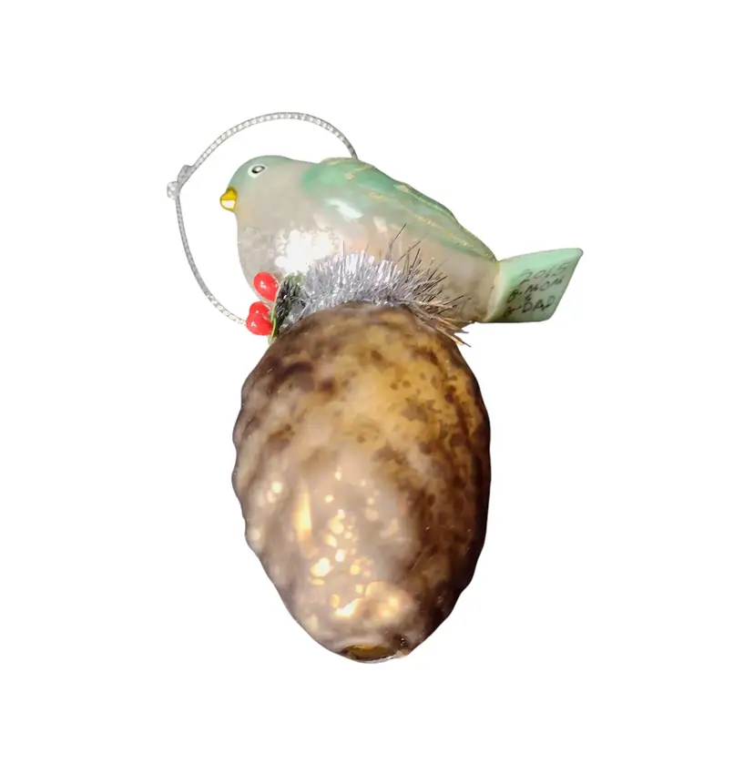 Item is pre-owned and in very good condition with no cracks or chips. Smoke free environment. This is a sweet little glass ornament with a mint Green bird with glitter on the wings sitting in a pinecone with garland & Holly leaves. This hanging ornament measures 4" tall x 3" long x 2.75" wide.
