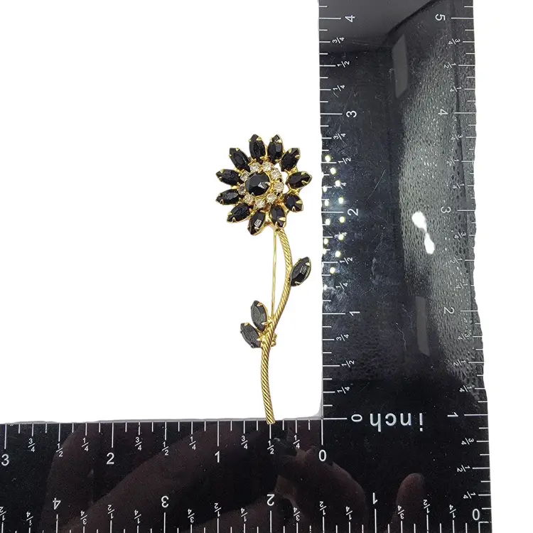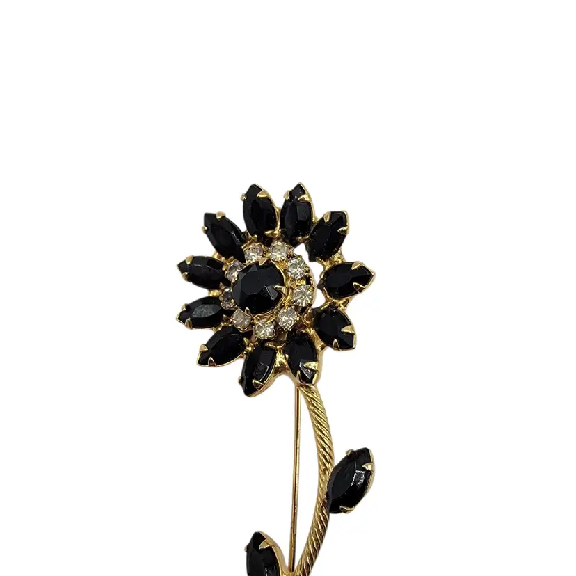 Once upon a time, in a realm of elegance, a brooch emerged, embodying the timeless allure of a midnight bloom. This black rhinestone flower brooch, with its meticulously twisted gold-tone stem and prong-set stones, gracefully whispers tales of sophistication and charm. A captivating piece, it seamlessly blends vintage beauty with modern appeal. Some attribute this piece to Weiss or Julianna, it's unsigned but high quality