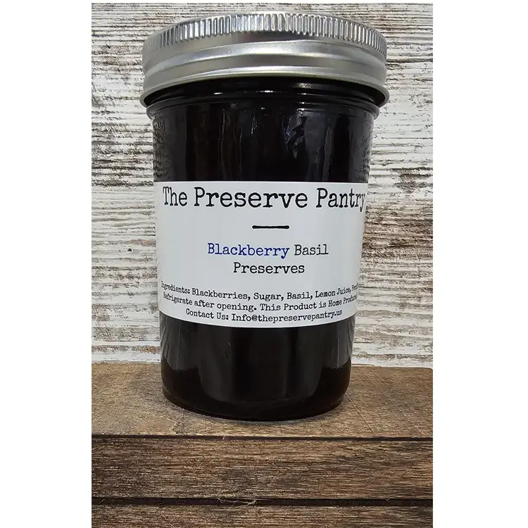 Taste summer in a jar with our Blackberry Basil Preserves, an artisanal jam packed with juicy, ripe blackberry flavor and a hint of fresh basil. This small-batch preserve features: Sweet, juicy blackberries at their peak A touch of basil that perfectly complements the berries A balanced sweet-tart flavor A smooth, spreadable texture Our Blackberry Basil Preserves deliver a sweet, tangy punch of flavor in every spoonful. We simmer each small batch with lemon juice and lemon zest to let the fresh flavors shine through. Spread it on biscuits, swirl into yogurt or use as a cake glaze - the possibilities are endless! Made with antioxidant-rich blackberries, this jam makes it easy to get your daily dose of fruit. If you love unique flavor combinations, our Blackberry Basil Preserves will make your mornings more delicious. This artisanal preserve is perfect for anyone looking to take their breakfasts, snacks and desserts from boring to brilliant. Ingredients: Blackberries, Sugar, Lemon Juice, Pectin, Basil.