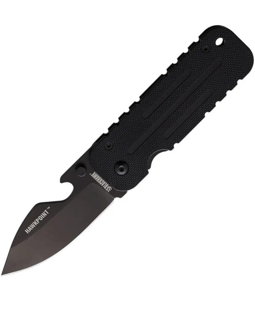 3.25" (8.26cm) closed. 2.25" (5.72cm) black oxide coated 9Cr stainless blade. Black G10 handle. Bottle opener. Thumb stud. Pocket clip. Lanyard hole. Boxed with hanging tab.