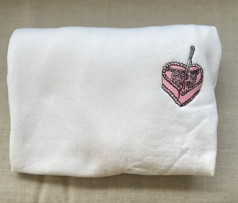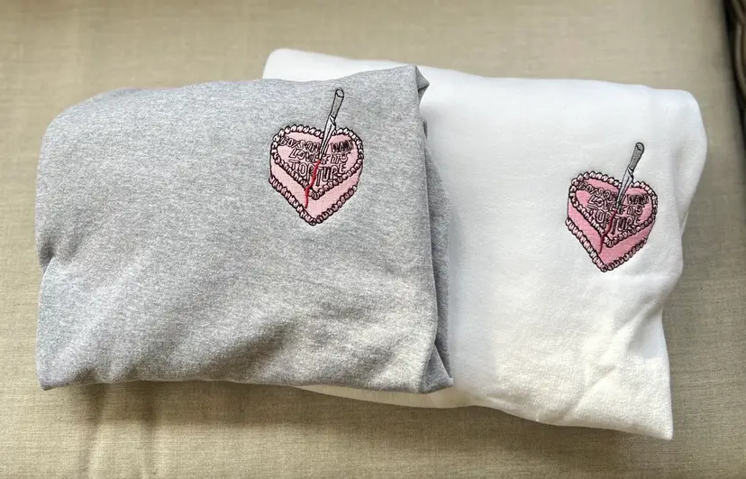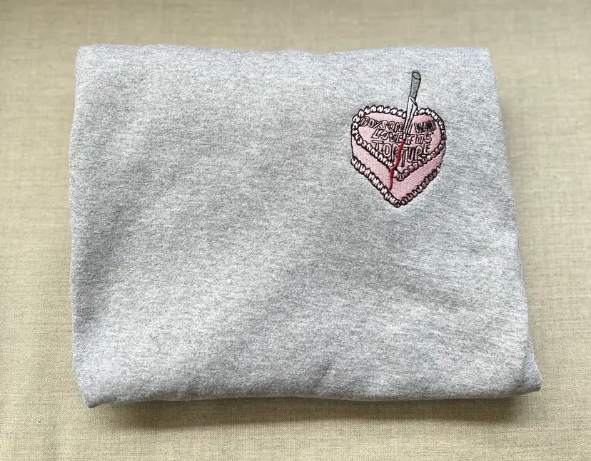 Embroidered sweatshirt inspired by the iconic cake featured in the Blank Space music video. Embroidered lyrics on cake “boys only want love if it’s torture”.