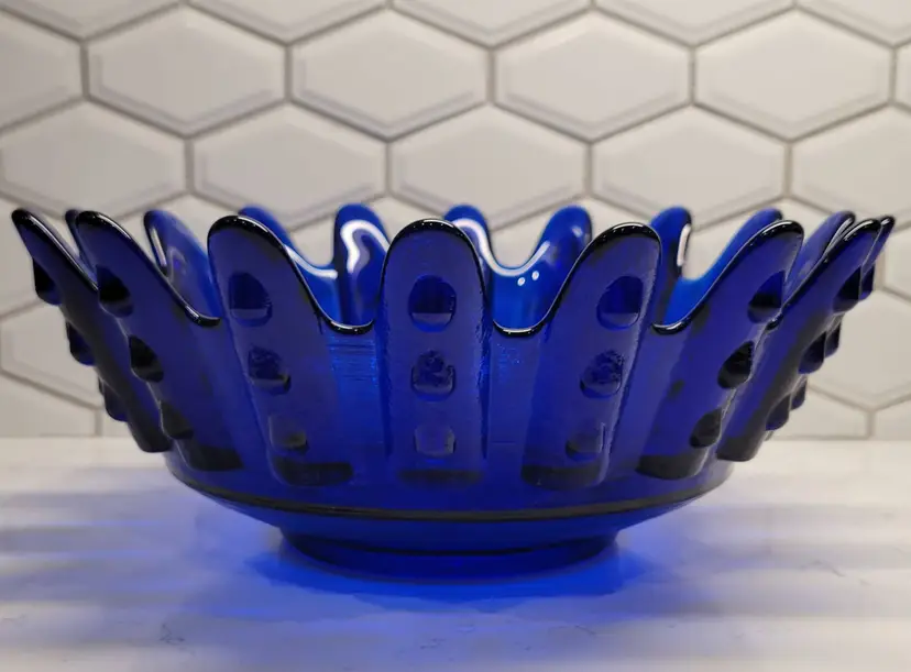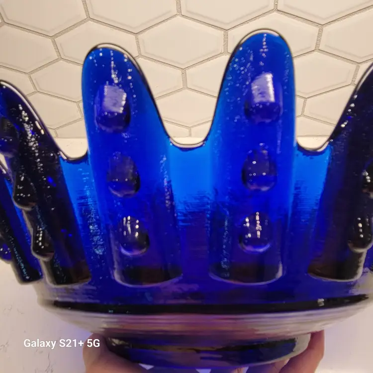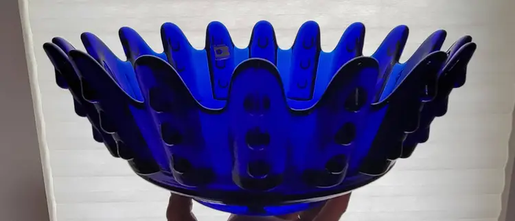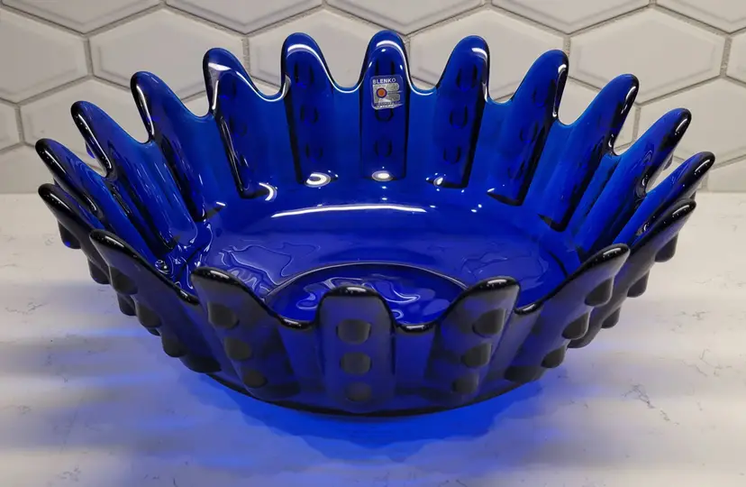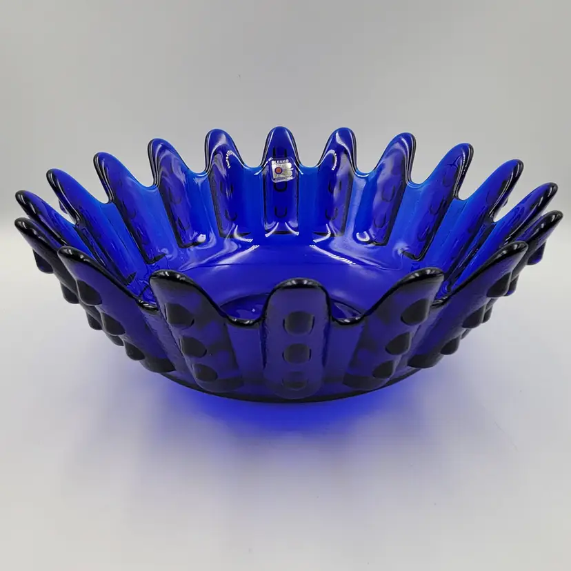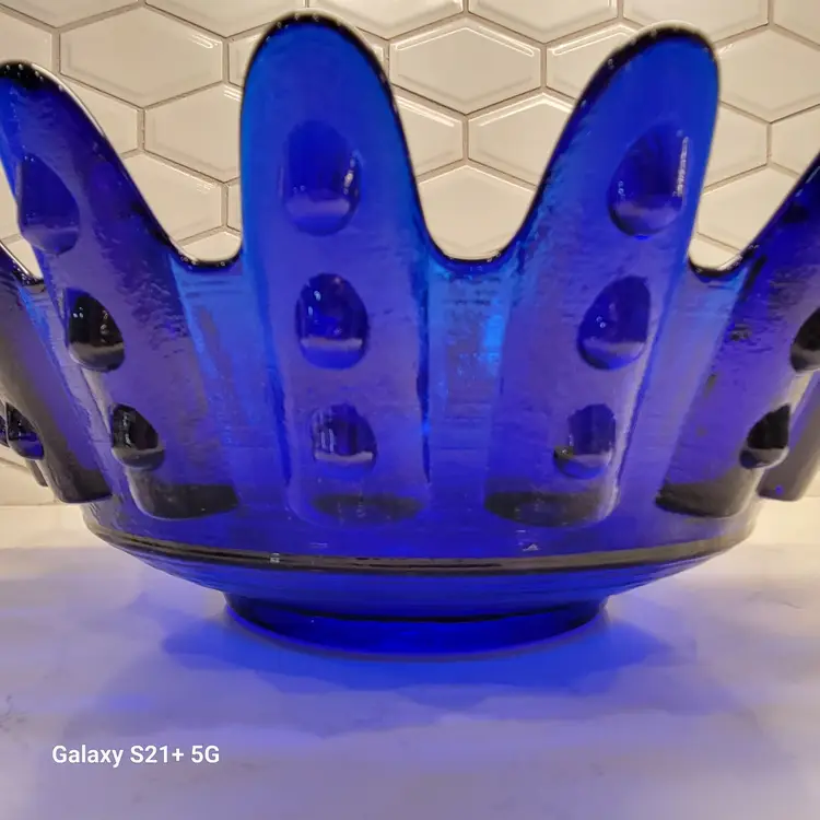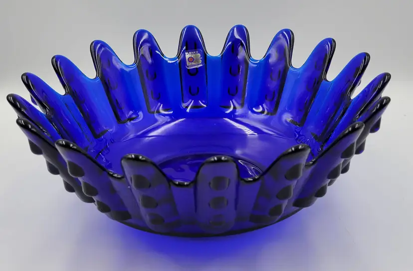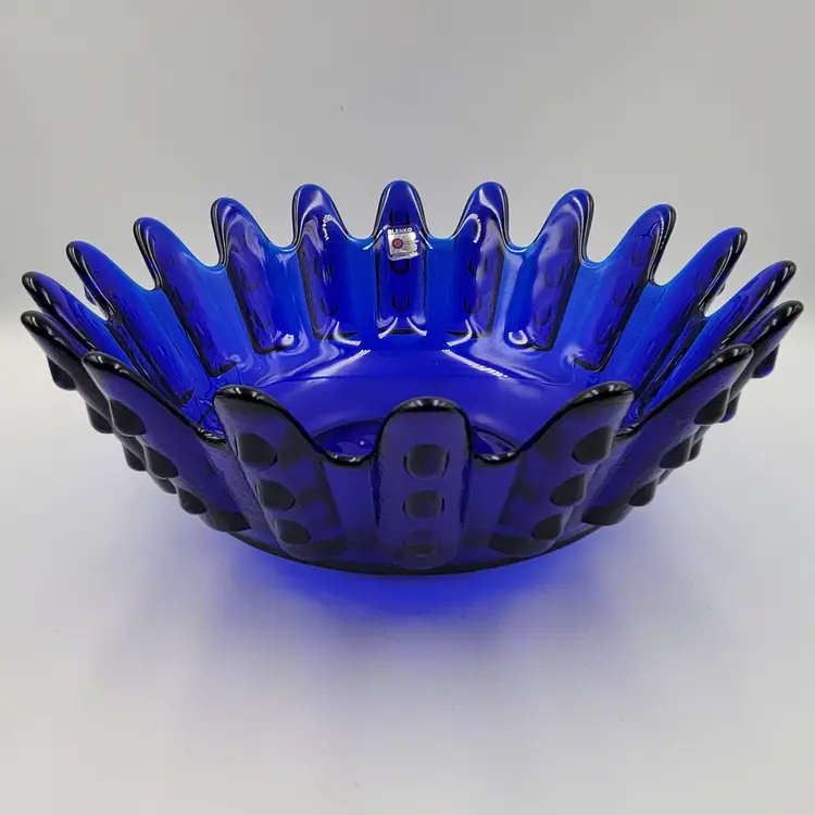 This Blenko Bowl first appeared in the 1994 catalog. This bowl has 18 fingers with 3 dots running down the outside of them (see photos). This piexes gives me a brutalist feeling. The color is believe is Cobalt Blue.