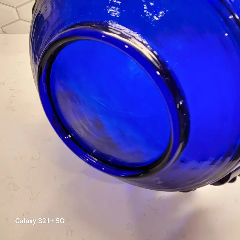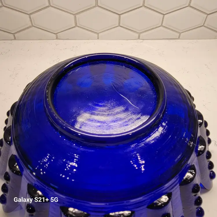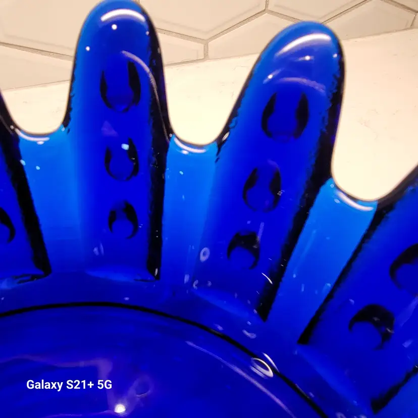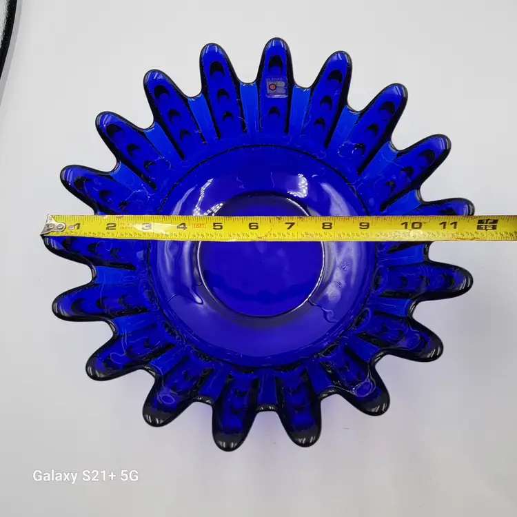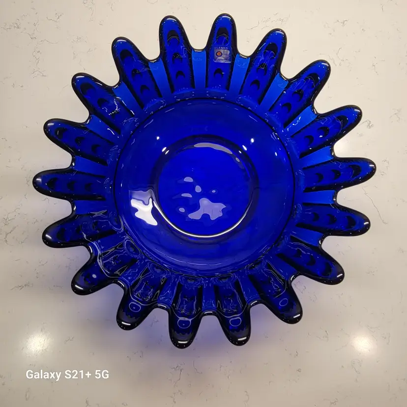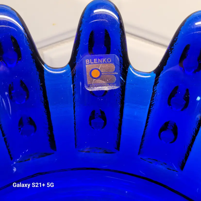 This Blenko Bowl first appeared in the 1994 catalog. This bowl has 18 fingers with 3 dots running down the outside of them (see photos). This piexes gives me a brutalist feeling. The color is believe is Cobalt Blue.