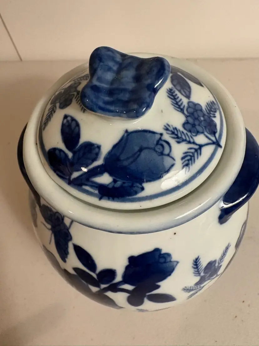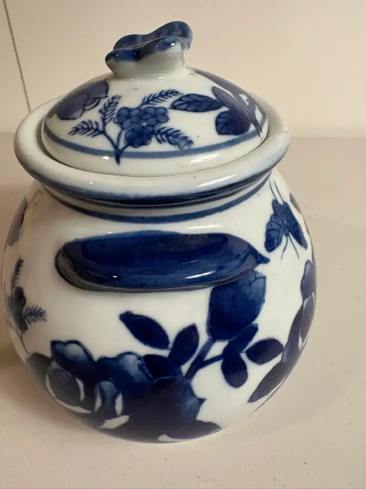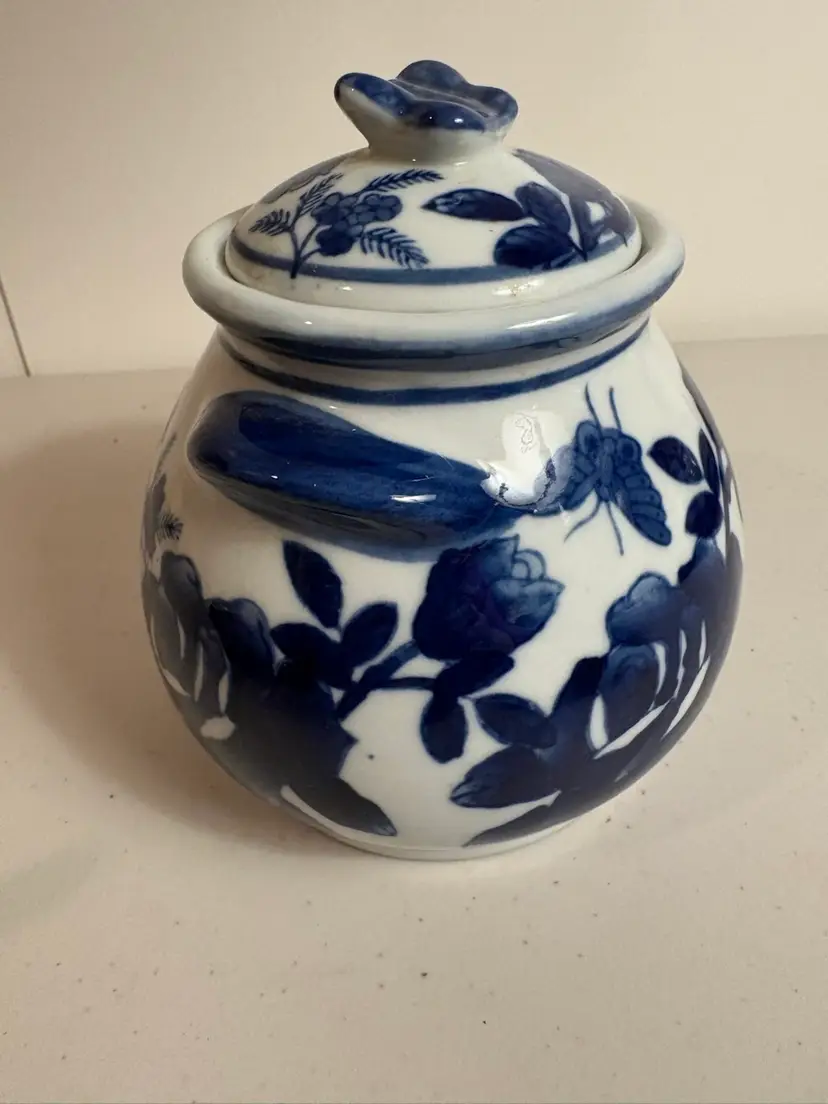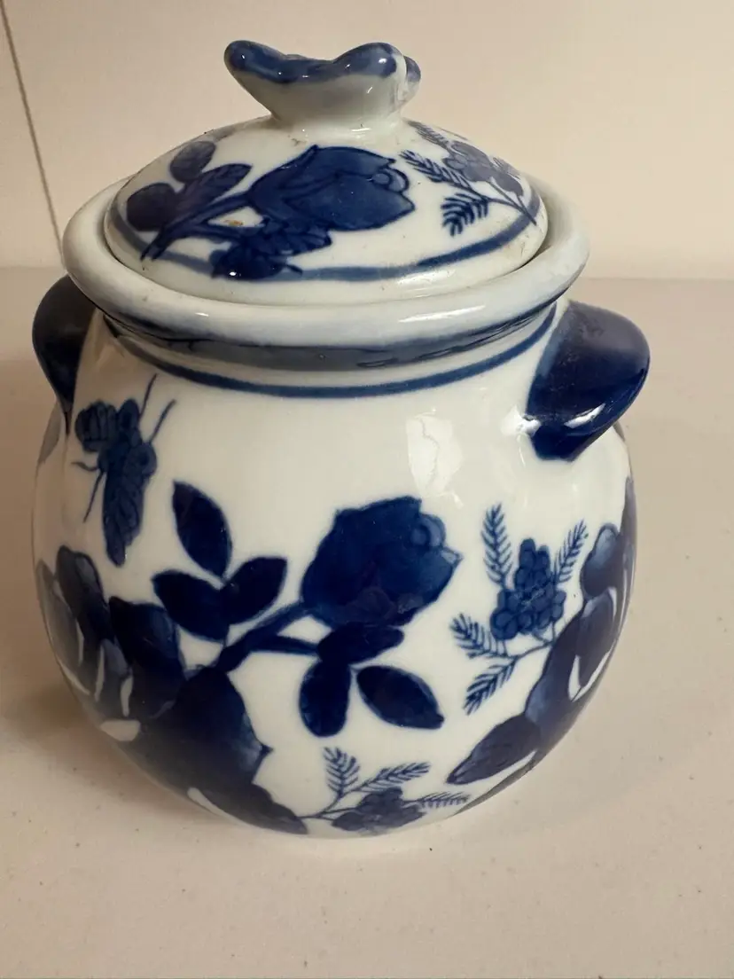 This Blue & White Chinese Lidded Jar with Handles features a beautiful design of roses and butterflies, showcasing traditional Chinese culture. Made in China, this collectible vase adds a touch of elegance to any space with its intricate patterns and craftsmanship. Perfect for collectors of Chinese art and décor, this piece is a unique addition to any home or collection.