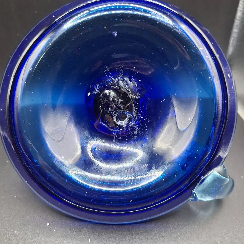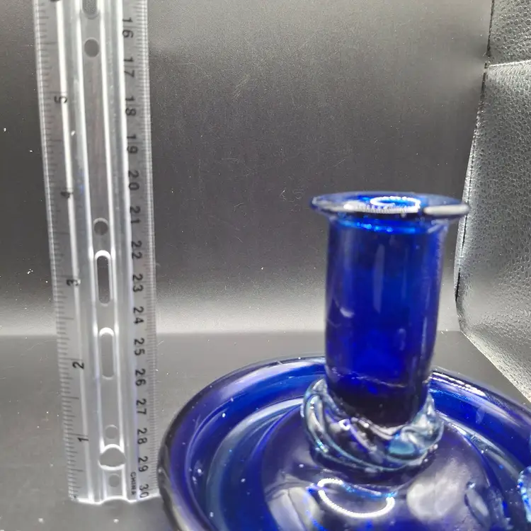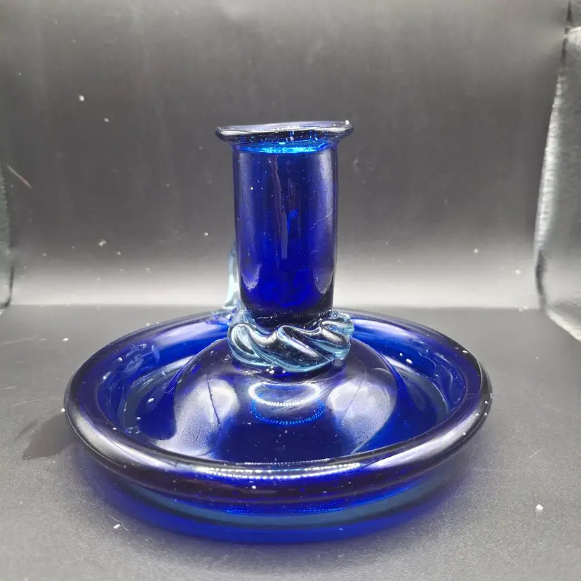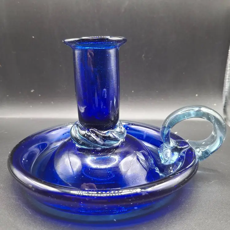 In the soft, diffused light of a craftsman's studio, a mesmerizing blue glass candlestick emerges like a frozen moment of molten magic. Crafted with the delicate precision of an artist's touch, this piece whispers stories of skilled hands shaping liquid glass into a dance of cobalt and crystal. The deep sapphire hue catches and refracts light, creating an ethereal glow that speaks of ancient glassblowing traditions and the transformative power of creativity. A graceful curved handle, like a dancer's elegant arm, reaches out from the base, adding a sense of fluid movement to this timeless piece of functional art.