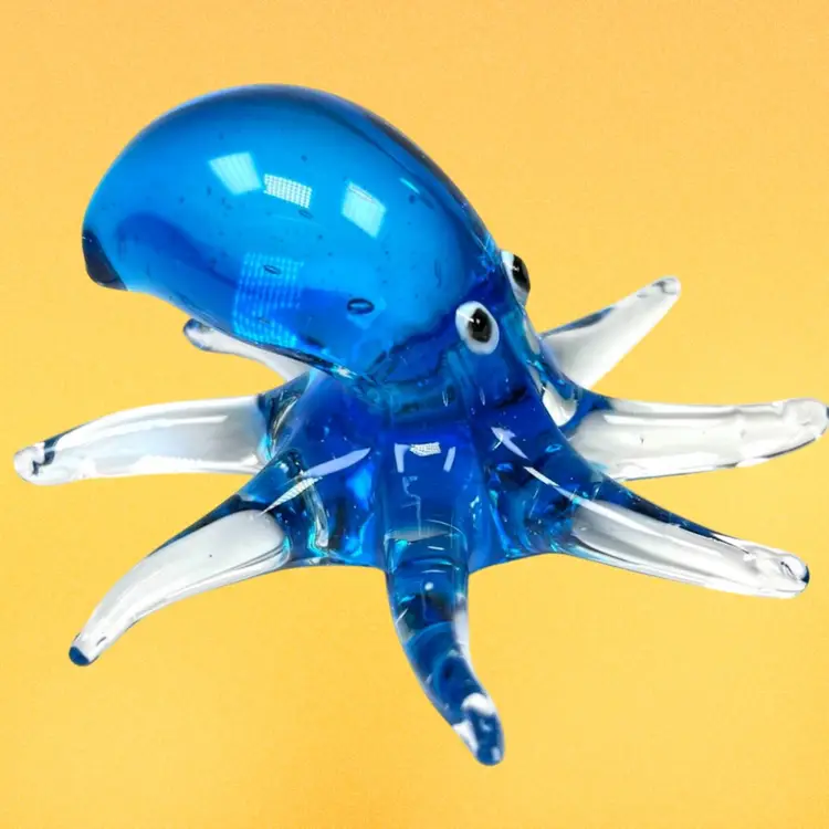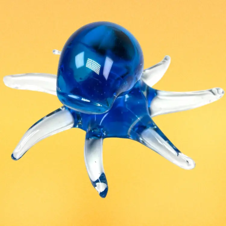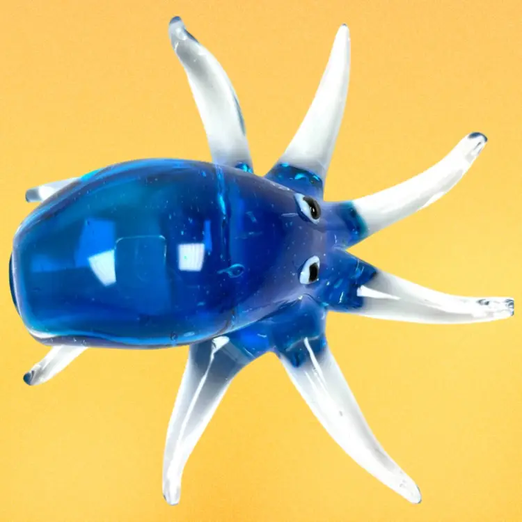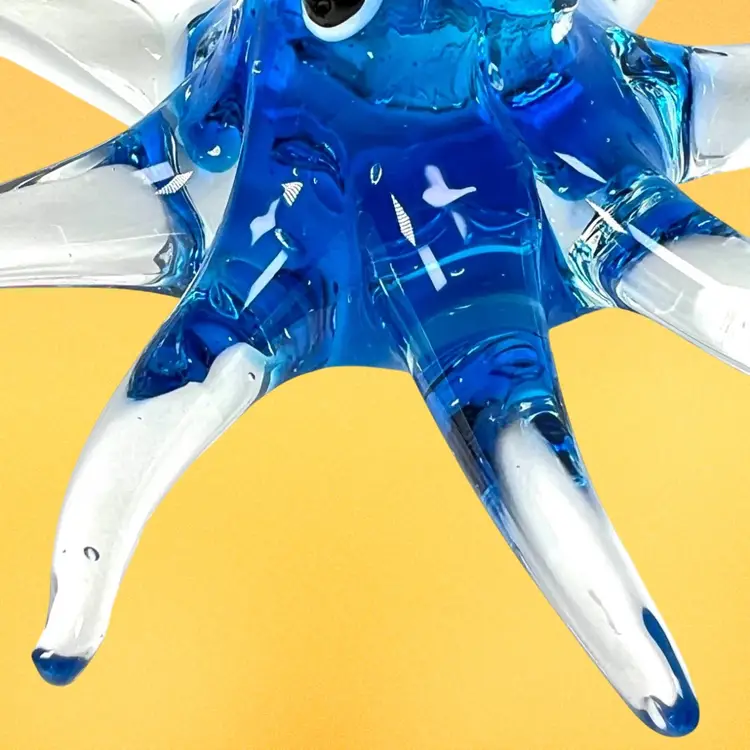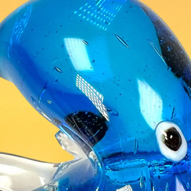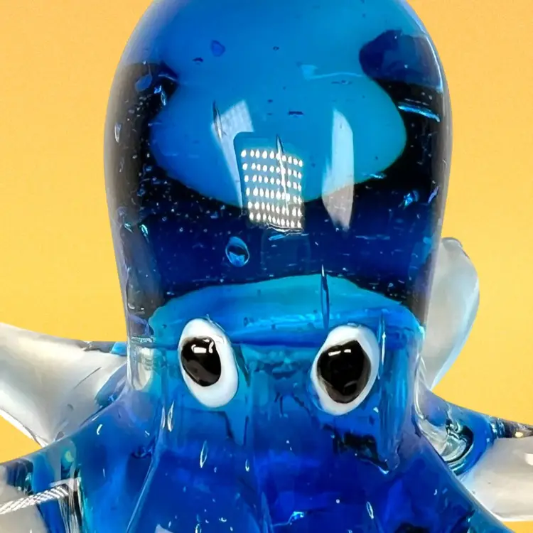 💙 Emerging from the oceanic abyss to wrap its 8 tentacles around your heart 💙 You’ll be “suckered” in and “attached” to this cutie! Blue Octopus 🐙 Art Glass Figurine. Soul-Piercing Glass Eyeballs 👀. Unsigned. Unpolished Bottom. Bubbling with personality! Its internal bubbles can be seen in the photos. 4-1/2” L x 2-1/2” H. Weighs 9 ounces. Condition: No chips/cracks on top. On bottom edge of base, there is a small chippy & a couple scratches which look like made by grinding wheel. Please see circled areas in last 2 photos.