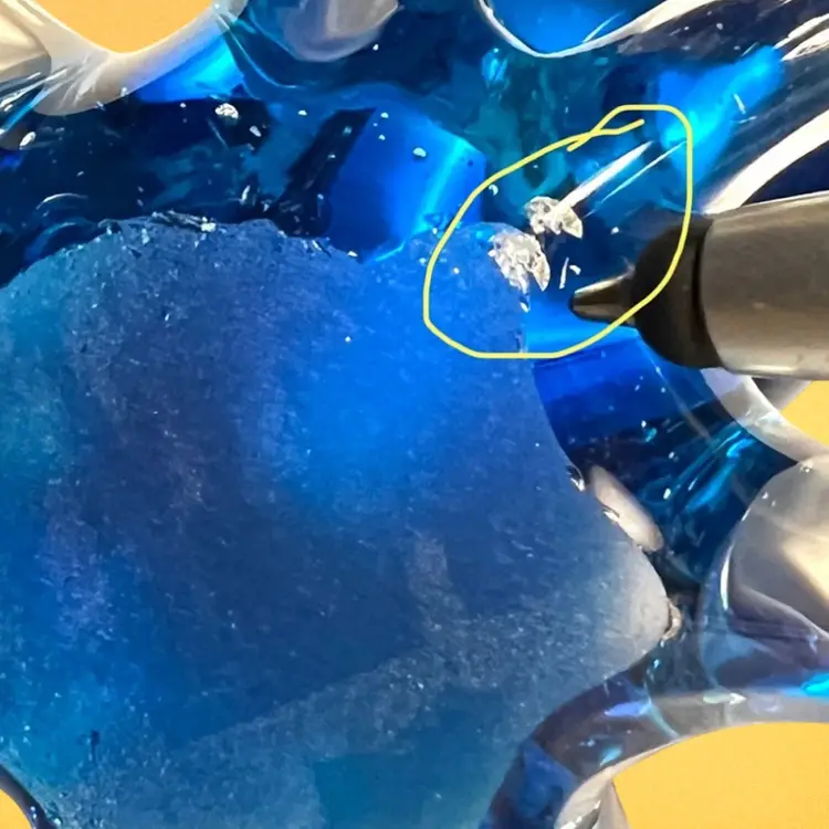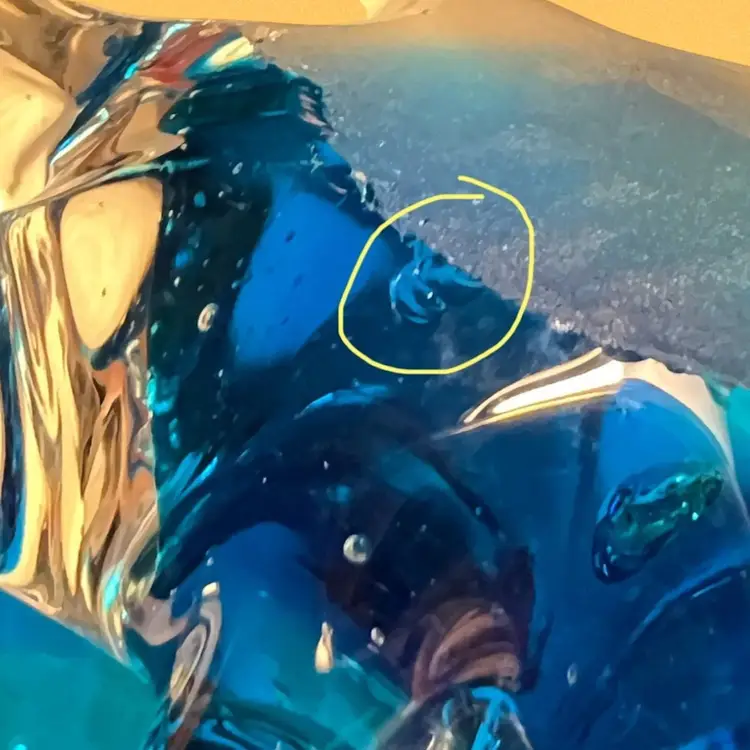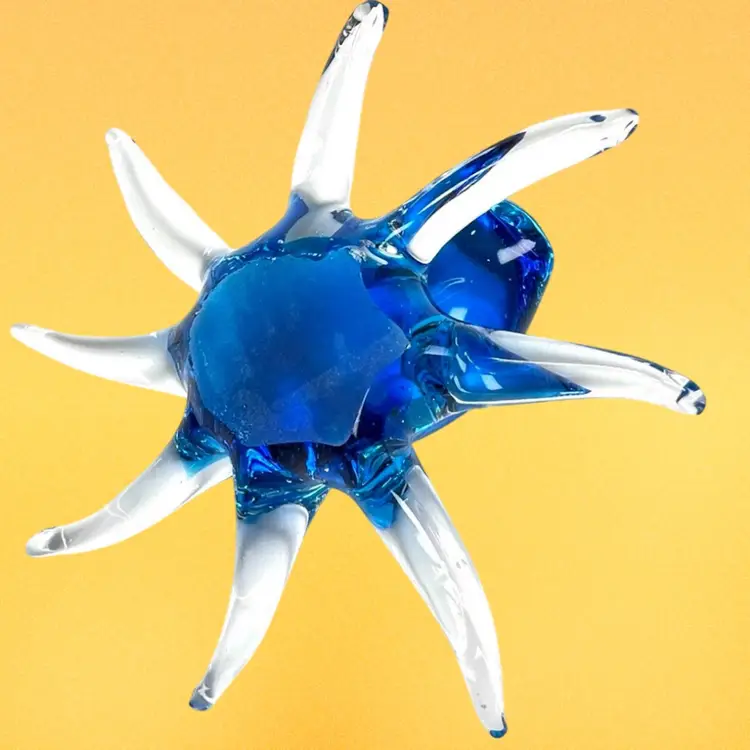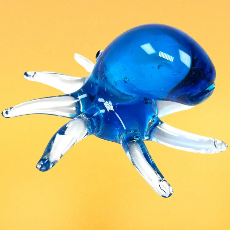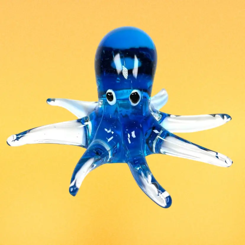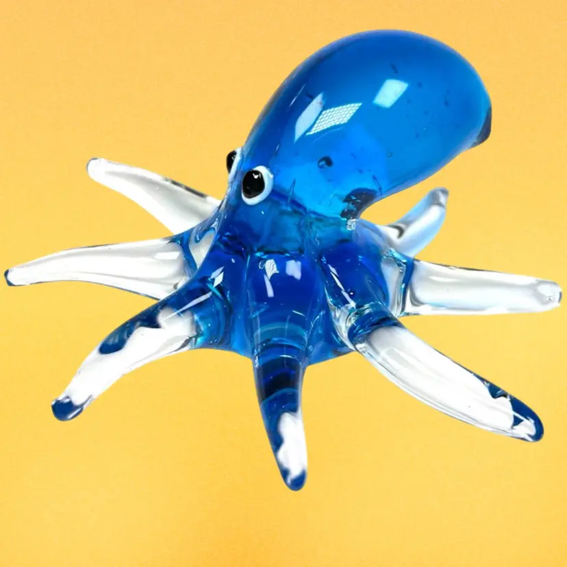 💙 Emerging from the oceanic abyss to wrap its 8 tentacles around your heart 💙 You’ll be “suckered” in and “attached” to this cutie! Blue Octopus 🐙 Art Glass Figurine. Soul-Piercing Glass Eyeballs 👀. Unsigned. Unpolished Bottom. Bubbling with personality! Its internal bubbles can be seen in the photos. 4-1/2” L x 2-1/2” H. Weighs 9 ounces. Condition: No chips/cracks on top. On bottom edge of base, there is a small chippy & a couple scratches which look like made by grinding wheel. Please see circled areas in last 2 photos.