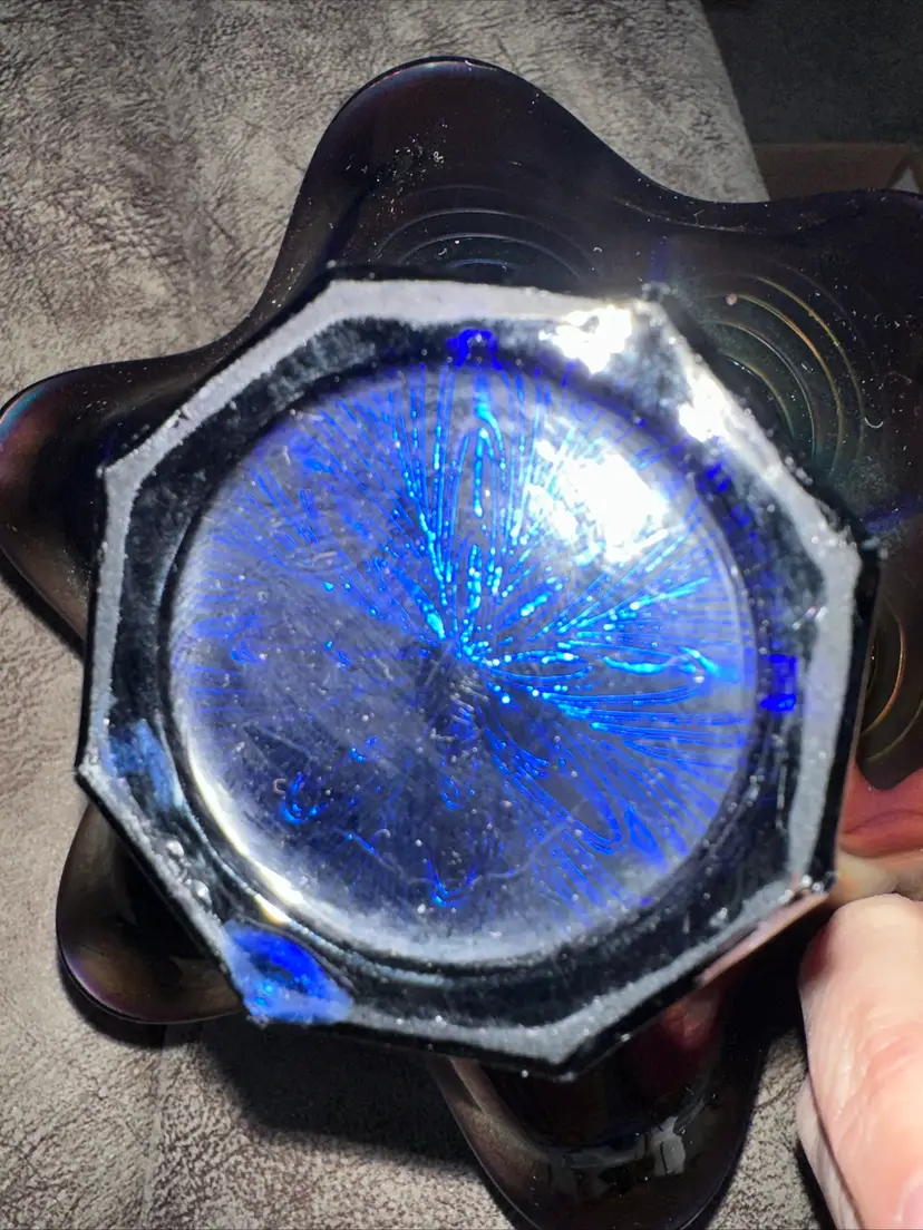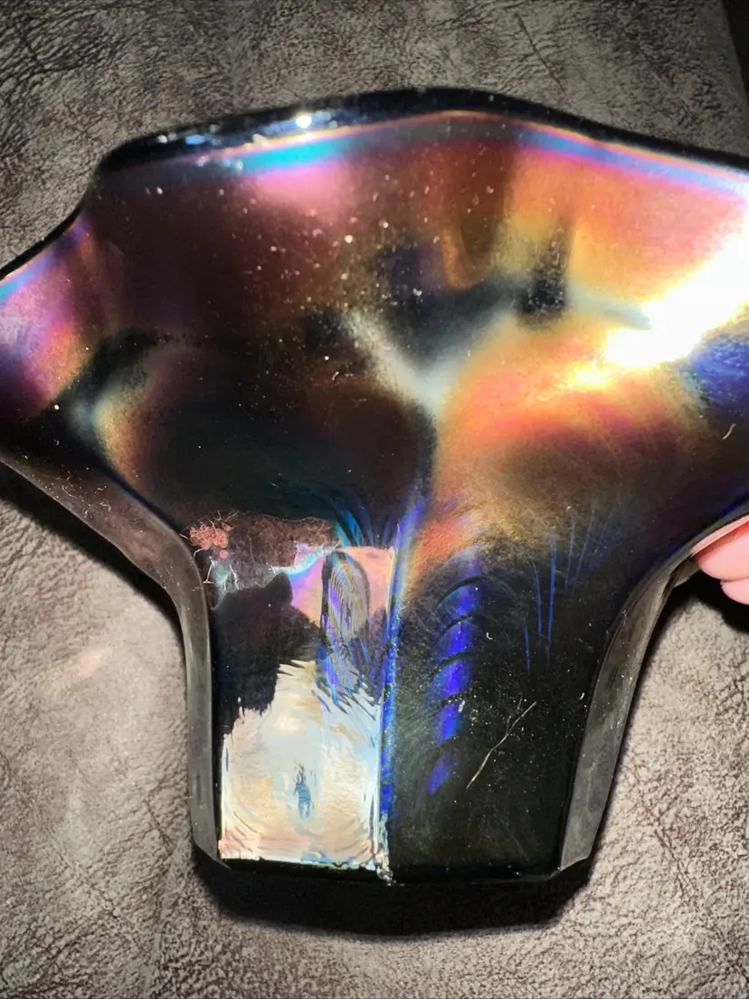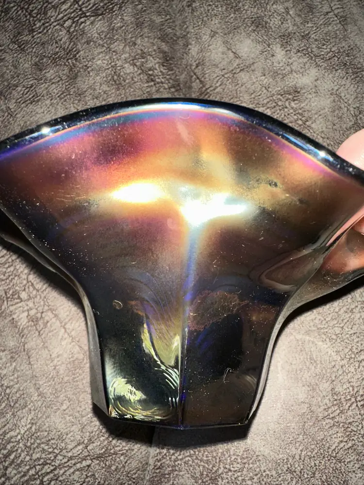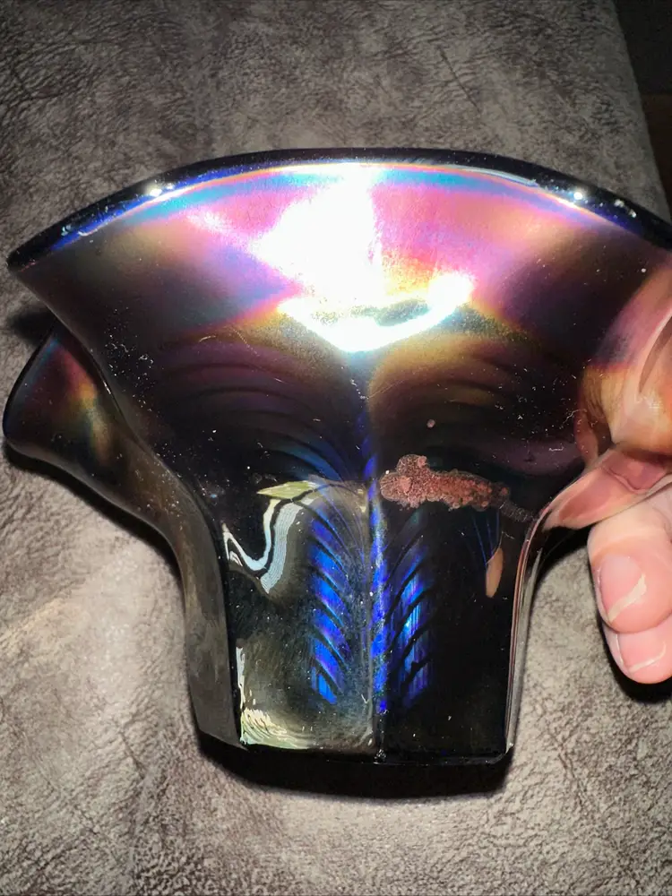 Blue Purple Amethyst Peacock Pattern Carnival Glass Wavy Bowl