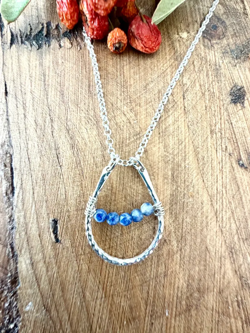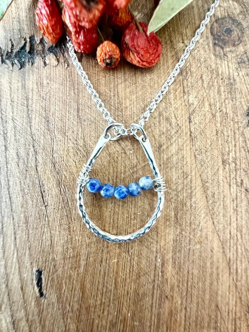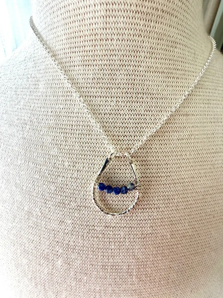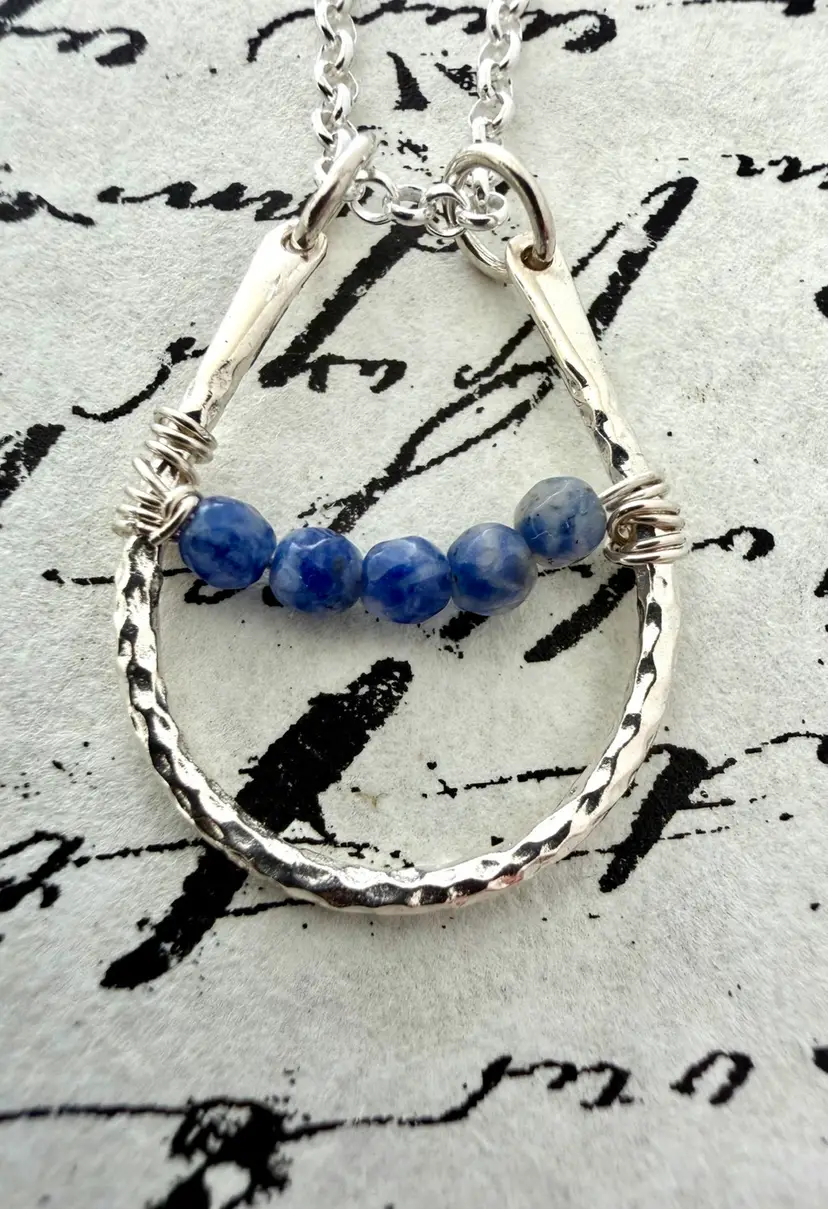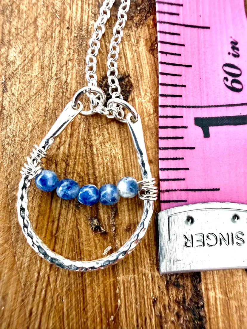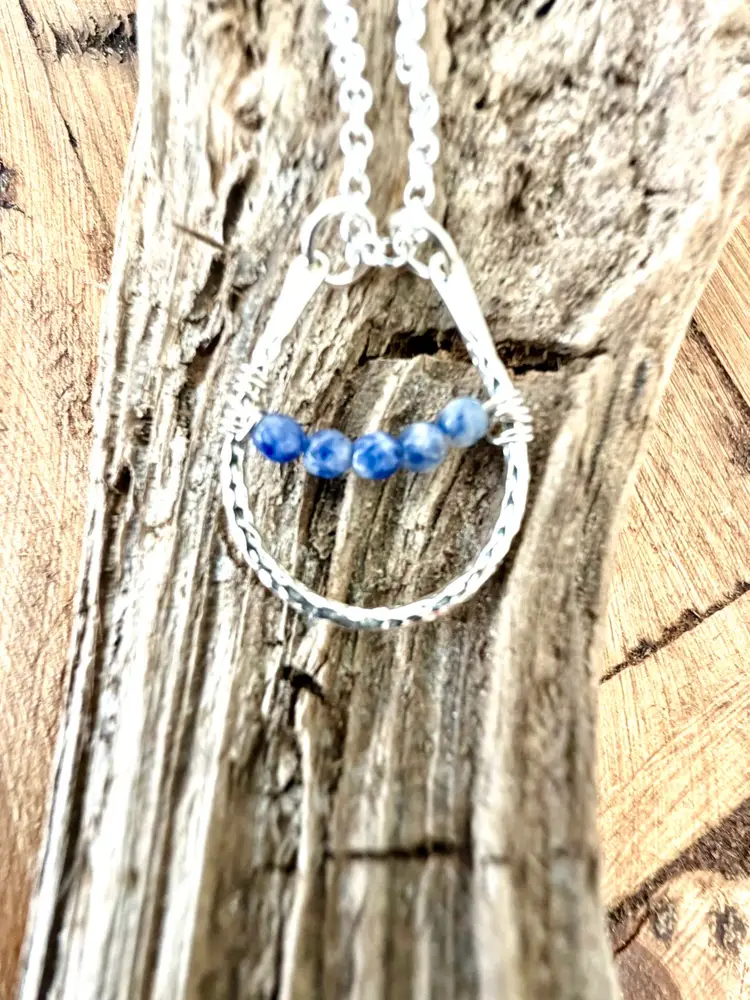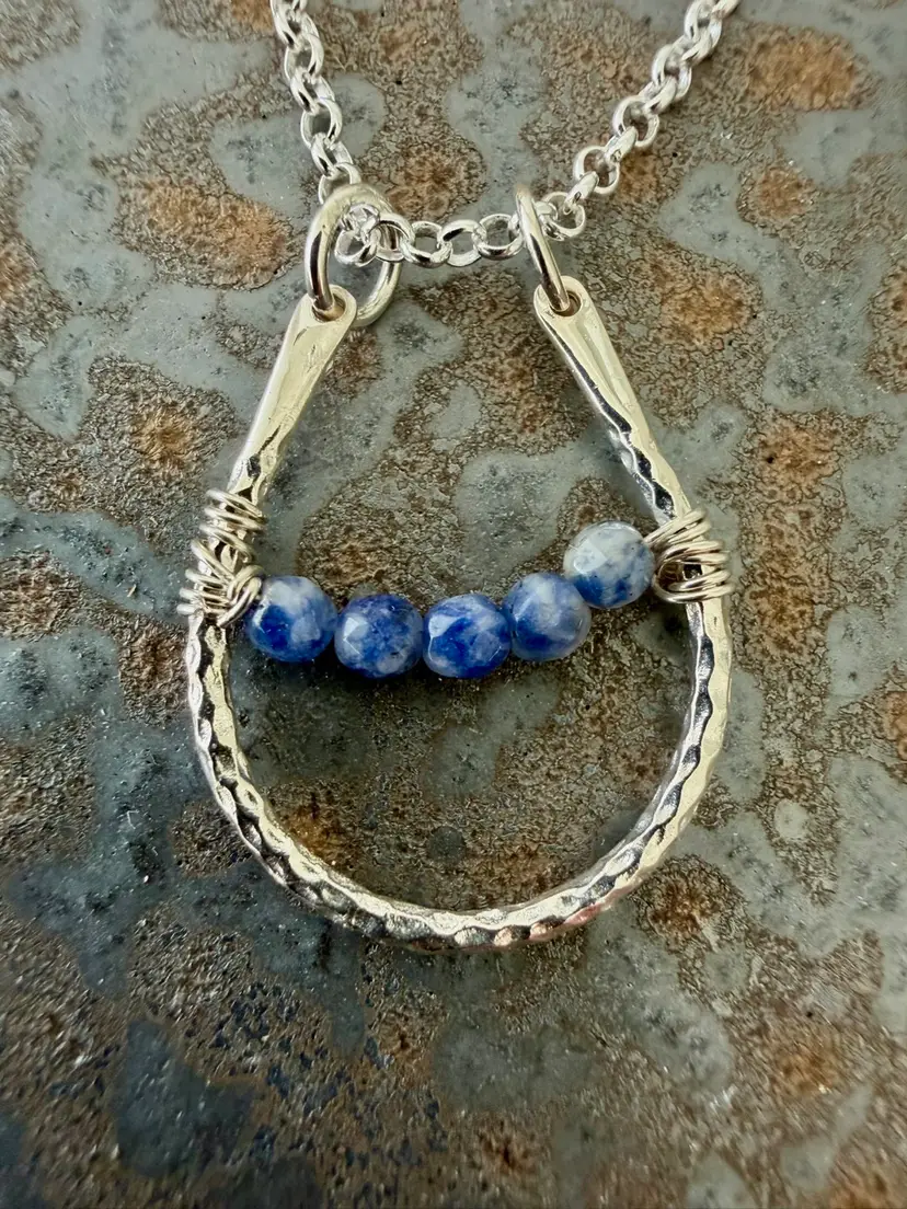 Sodalite Wired Beads Sterling Silver Starfish Silver Hammered Horeshoe Style Pendant 17” length Sterling Silver Chain