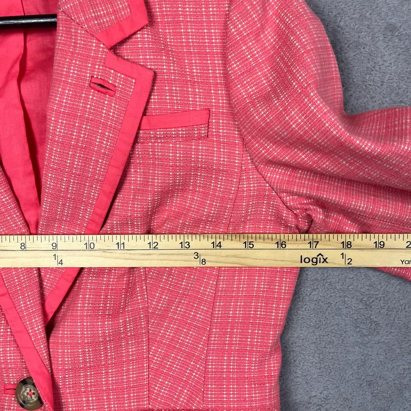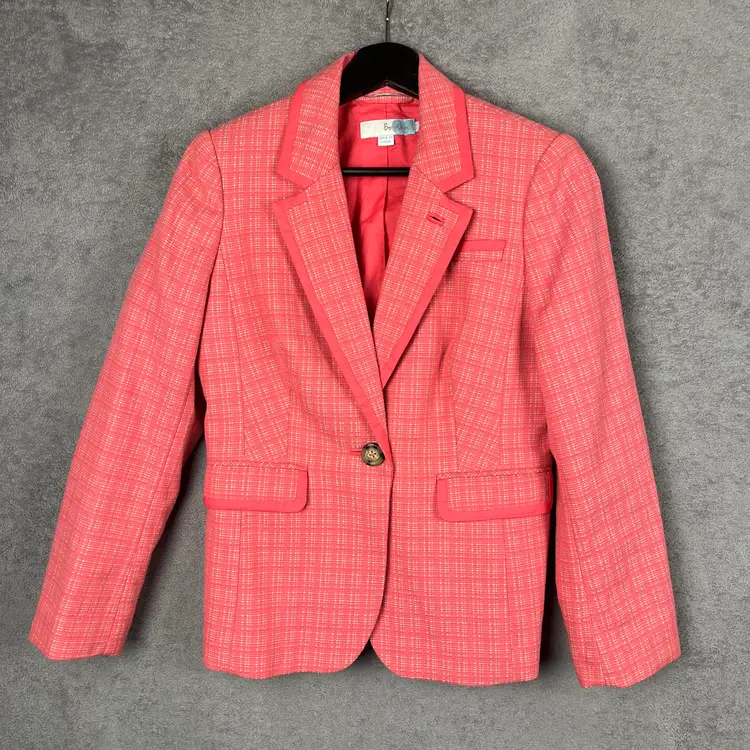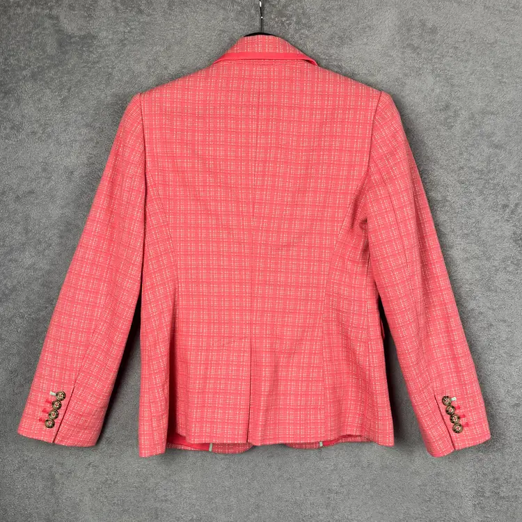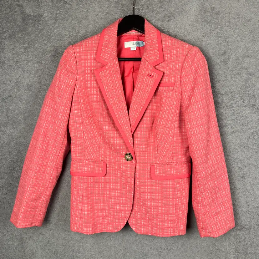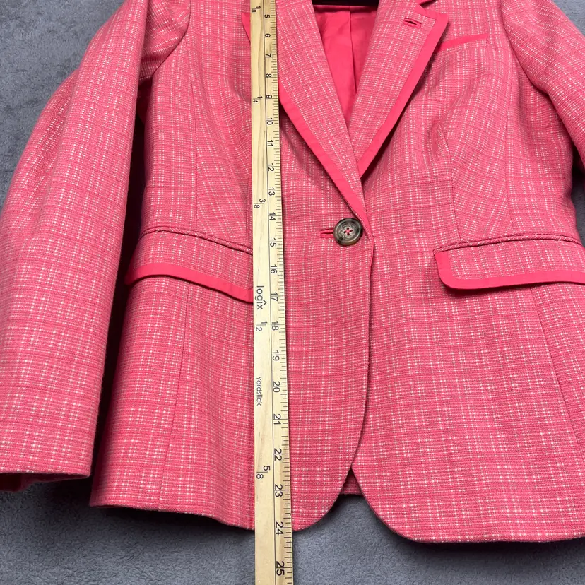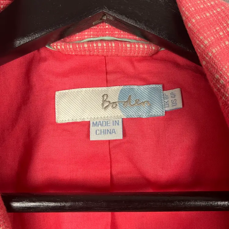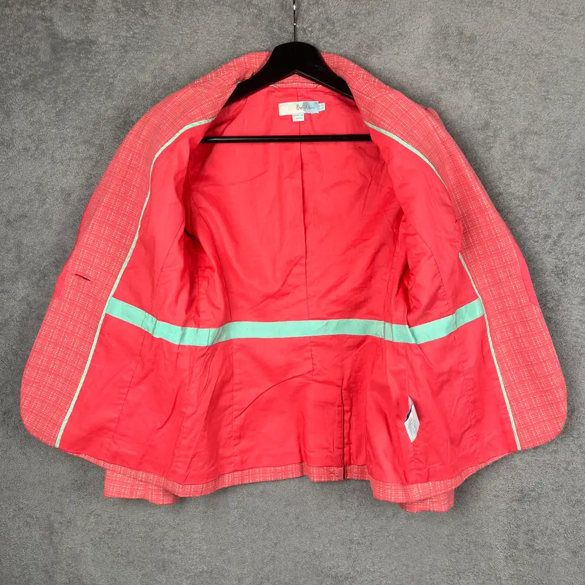This vibrant Boden blazer brings cheerful sophistication to your wardrobe with its coral pink plaid weave and feminine, tailored silhouette. Crafted from 100% cotton, it’s fully lined in rich coral with a mint accent stripe—an elegant touch that’s signature to Boden’s attention to detail. The single-button front and structured design offer a polished yet effortless look that flatters every shape.