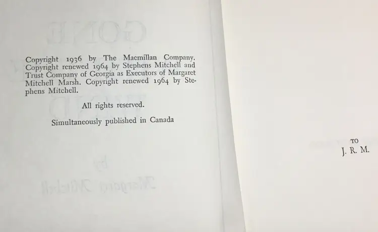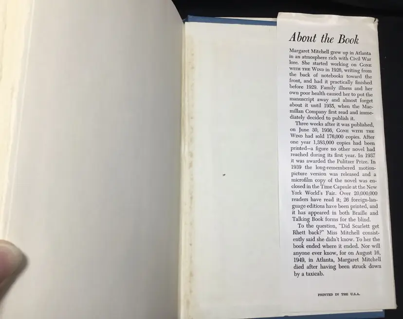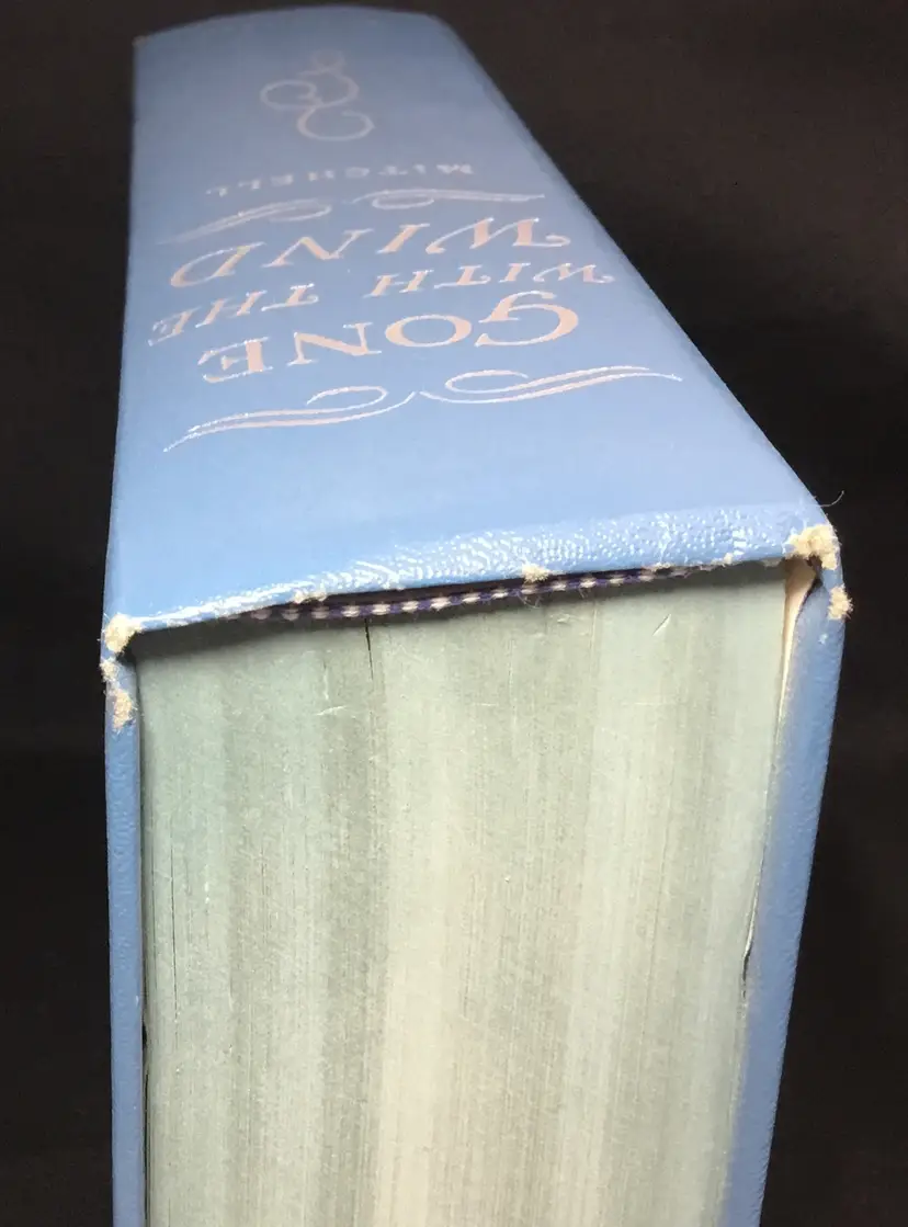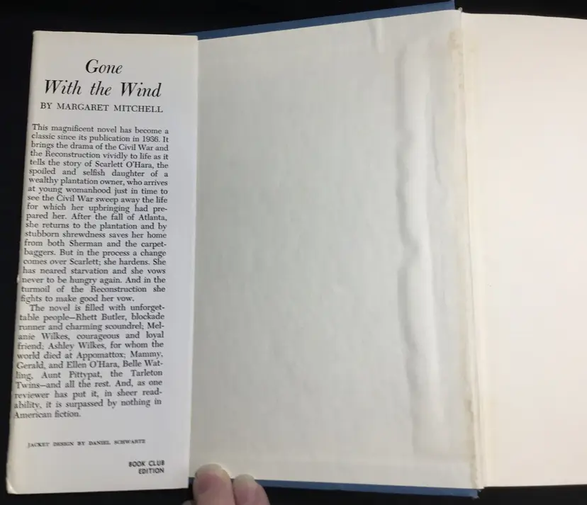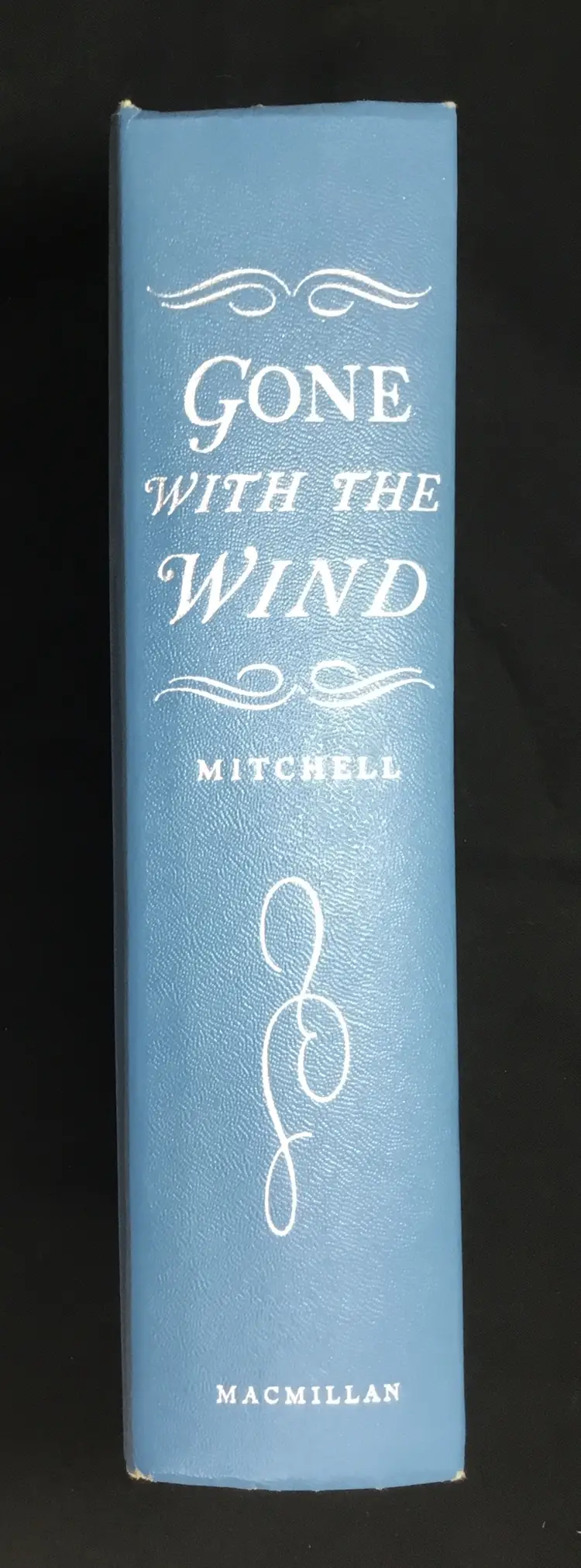 733 pages, 8.5 inches tall by 5.75 inches wide. Illustrated dust jacket by Daniel Schwartz. The life and loves of Scarlett O'Hara, a spoiled and selfish, rich plantation owner's daughter during the Civil War and Reconstruction. She fights to keep her beloved plantation, called Tara, from being destroyed by Sherman's army or stolen by carpetbaggers after the war is over. Good condition, small tears along edges of dust jacket, discoloration inside front and back covers near binding, long bubble inside front cover, 2 tiny scrapes on front cover, wear on corners of hardcover binding. (See all photos.)