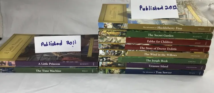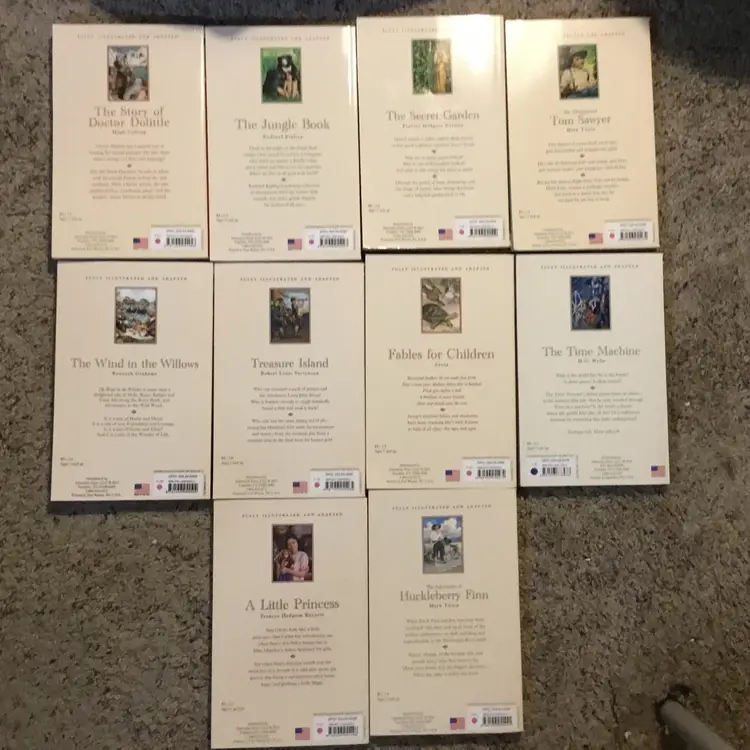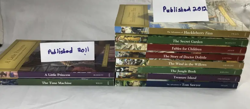 Lot of 10 Junior Classics for Young Readers books, by Dalmatian Press publishing 2 books from 2011: A Little Princess & The Time Machine. 8 books from 2012: The Jungle Book, The Secret Garden, Wind in the Willows, Dr. Doolittle, Treasure Island, Huckleberry Finn, Tom Sawyer, Aesop's Fables. All are illustrated. Minor wear on a few edges or corners.