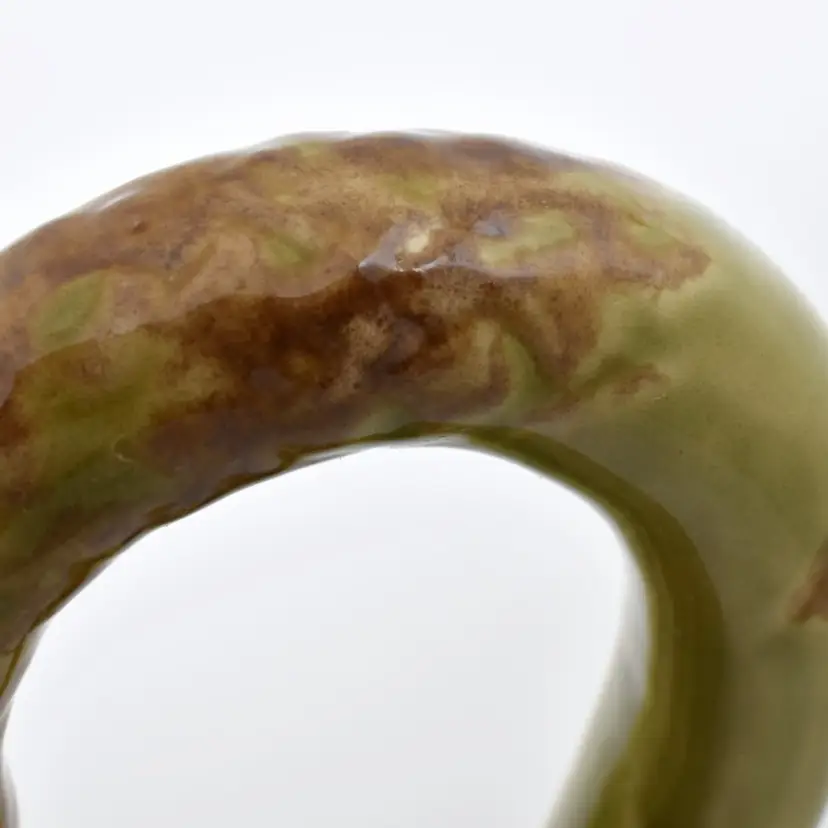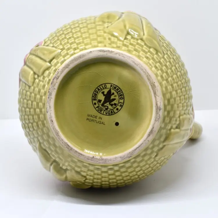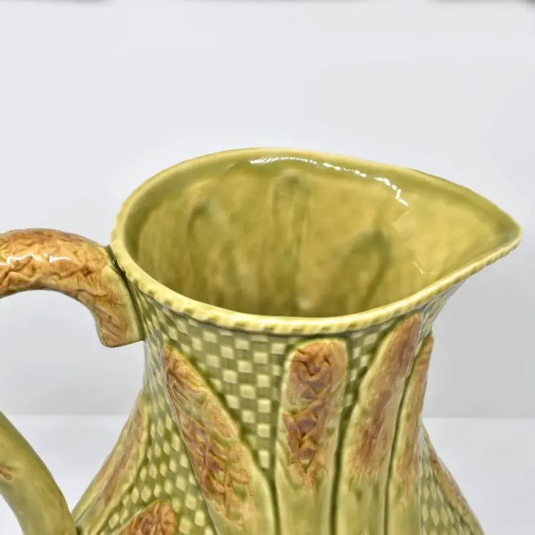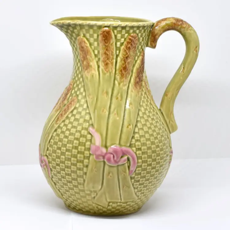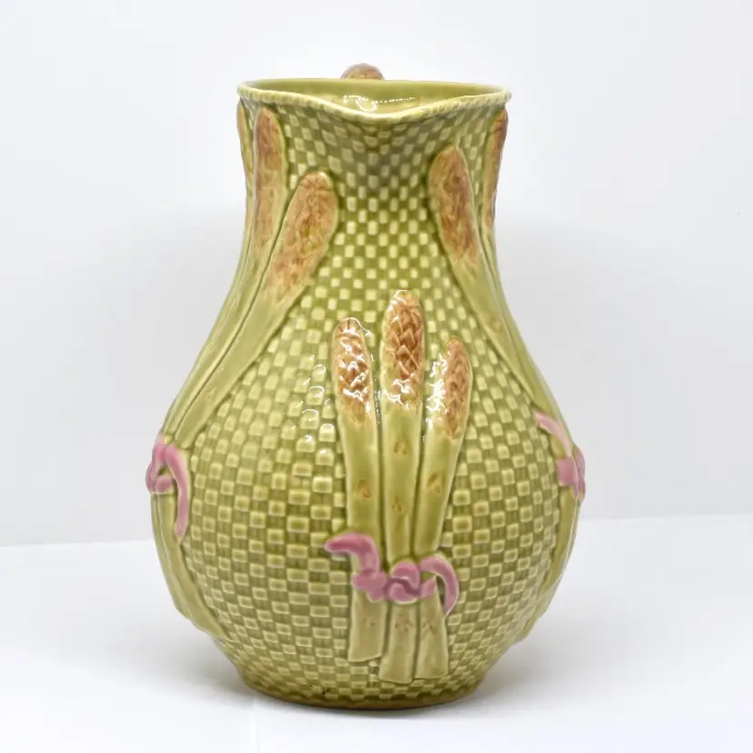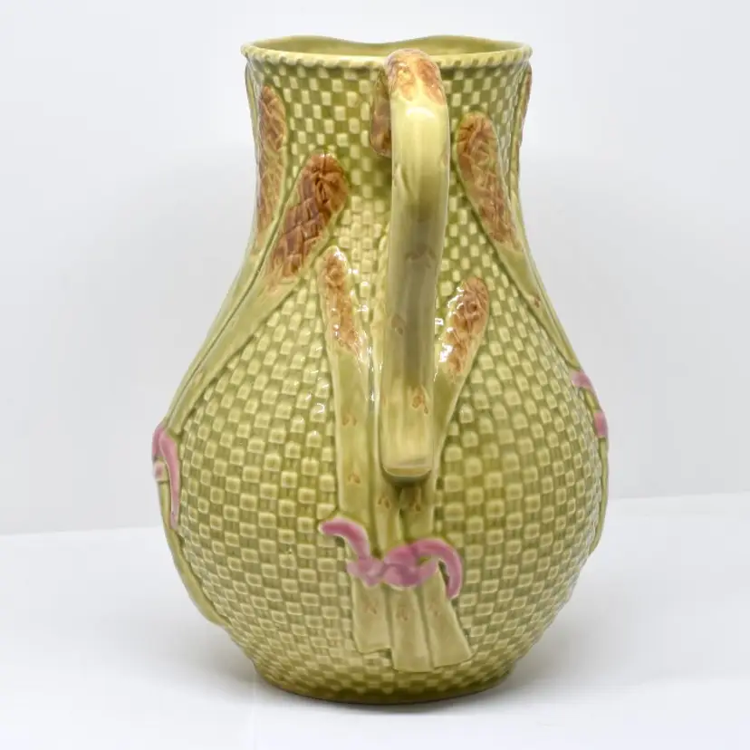 This pitcher is approximately 8.75" H x approximately 7.75" W x approximately 6.75" D. It is in very good condition. Please see the photos for this pitchers characteristics. The last photo does show a small defect in the glazing on the handle. The photo was darkened so it can be seen. There is some crazing at its bottom.