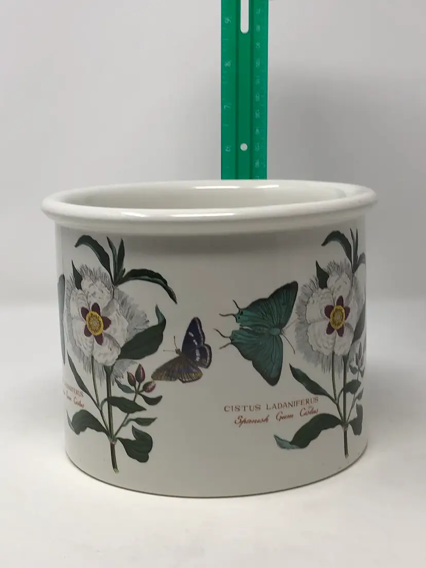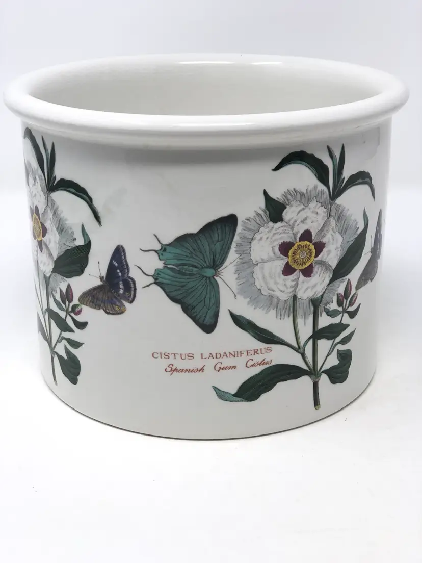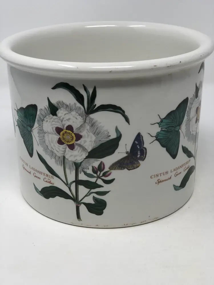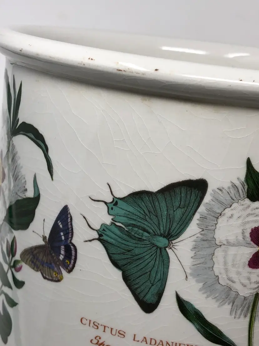 5" tall and 7" across utensil crock made in England. Beautiful collector's design by Portmeirion with white flowers and gorgeous butterflies. Age shows in crazing and some spots in the glaze as shown in photos