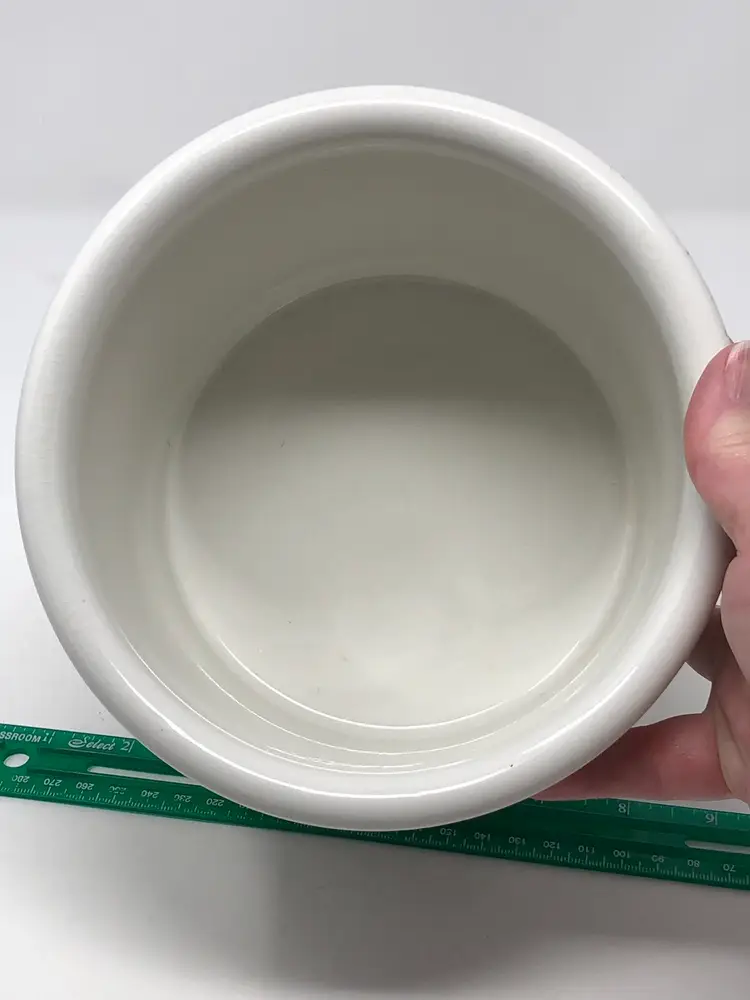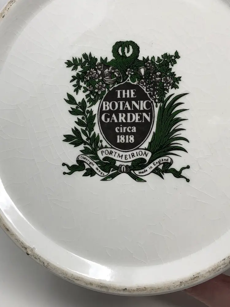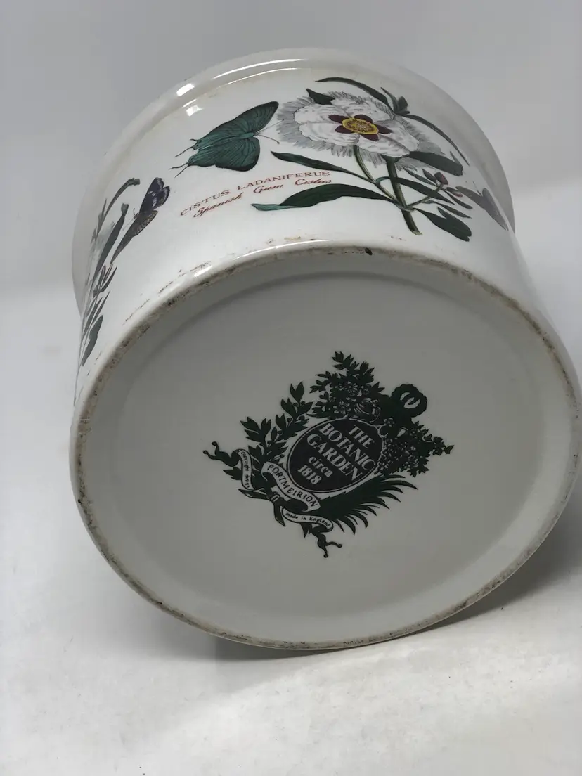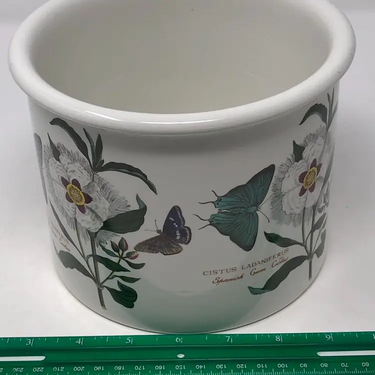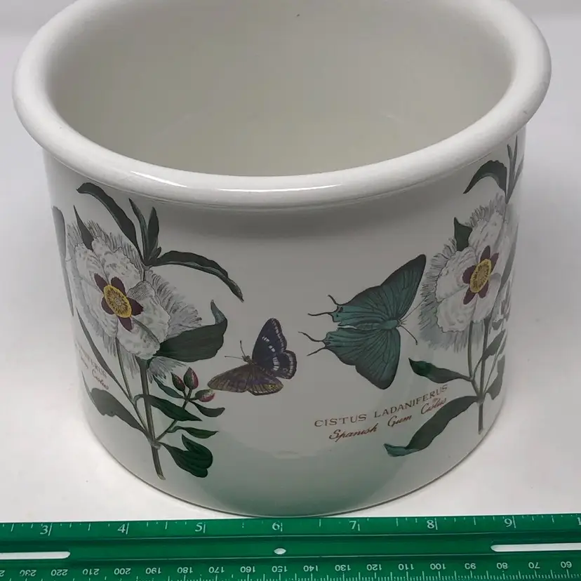 5" tall and 7" across utensil crock made in England. Beautiful collector's design by Portmeirion with white flowers and gorgeous butterflies. Age shows in crazing and some spots in the glaze as shown in photos