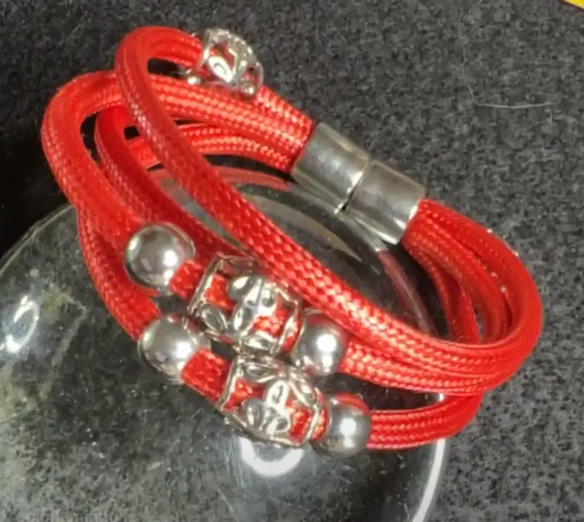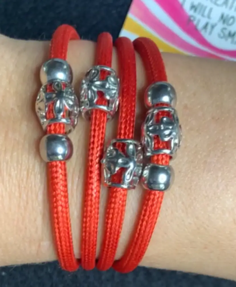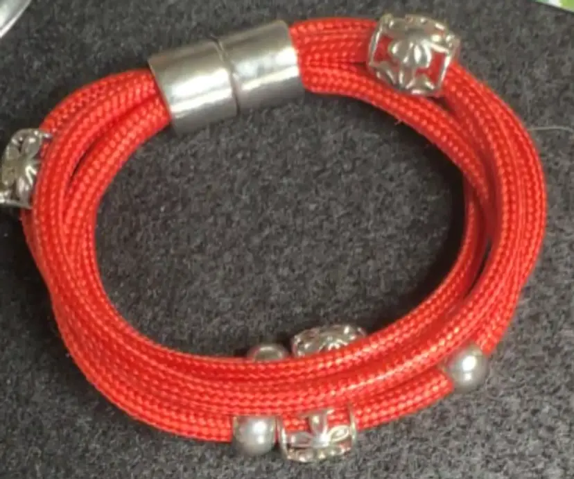 4 strand coral cotton cord bracelet with silver tone charms & strong silver tone magnet closure, 6.5", 1 oz
