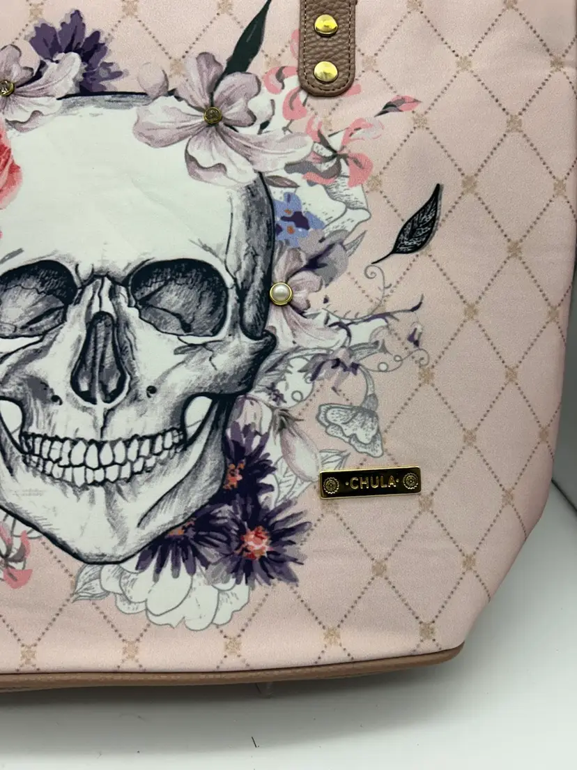 This pink sugar skull tote is perfect for computer/electronics bag for traveling . Also another perfect gift for Christmas . It measures approximately 17” wide and 13” tall. It also comes with a smaller tote.