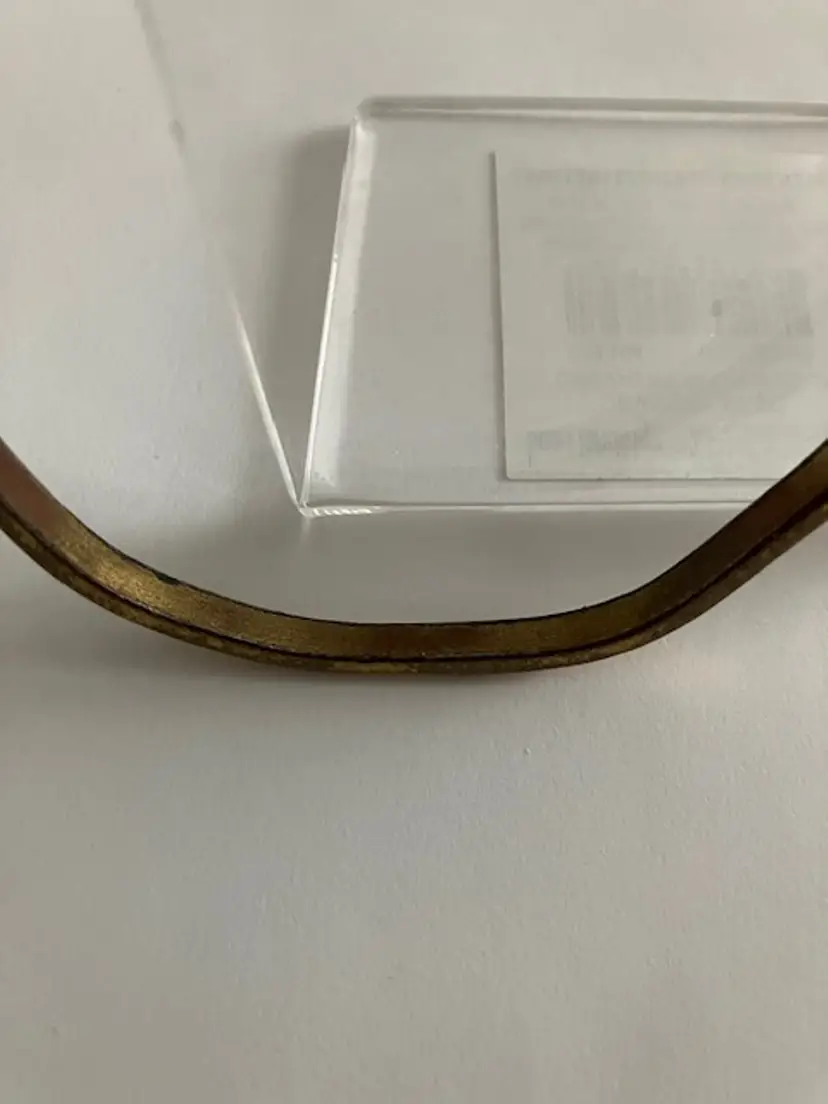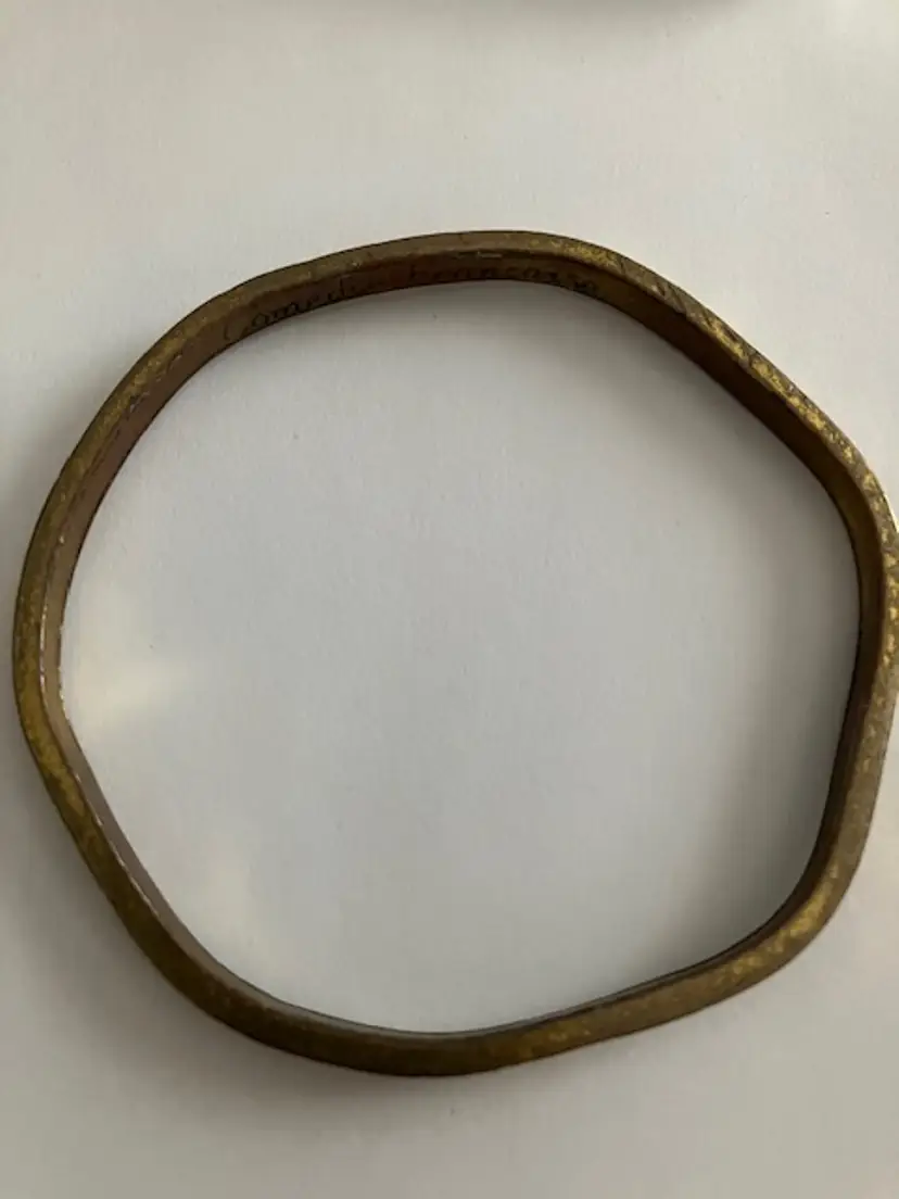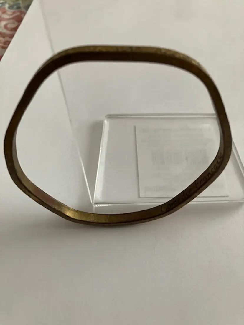 Brass bracelet engraved in French with poem from a Pierre Corneille play, Rodogune. "There are sympathizers whose sweet relationship brings souls together. There are secret knots." Measures 2 1/2". Good condition.