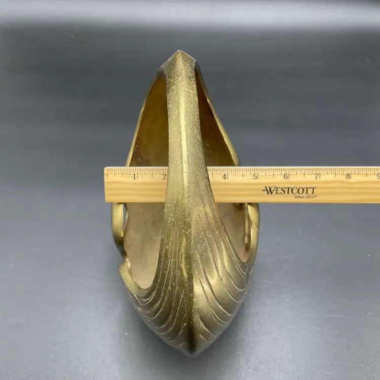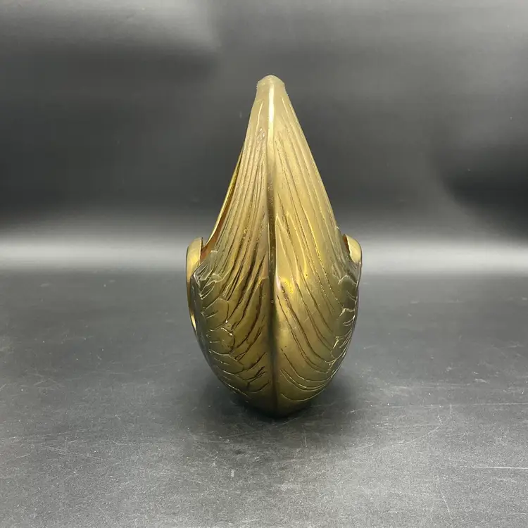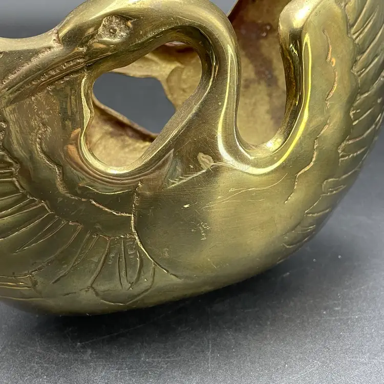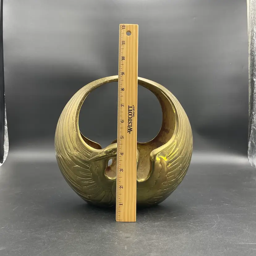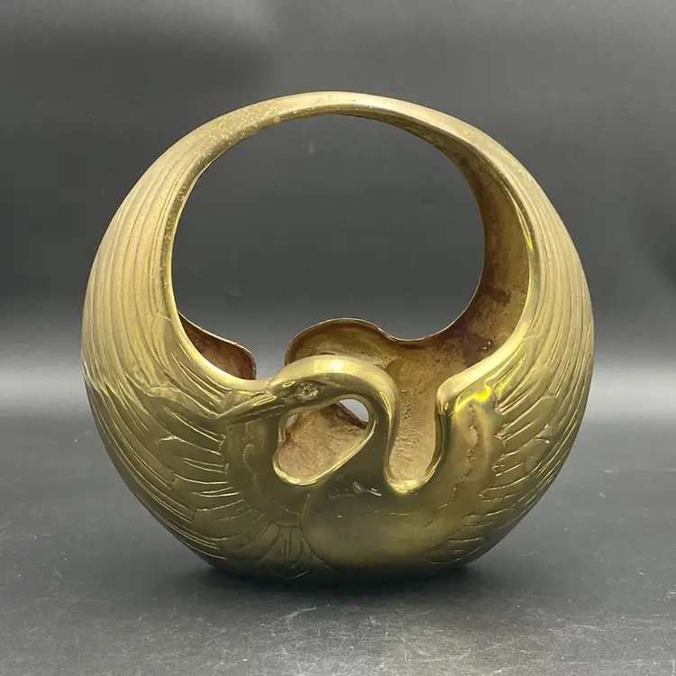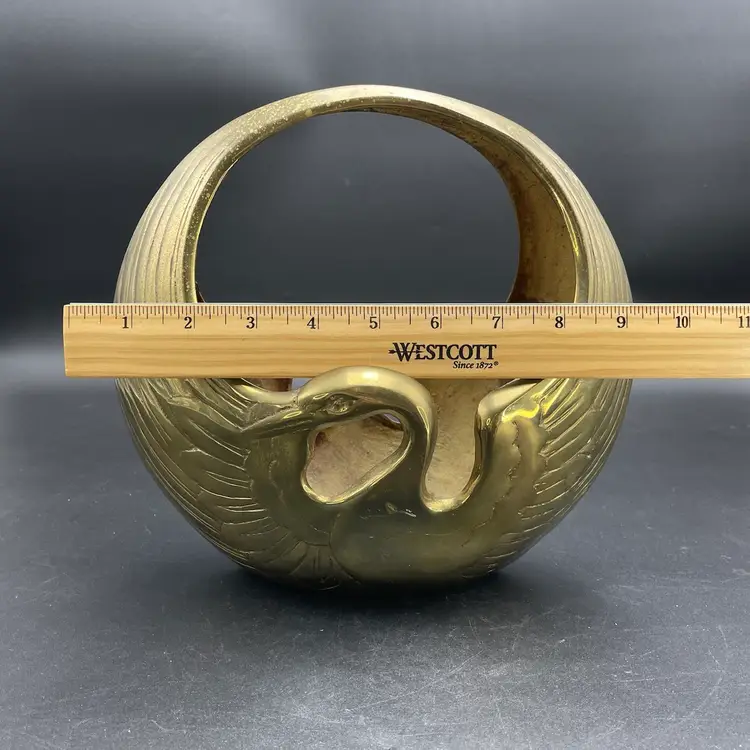 This is a vintage brass swan/crane planter basket. Made in Korea. Measures approximately 8.5" tall x 9" across x 4.5" wide. There are a couple of scratches due to age and use as shown in pictures. No dents.