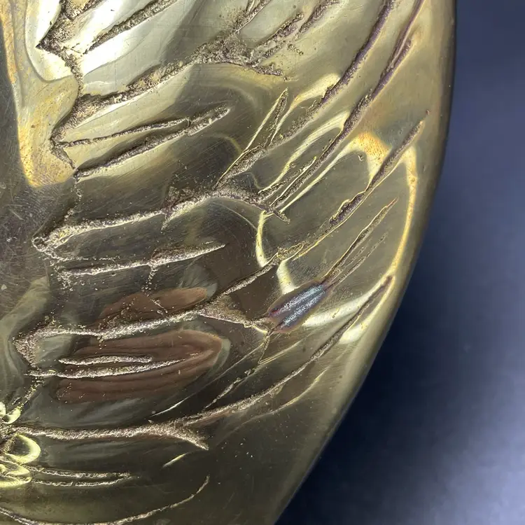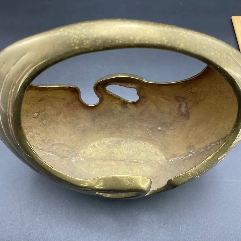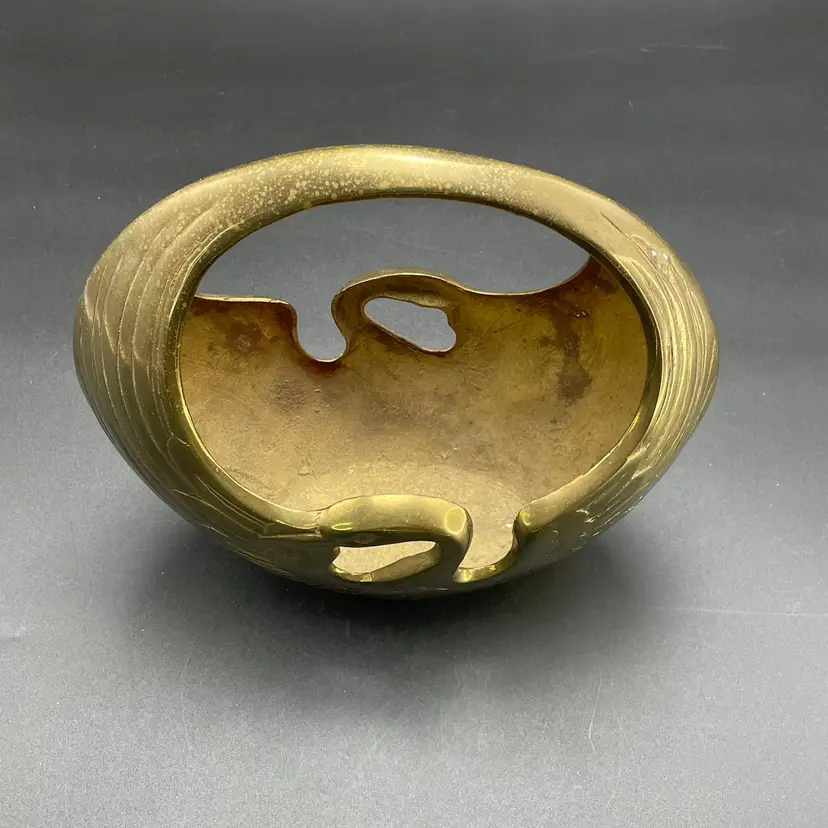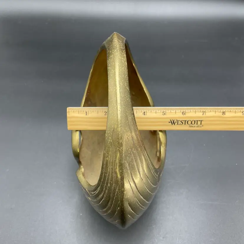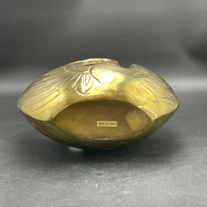 This is a vintage brass swan/crane planter basket. Made in Korea. Measures approximately 8.5" tall x 9" across x 4.5" wide. There are a couple of scratches due to age and use as shown in pictures. No dents.