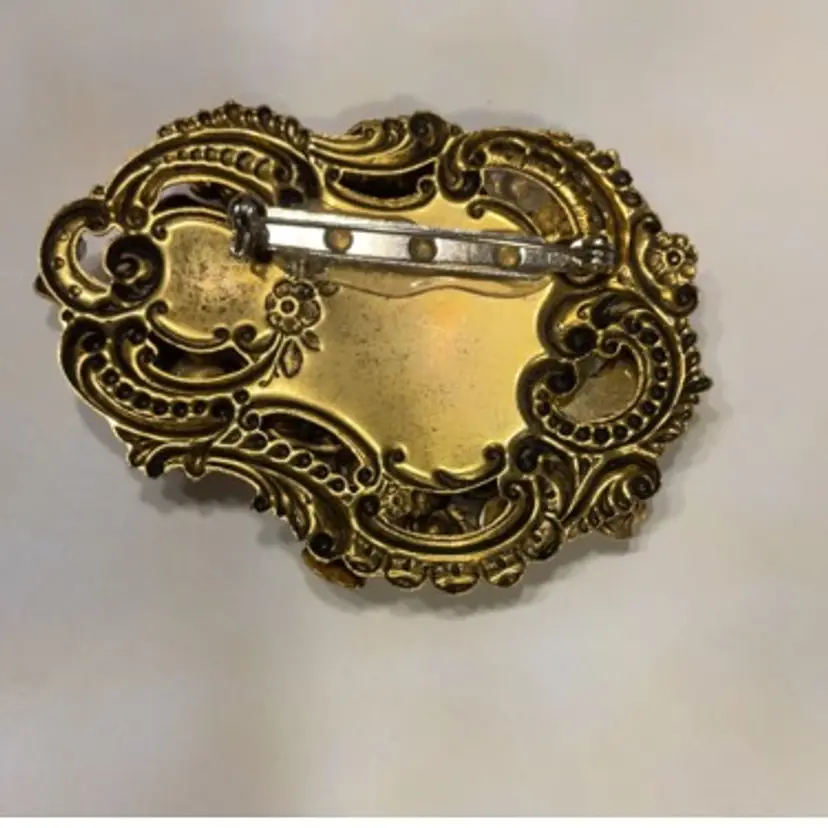 Measures 2 1/2”x2”. Filigree design on back. Front depicts cherubs, faux pearls, flowers.