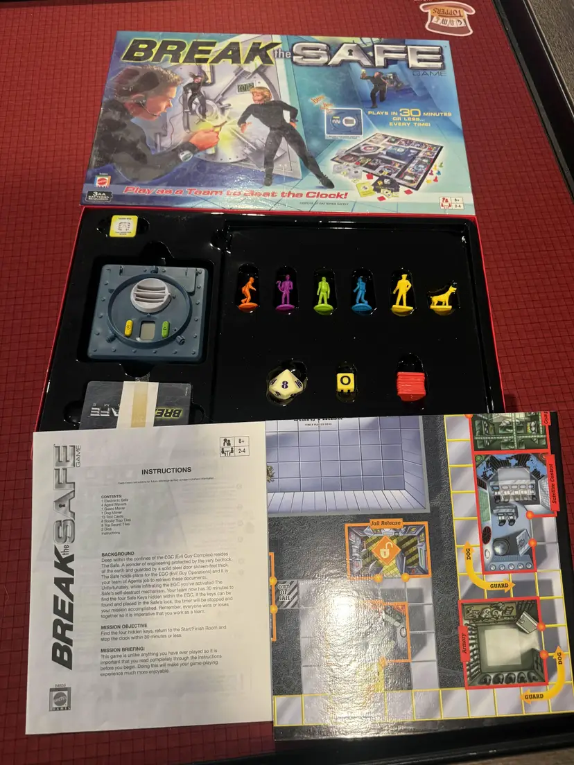 Players are spies trying to race against the clock that starts at 30min and ticks down to the game's end. The object is to get the 4 keys to open the safe and return to the start to stop the clock. The keys are found under booby traps that require a specific tool to disarm. There is also a guard and guard dog that will send you to jail if they catch you.