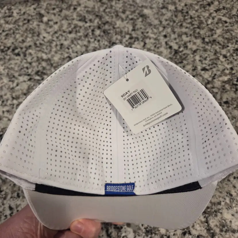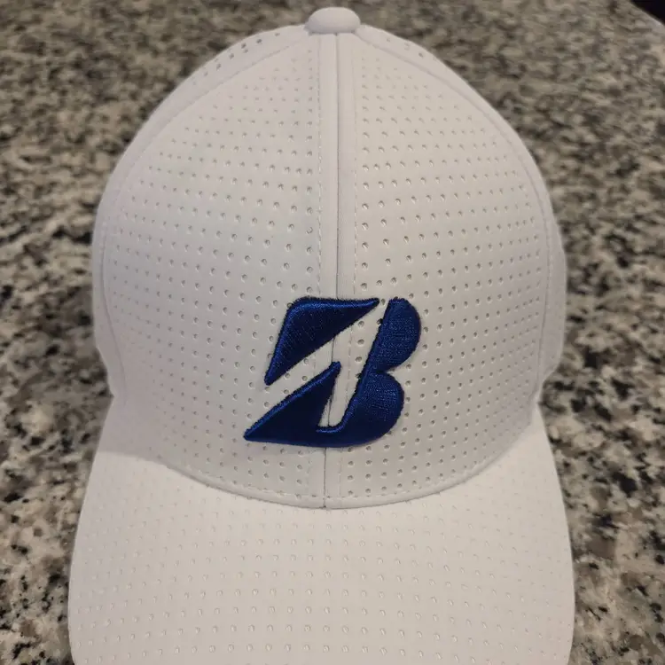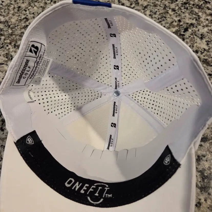This listing is for a brand new Bridgestone Tour B One Fit fitted hat white with navy embroidery in color. This hat ranges in medium to xl fit.