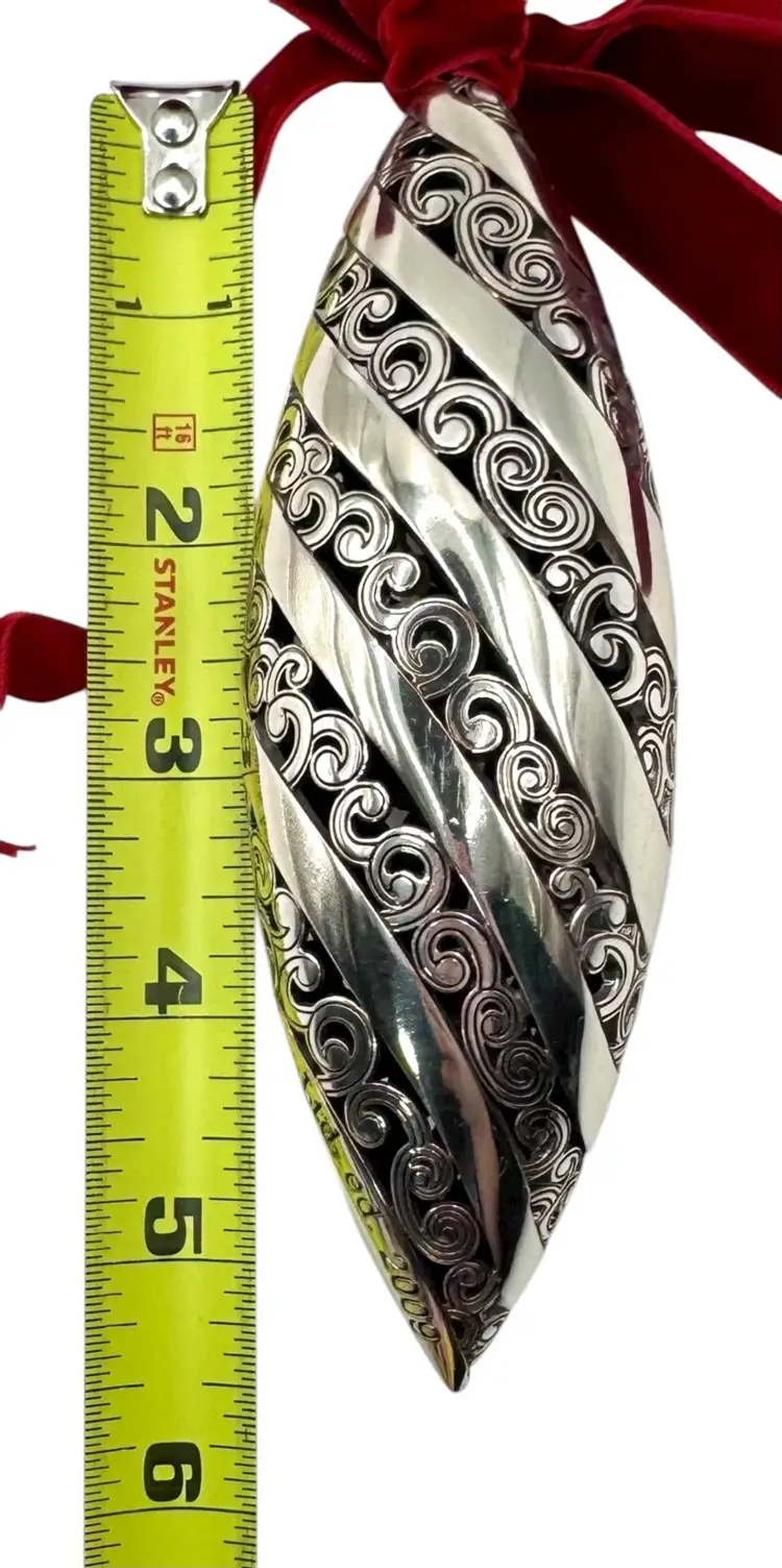 Silver plated ornament by Brighton. It has a scroll pattern, and the phrase ‘Tis the Season’ at the bottom.