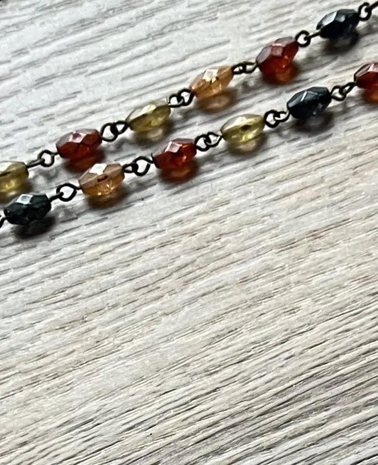 A beaded necklace with a 1 3/4 inch round pendant. All beads are plastic. I was surprised as you have to feel it to know for sure. The beads in the chain have an opaque look. 23 inches long.