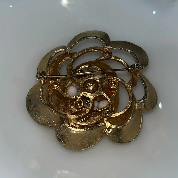 21. Brushed Gold Tone And White Bead Flower Brooch