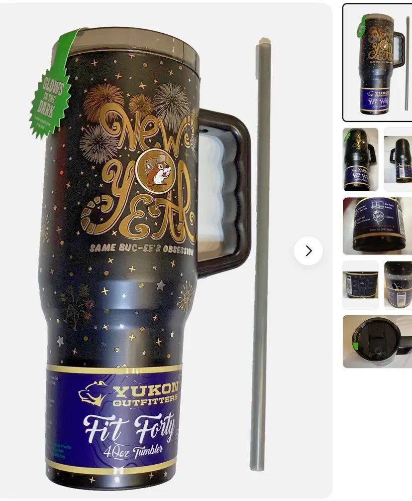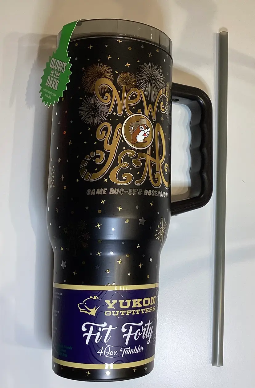 The Buc-ee's New Years Tumbler is a limited edition stainless steel tumbler featuring a 40oz capacity and a sleek black design. This three-piece set includes a tumbler with a lid and a straw, making it perfect for enjoying hot beverages during the New Year's celebrations or any time of year. The tumbler is adorned with the Bucee Beaver character, representing the Buc-ee's brand, and is suitable for both teens, boys, and adults. With its insulated design, this tumbler is ideal for keeping your drinks at the perfect temperature while on-the-go.