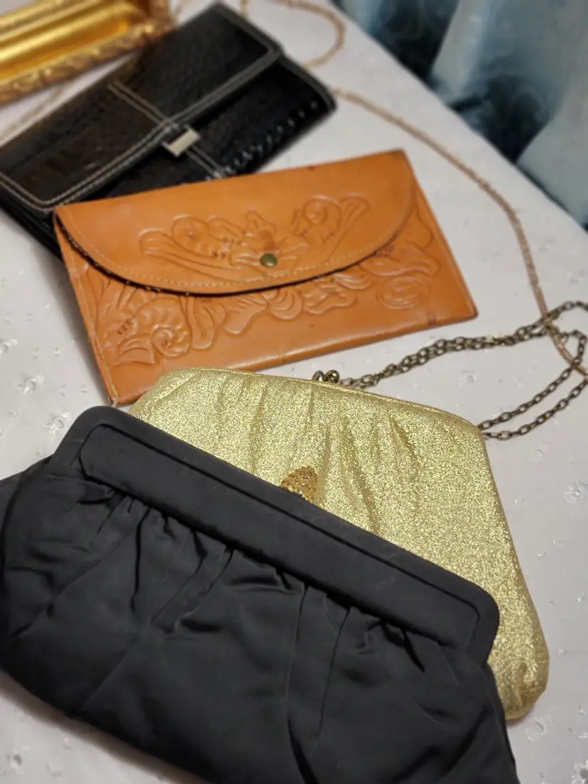 One gold shimmer with double chain One black with acorn clasp One hand made leather purse wallet And a liz claiborne wallet in excellent condition
