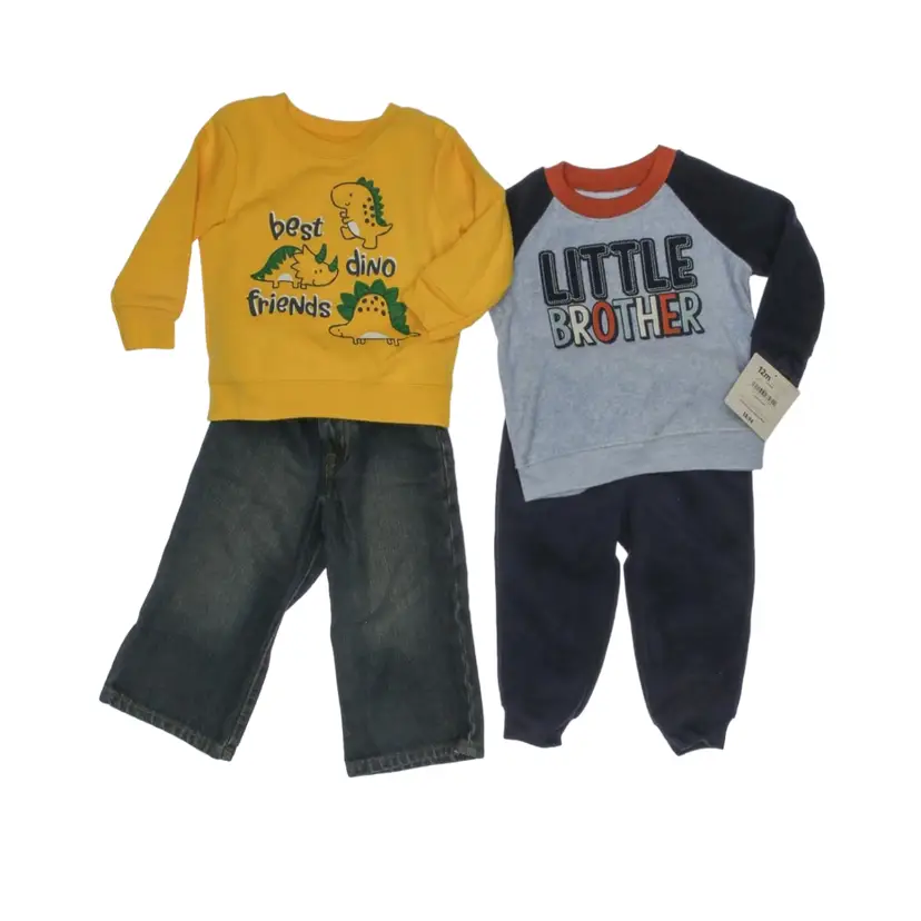 Blue/Yellow/Brown Mixed NWT & Preloved NWT Child of Mine Sweater & Fleece Pants, NWOT Garanimals Dino Sweatshirt, Preloved Children's Place 12-18 bootcut jeans