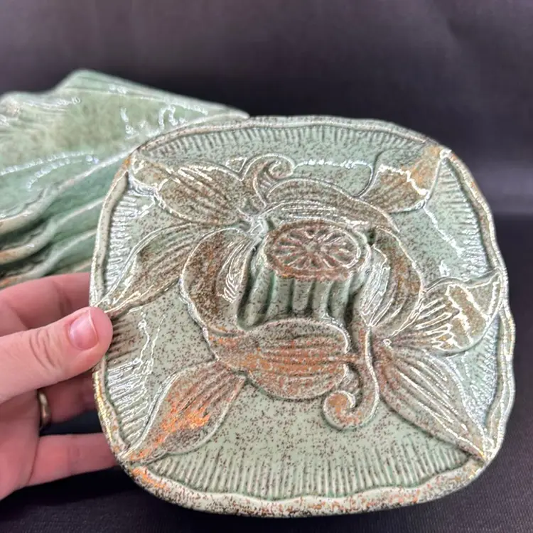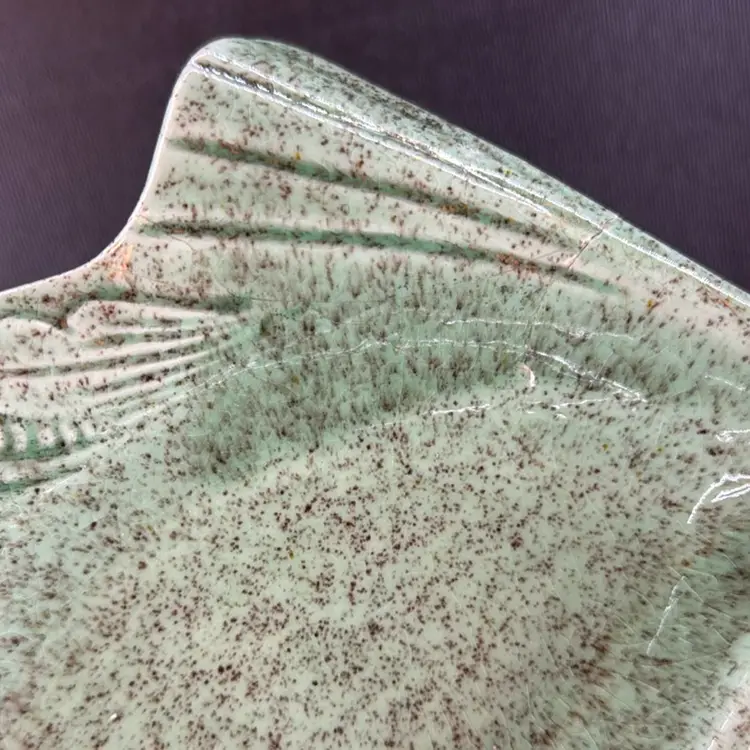 One of the surrounding serving dishes has been repaired on the corner. Otherwise appears to be in great condition. Does have some crazing.