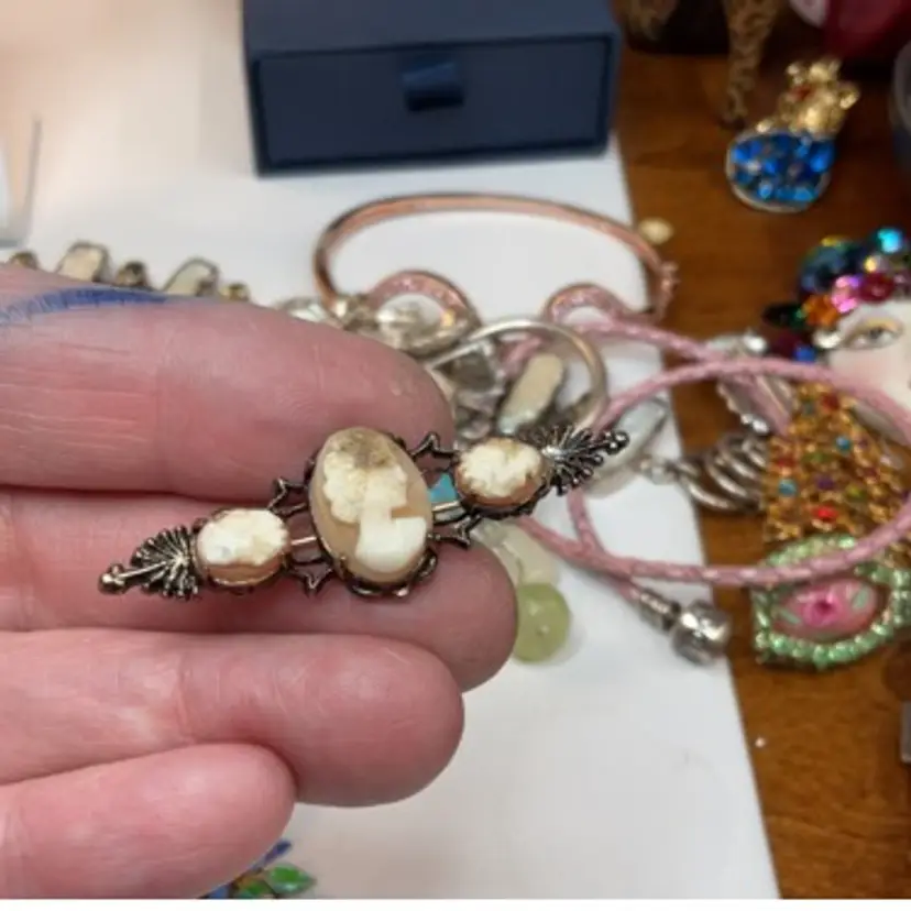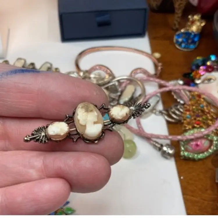 Welcome to our shop of mostly pre-owned and sometimes new jewelry treasures, trinket boxes, compacts - sometimes art and glass. Please follow us so you're in the know when we go live or add new items. Our curated beauties include a large selection of vintage pieces as well as many contemporary items. We also craft and design our own fun costume (and some fine) jewelry pieces, bookmarks, digital art and more in our small studio.