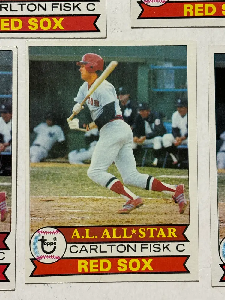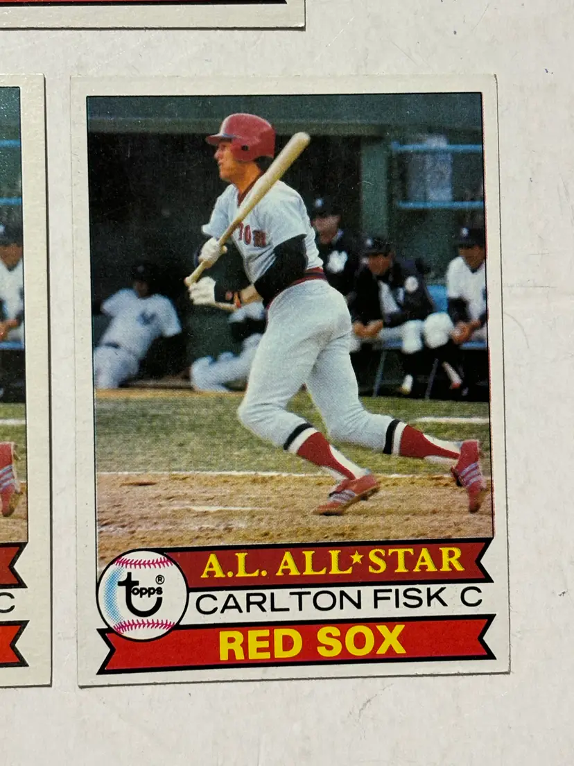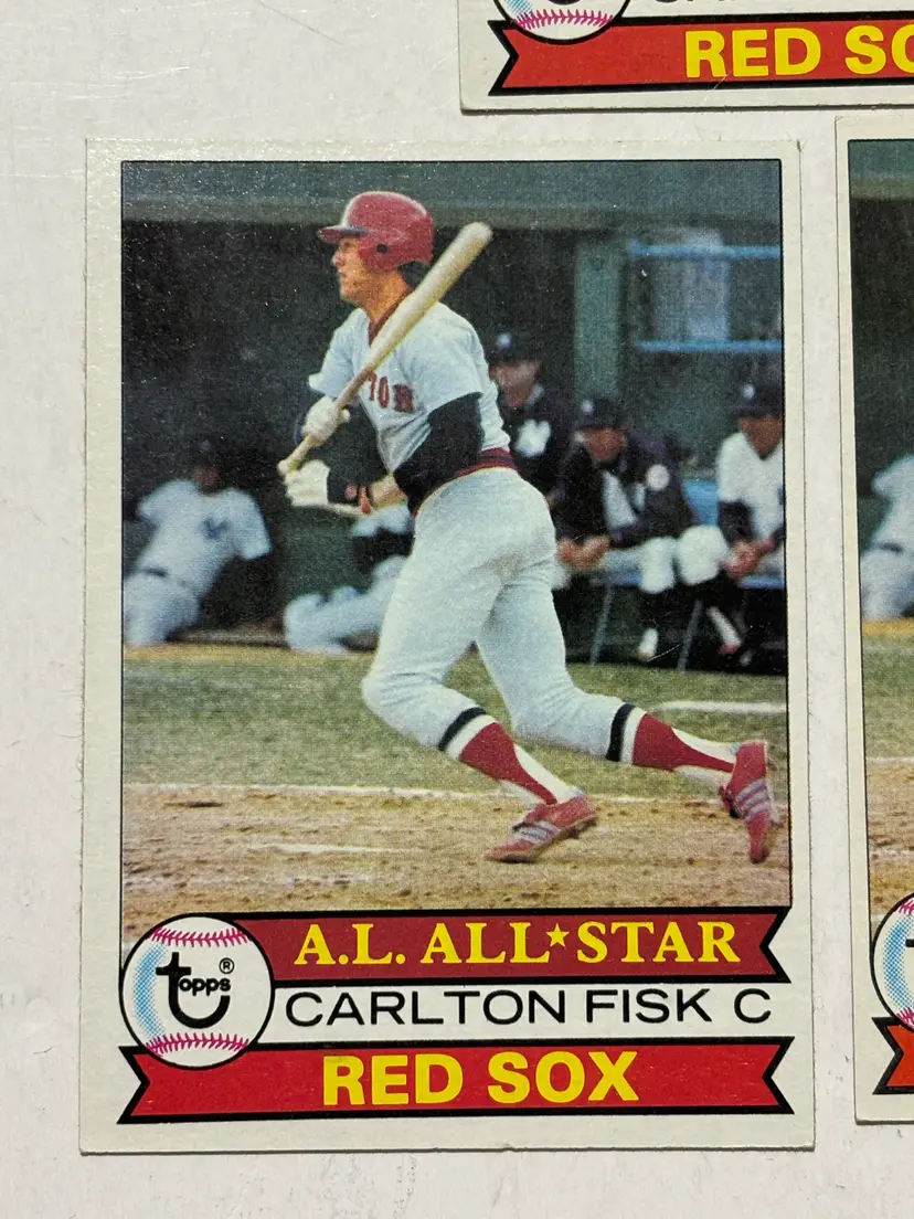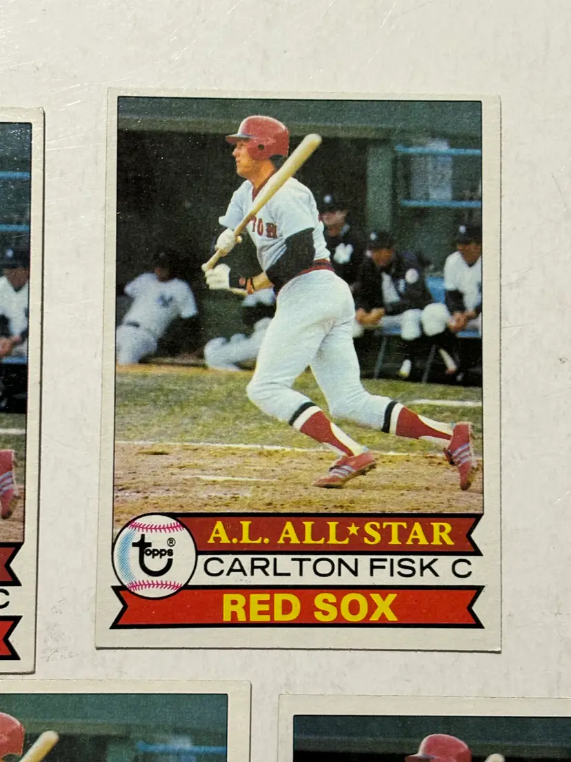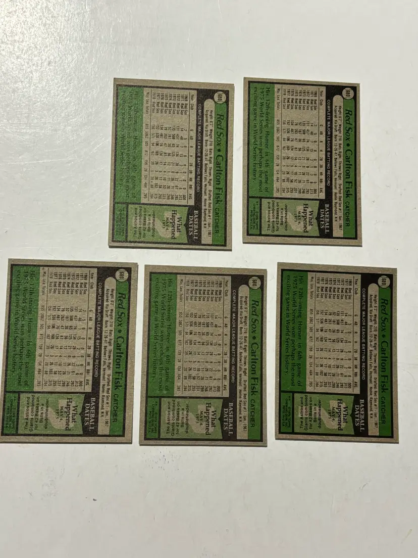 This lot is for five 1979 Topps baseball cards of Carlton Fisk. Cards are VG- EX. One card has slight crease as shown in photograph. Corners and edge wear shown in photos.