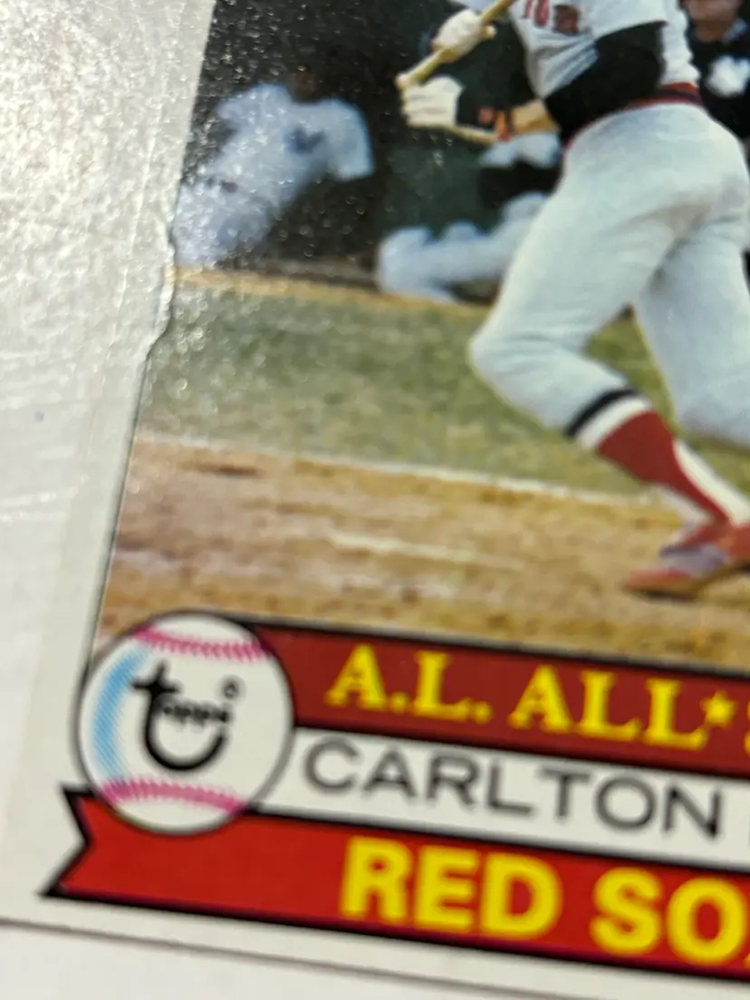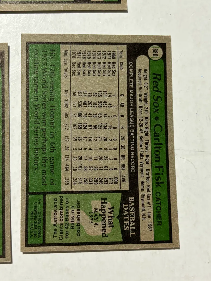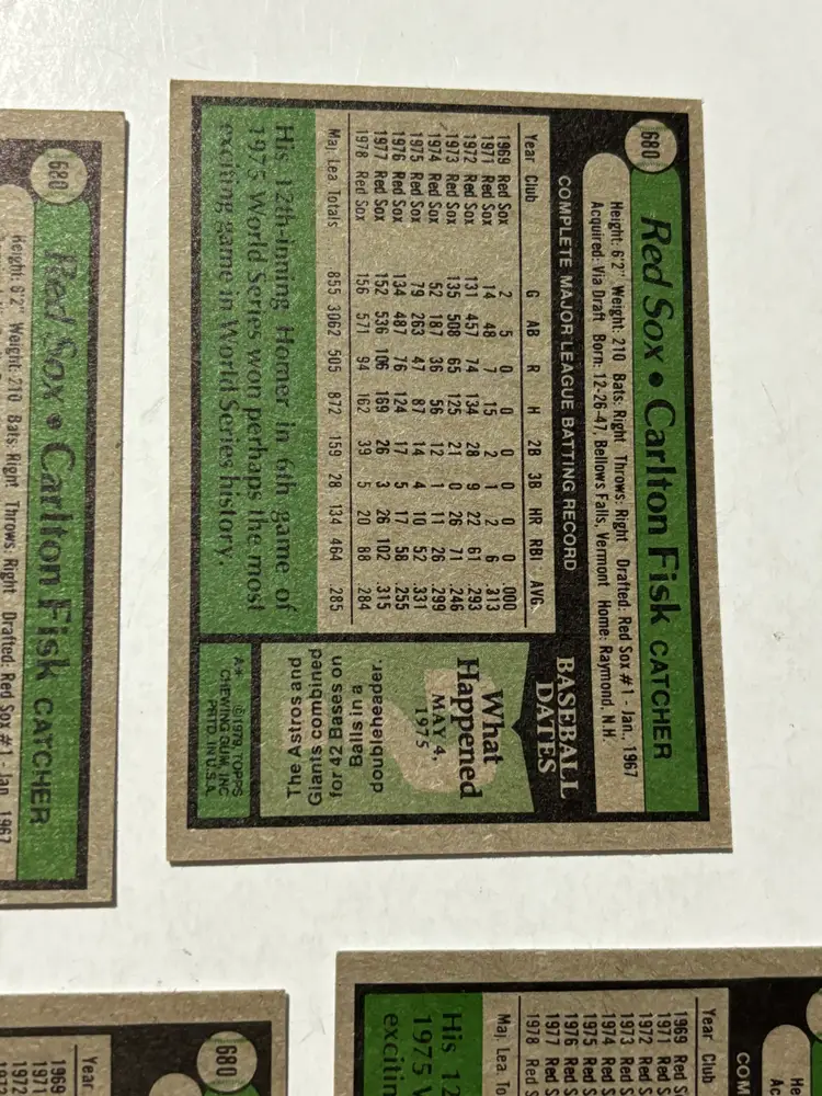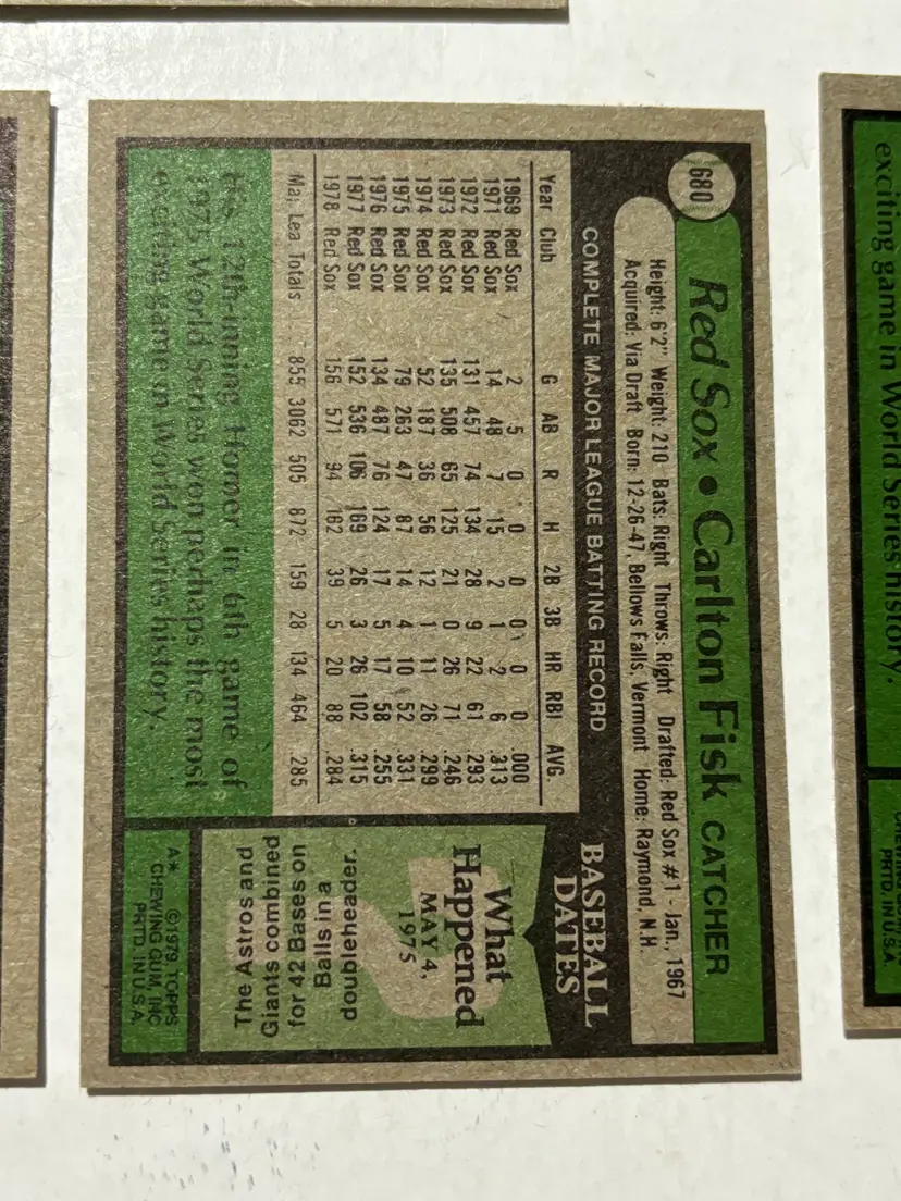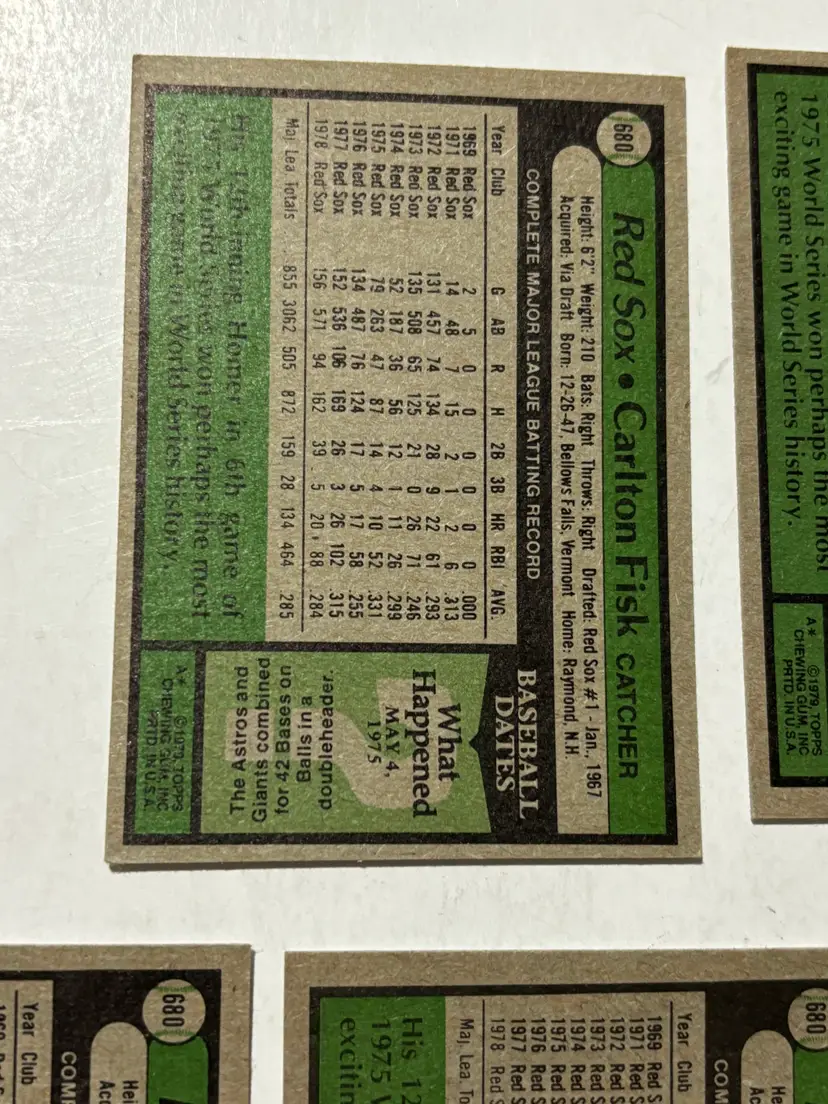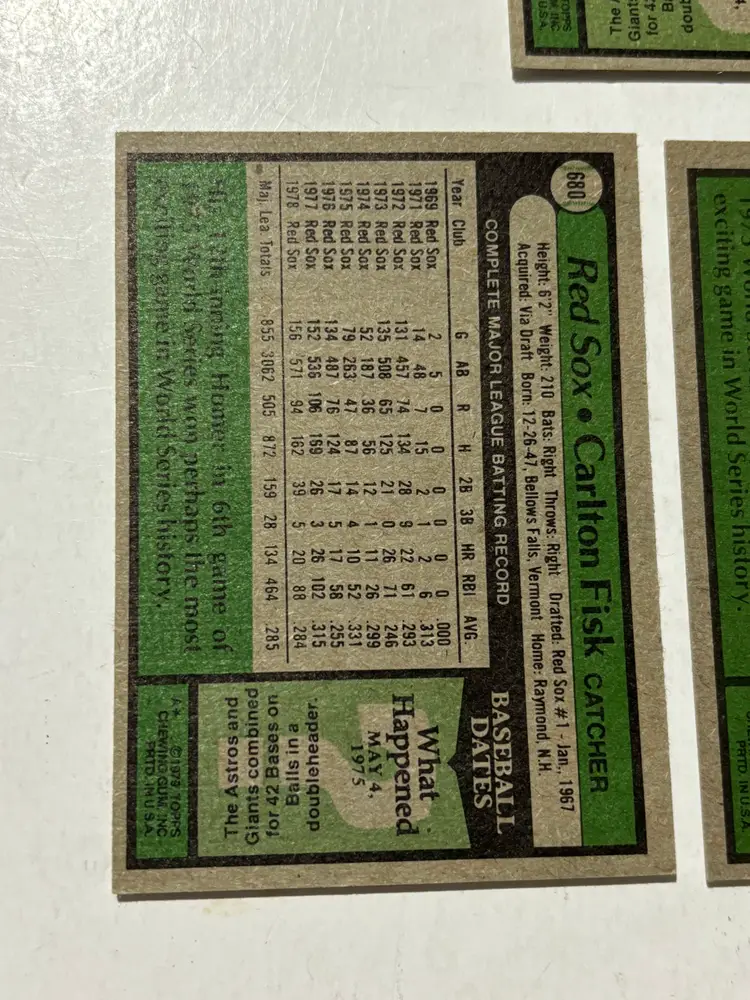 This lot is for five 1979 Topps baseball cards of Carlton Fisk. Cards are VG- EX. One card has slight crease as shown in photograph. Corners and edge wear shown in photos.
