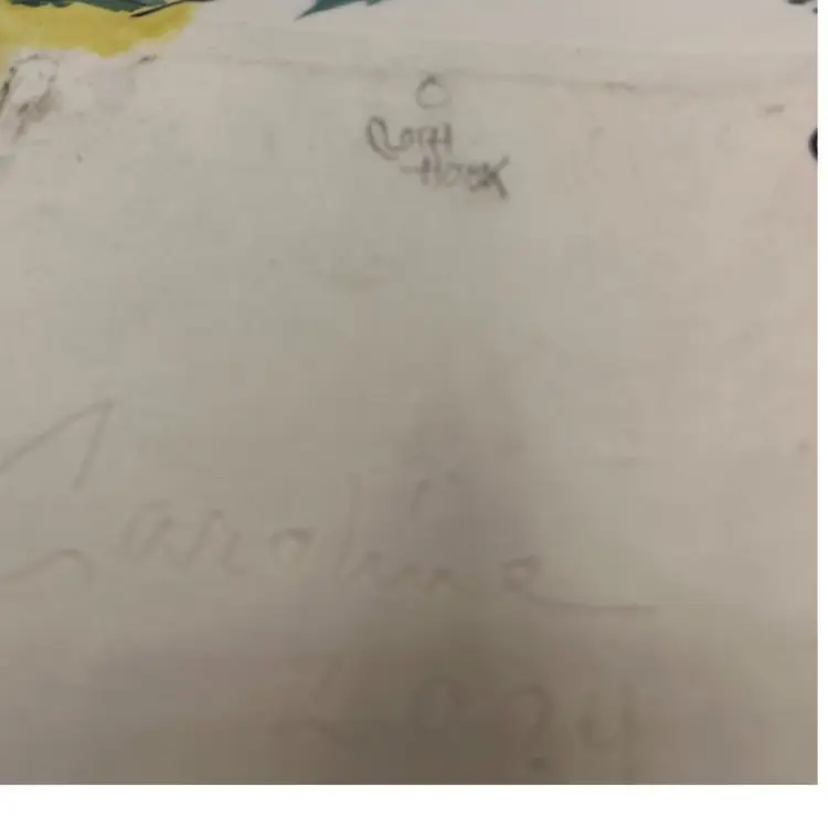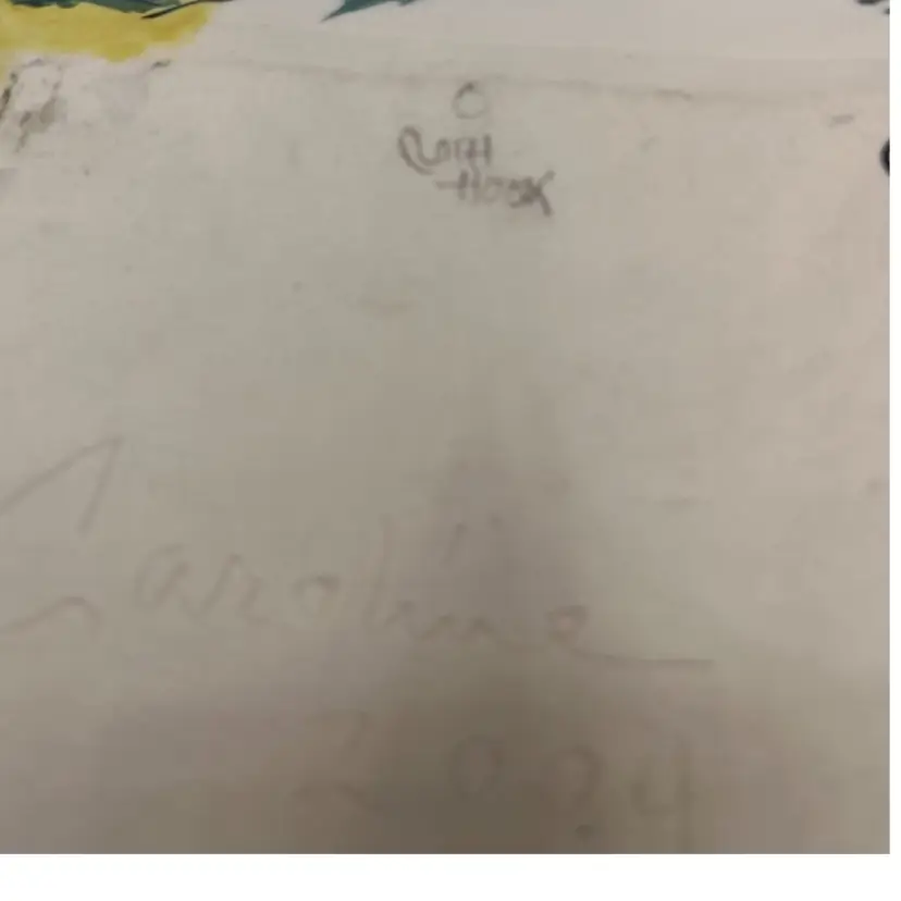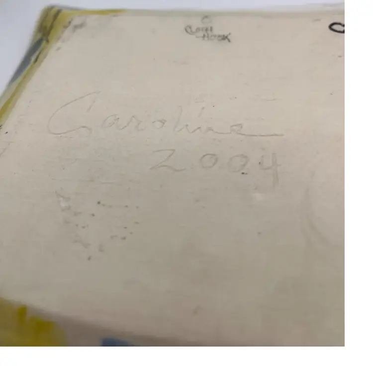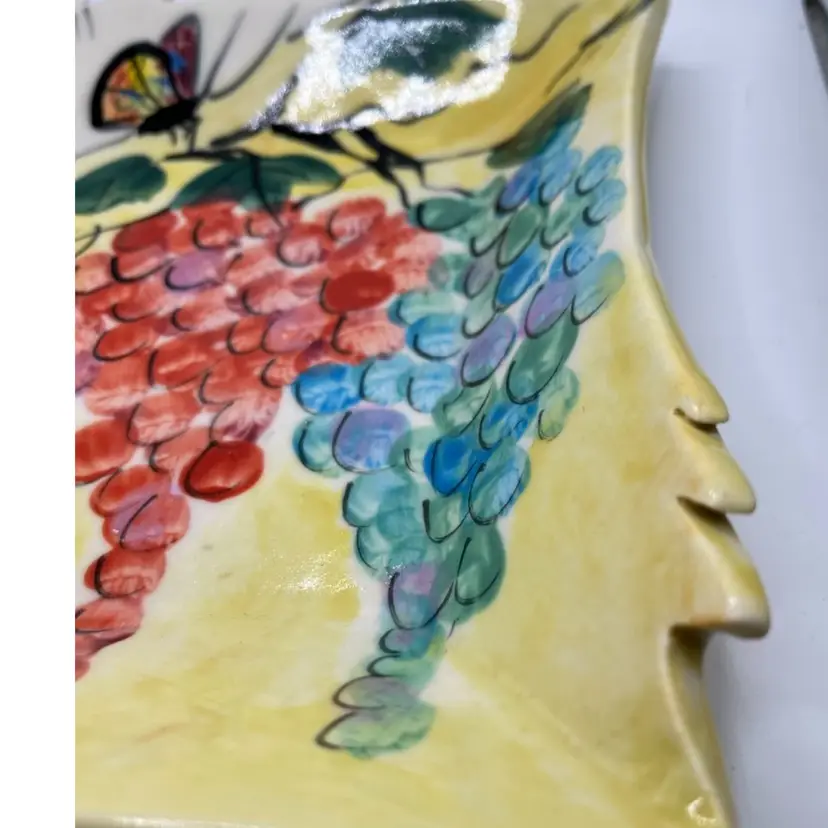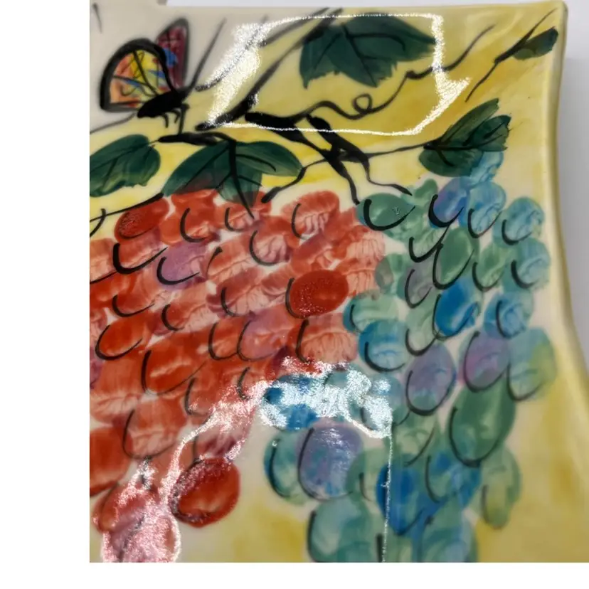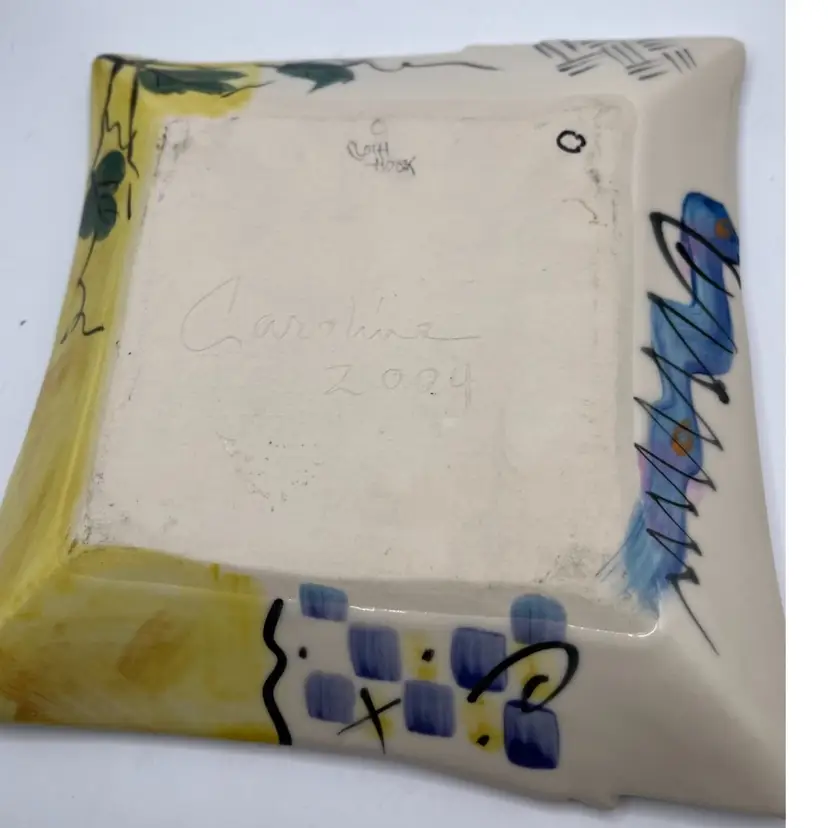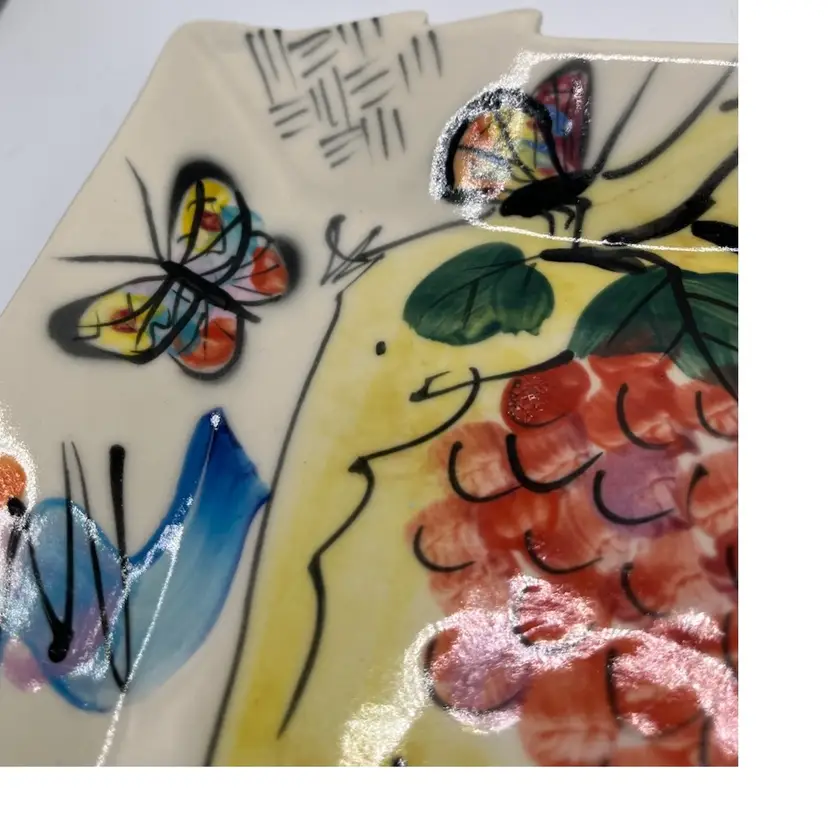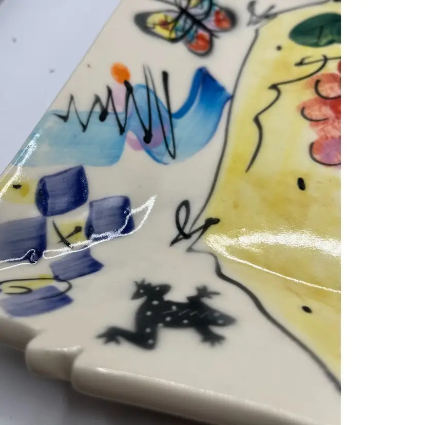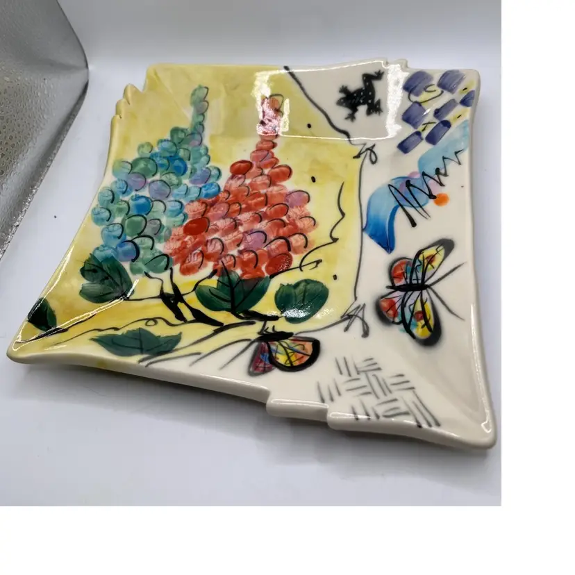 Rare Caroline Koons hand painted plate . Grapes butterfly, frog and cat graphic motif approximate 7x6 signed 2004 in bright colors
