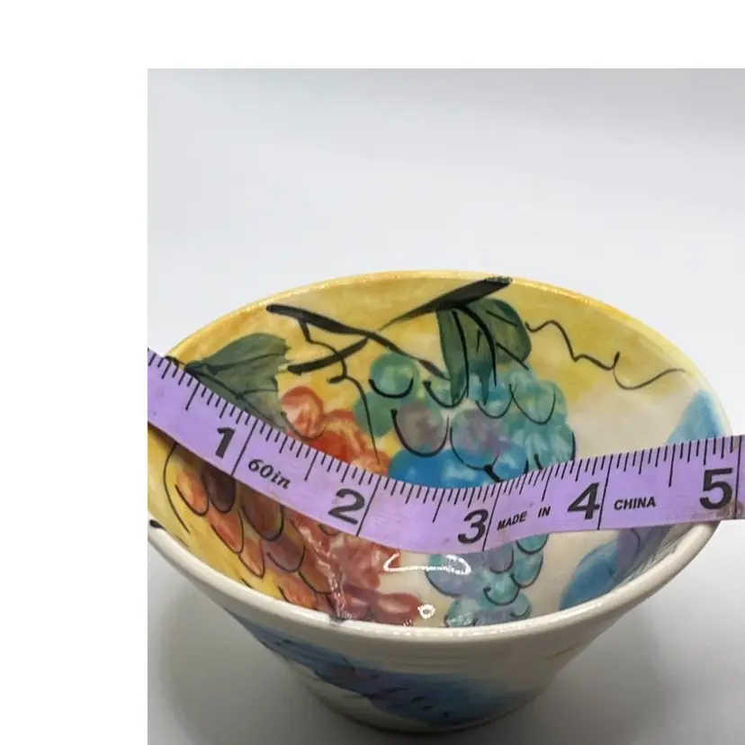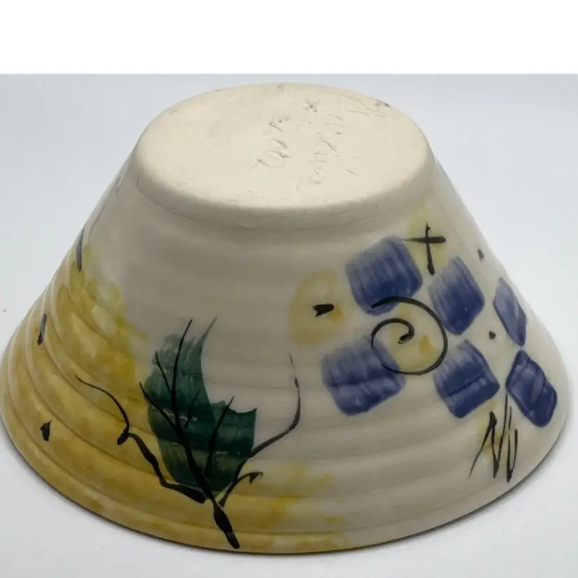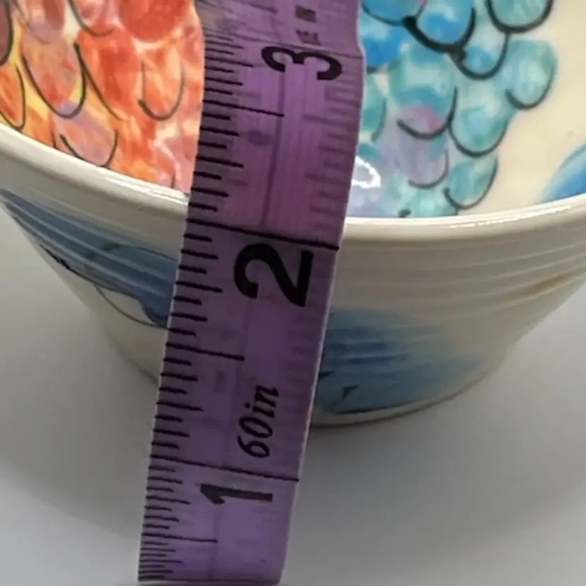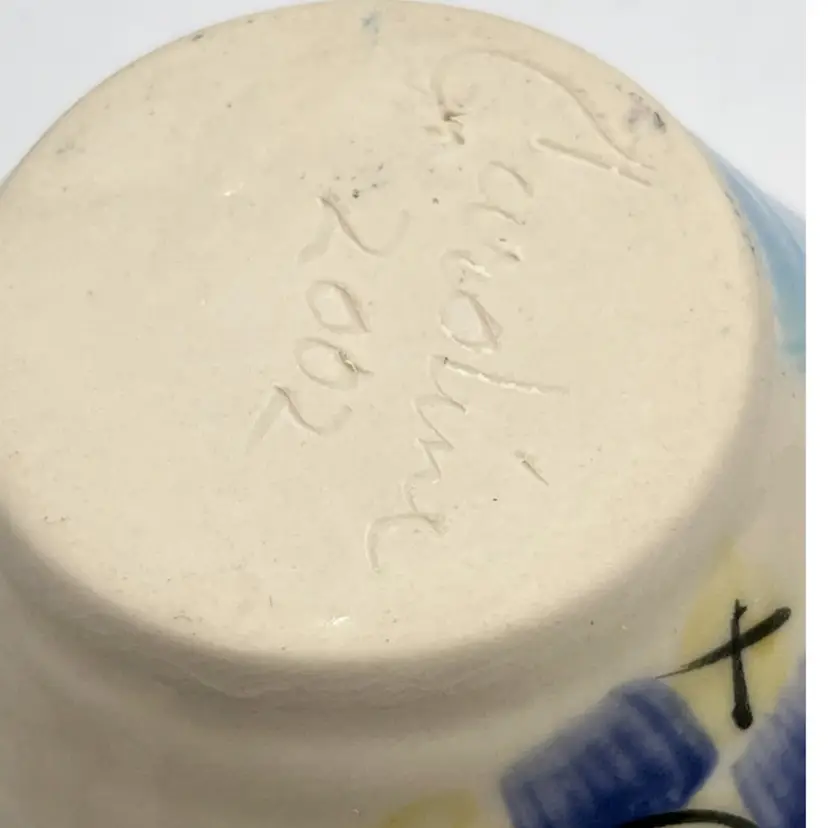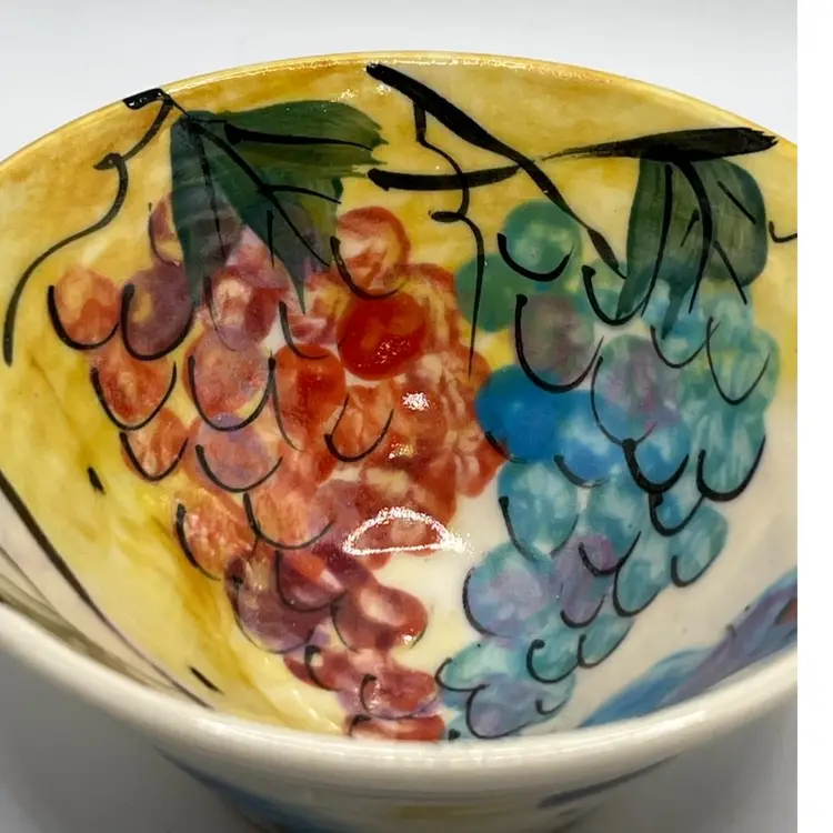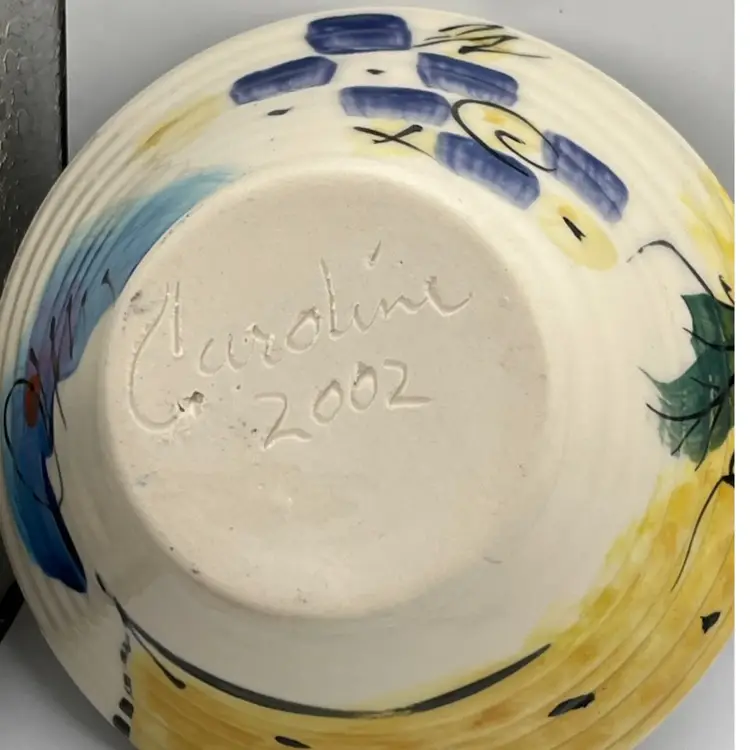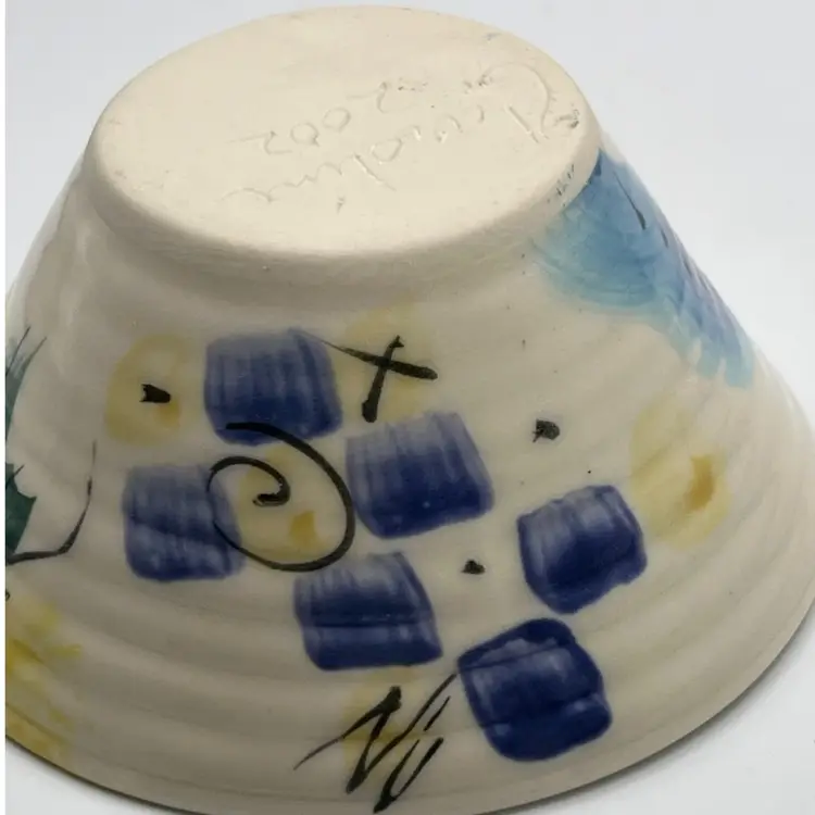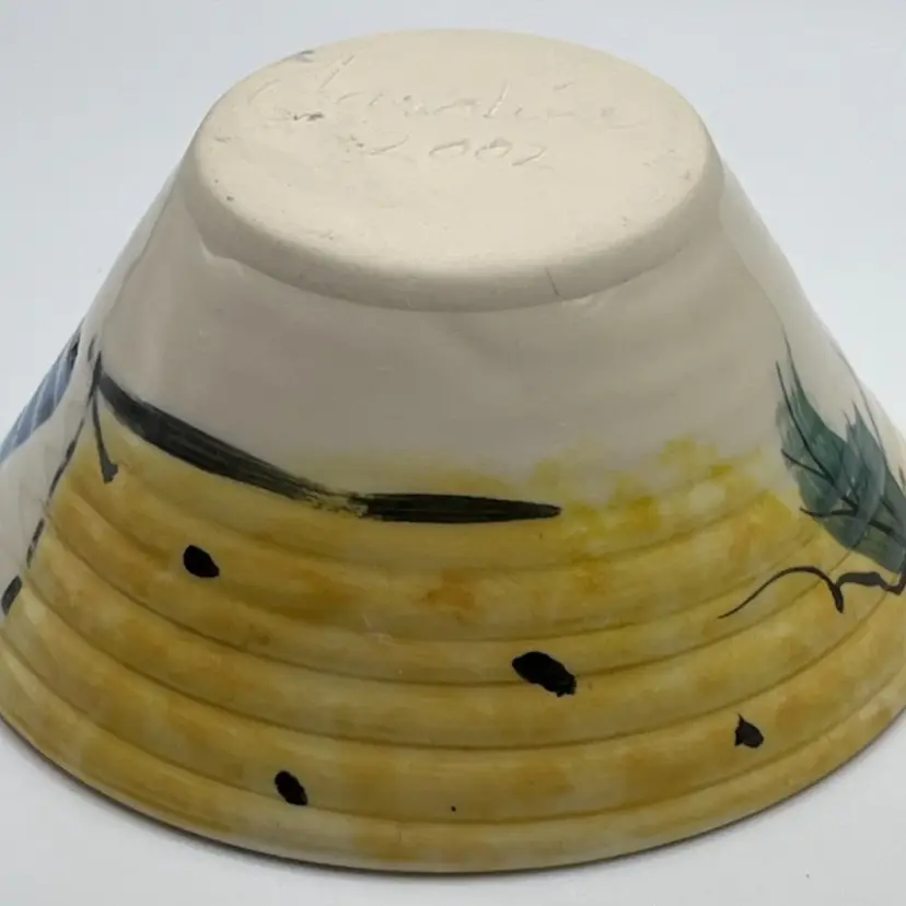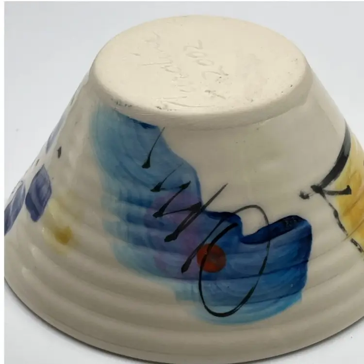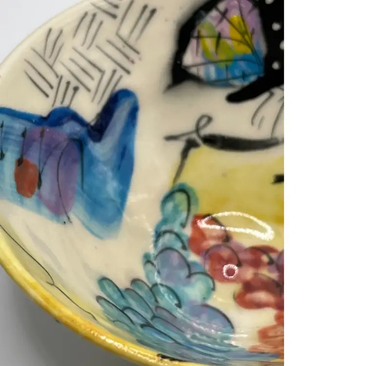 A Rare piece of Caroline Koons pottery, known for its hand-painted, colorful, and abstract designs. The bowl, likely crafted from porcelain or ceramic, features a vibrant butterfly, stylized grapes, and abstract shapes. Koons often incorporates gold leaf or 22K gold accents to enhance the visual richness of her pieces. These artworks are collected by art enthusiasts and those who appreciate unique, handmade pottery. 5x2 in EUC