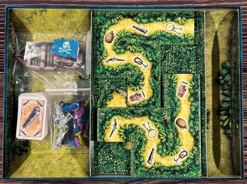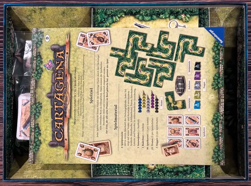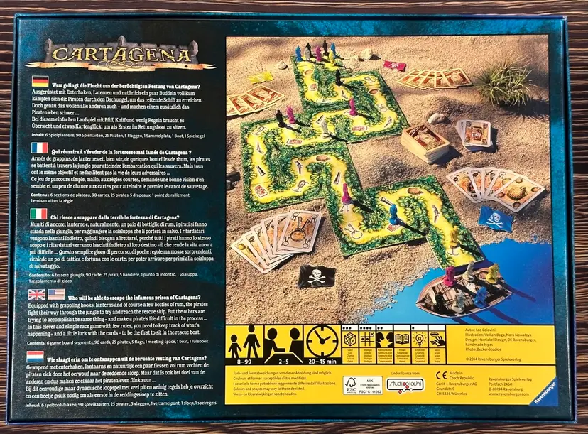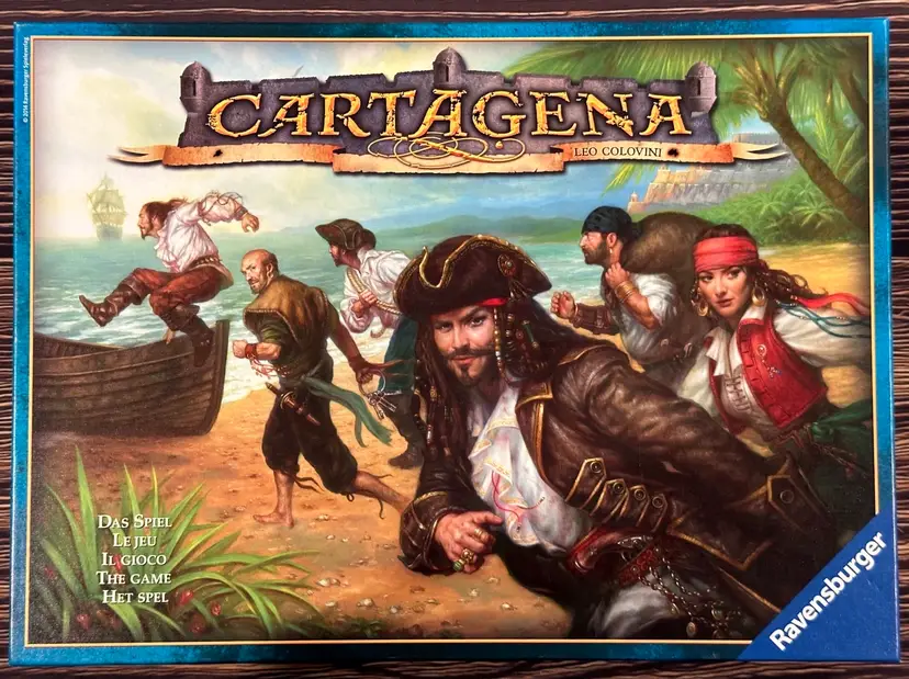 Cartagena takes as its theme the famous 1672 pirate-led jailbreak from the fortress of Cartagena. Each player has a group of six pirates, and you want to be the first to have all six escape through the tortuous underground passage that connects the fortress to the port, where a sloop is waiting for them.