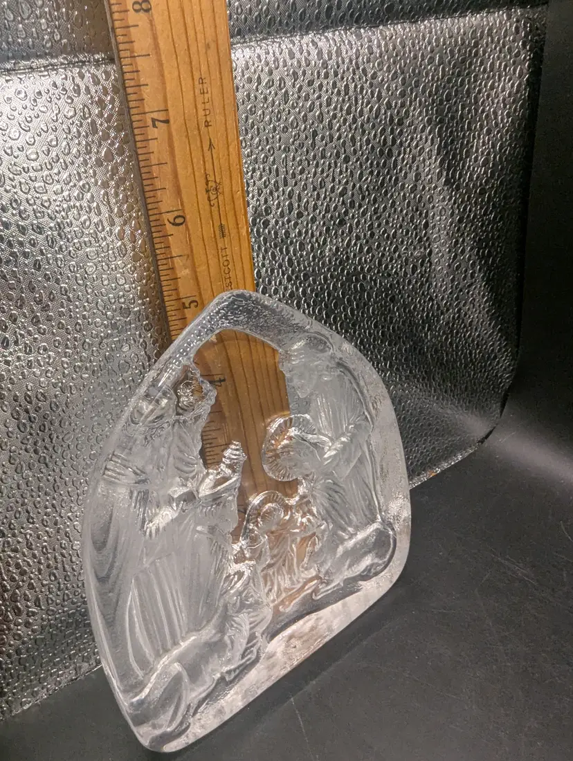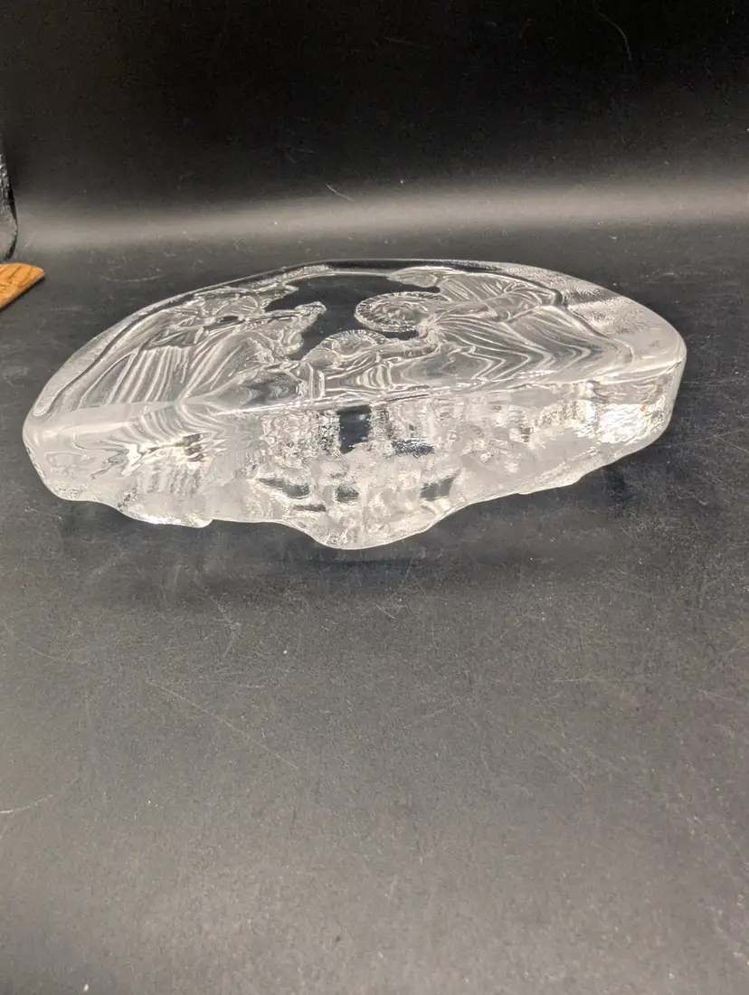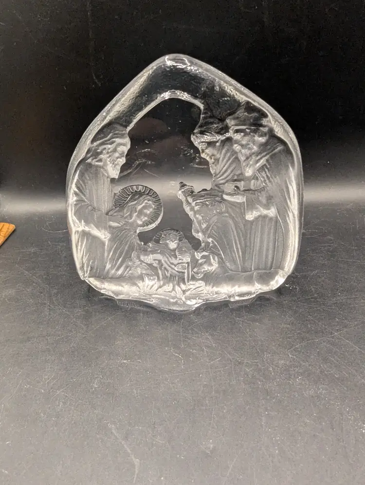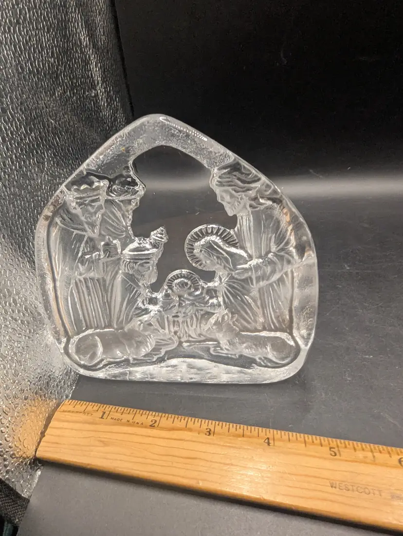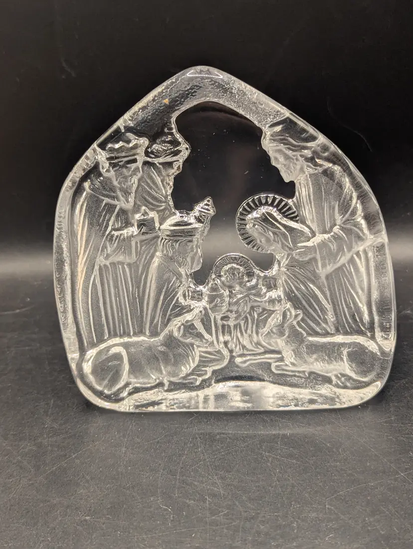 This is a lovely Carved Etched Crystal Religious Nativity Scene Christmas Sculpture Paperweight. No chips or cracks. Please see all pictures for condition and measurements.