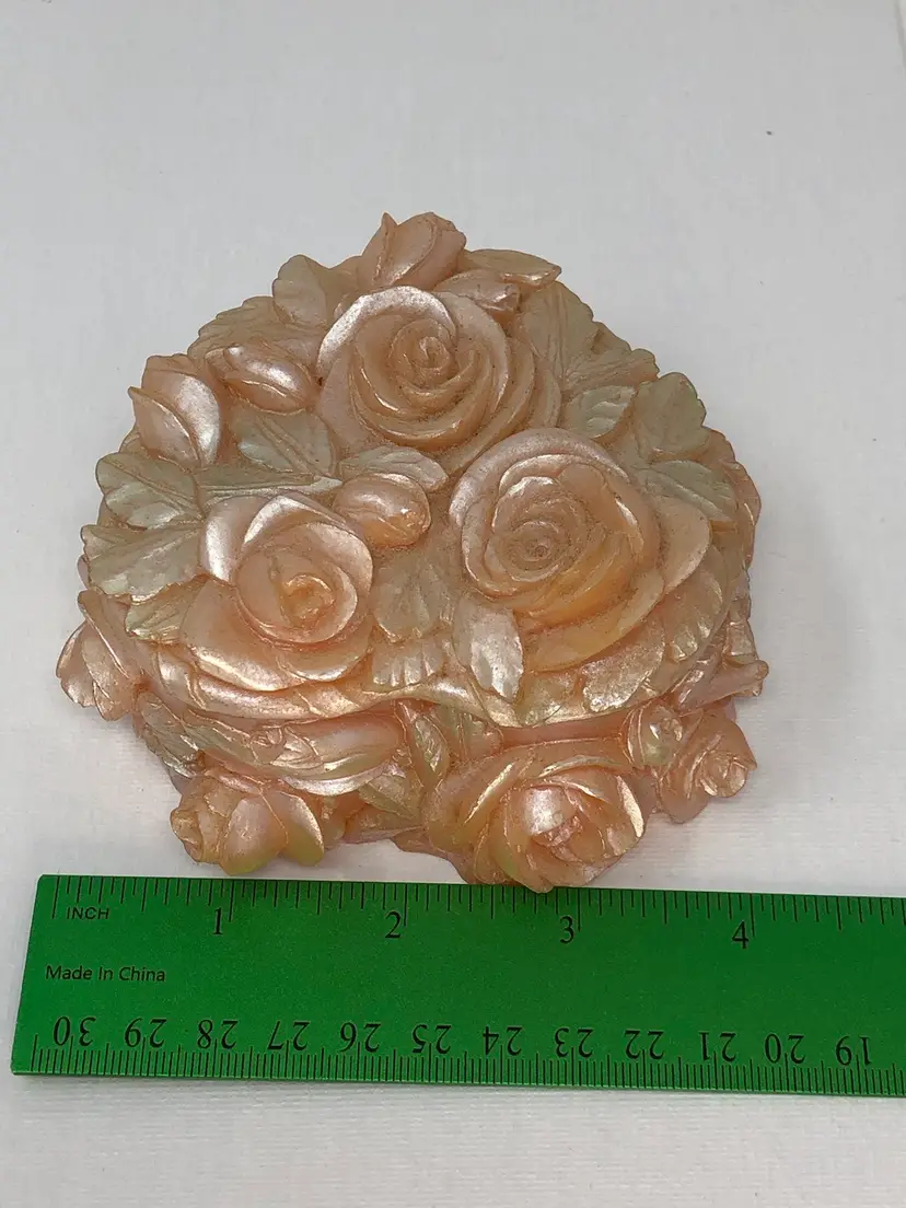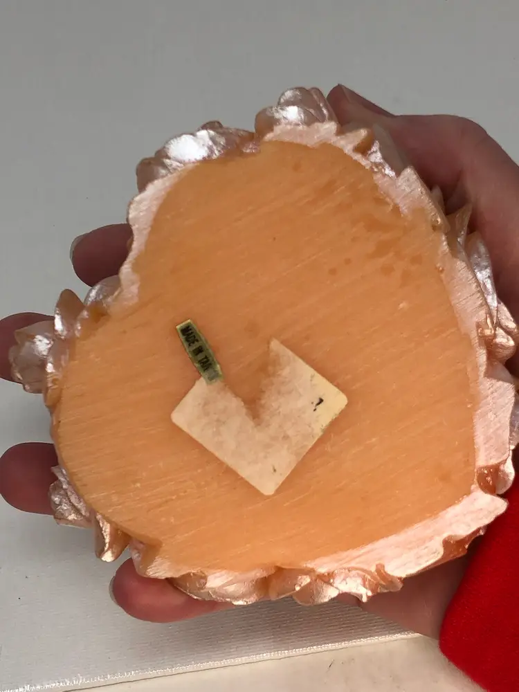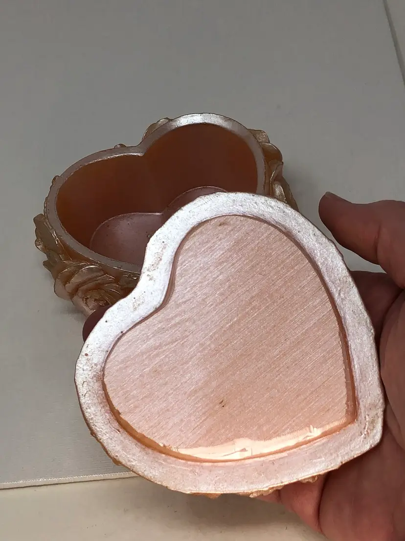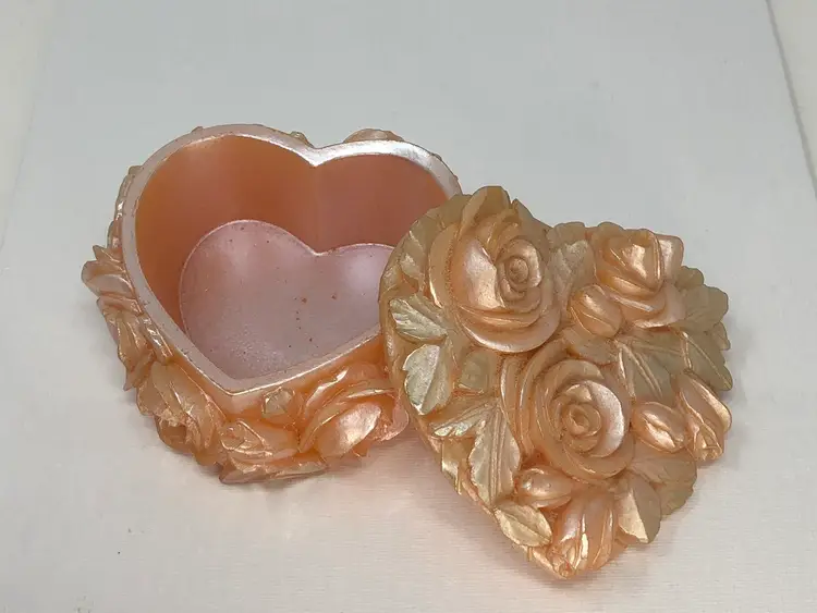 3 1/2" heart shaped trinket box covered in roses. Box with lid made in Taiwan. No chips or cracks