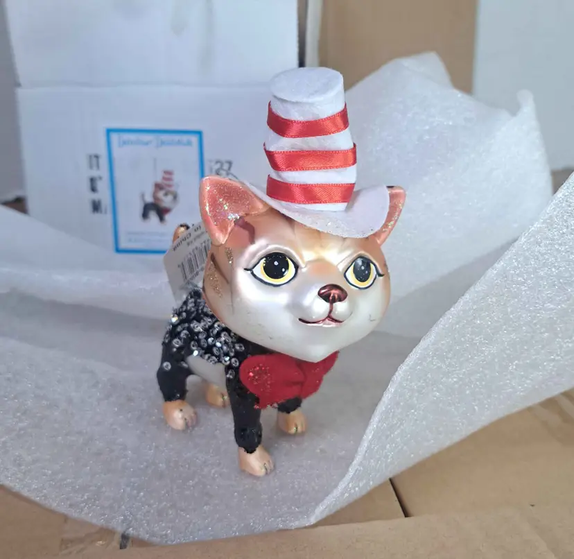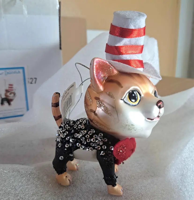 1 case of 24 December Diamonds Cat in the Hat 5.5-inch glass ornaments.