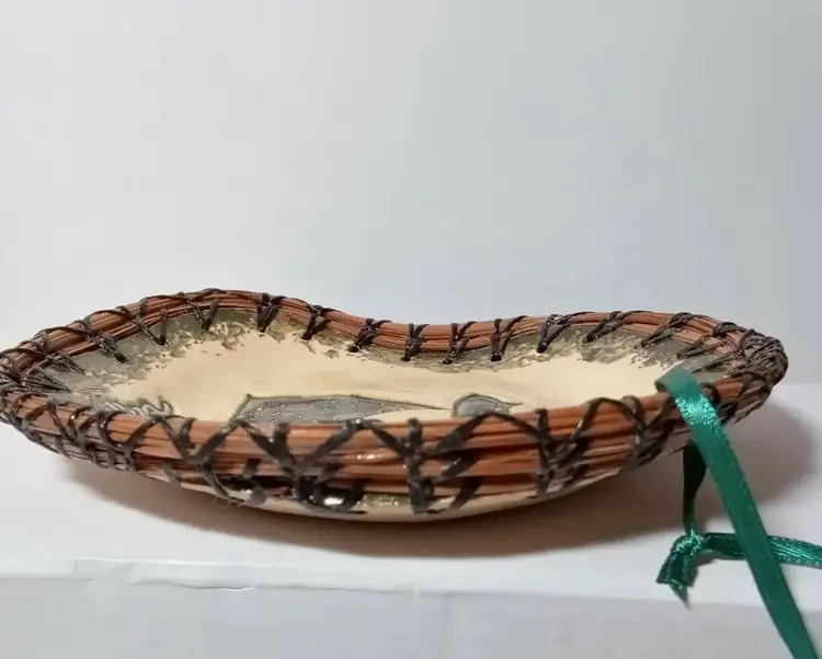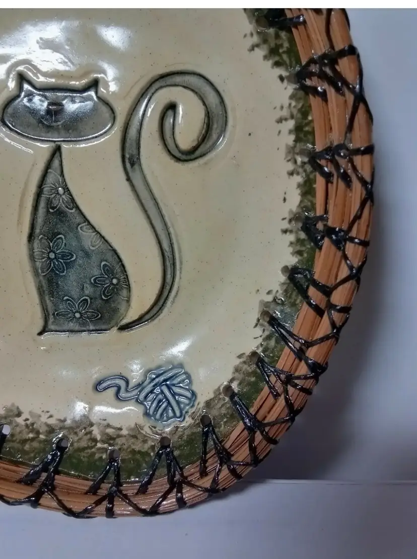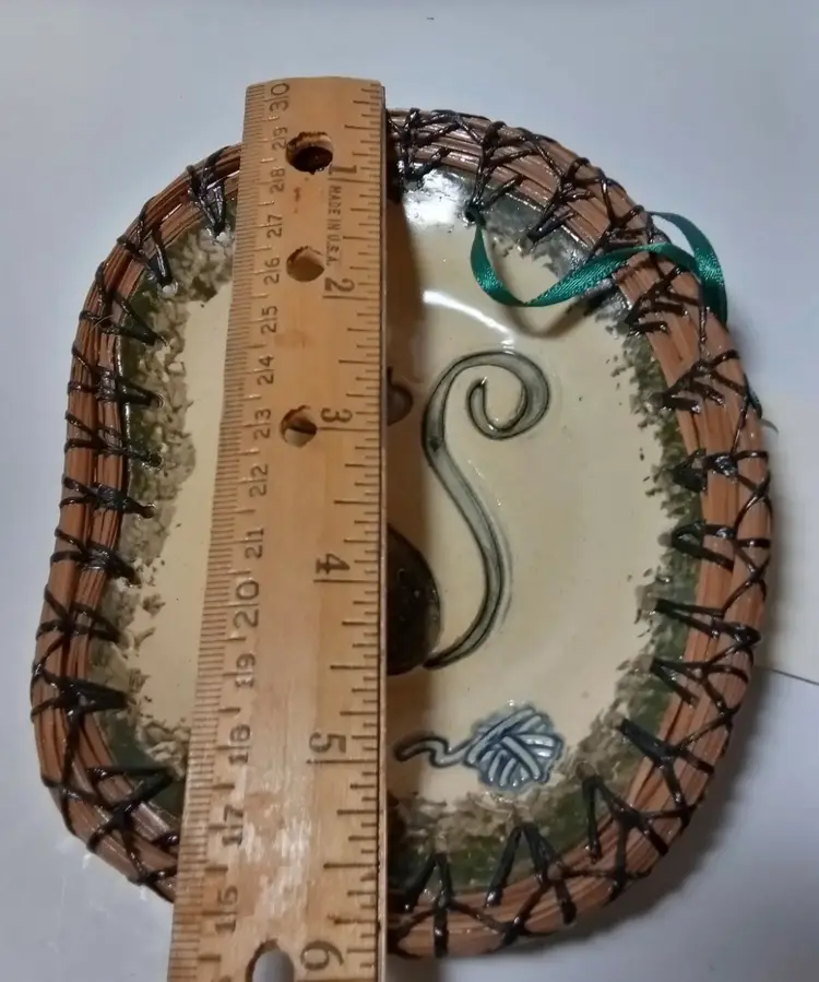 Hand made, Oval Tray, Trinket Dish. Cat with bundle of yarn. 6" x 4.75". Depth .75". No flaws.