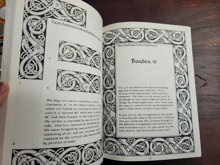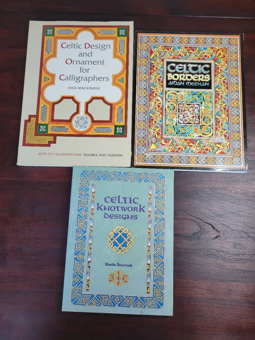 I have three books that deal with Celtic design, and Knotwork. All are in good to very good condition. At least one does not look like the spine has been creased. These are great resources!!!! One is Celtic Design and Ornament for Calligraphers. The second is Celtic Knotwork Designs, and the third is Celtic Boarders. These are crammed full of ideas and designs in great patterns, with instructions.