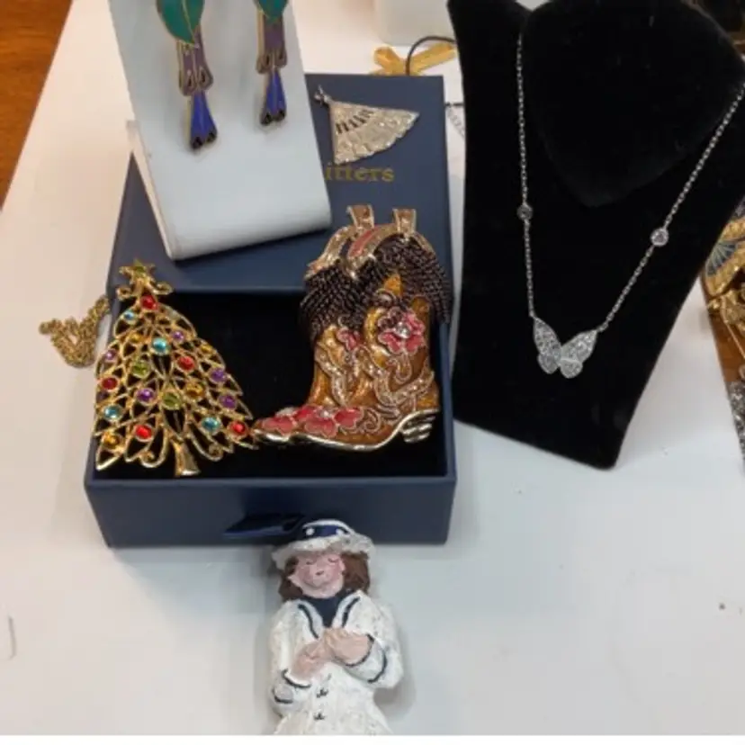 Welcome to our shop of mostly pre-owned and sometimes new jewelry treasures, trinket boxes, compacts - sometimes art and glass. Please follow us so you're in the know when we go live or add new items. Our curated beauties include a large selection of vintage pieces as well as many contemporary items. We also craft and design our own fun costume (and some fine) jewelry pieces, bookmarks, digital art and more in our small studio.