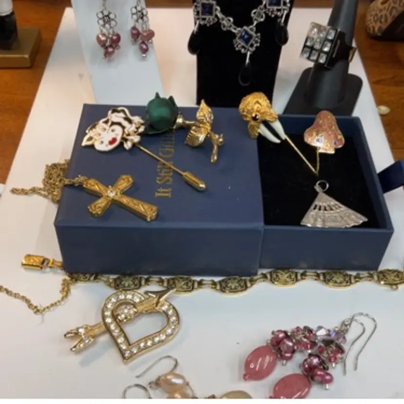 Welcome to our shop of mostly pre-owned and sometimes new jewelry treasures, trinket boxes, compacts - sometimes art and glass. Please follow us so you're in the know when we go live or add new items. Our curated beauties include a large selection of vintage pieces as well as many contemporary items. We also craft and design our own fun costume (and some fine) jewelry pieces, bookmarks, digital art and more in our small studio.
