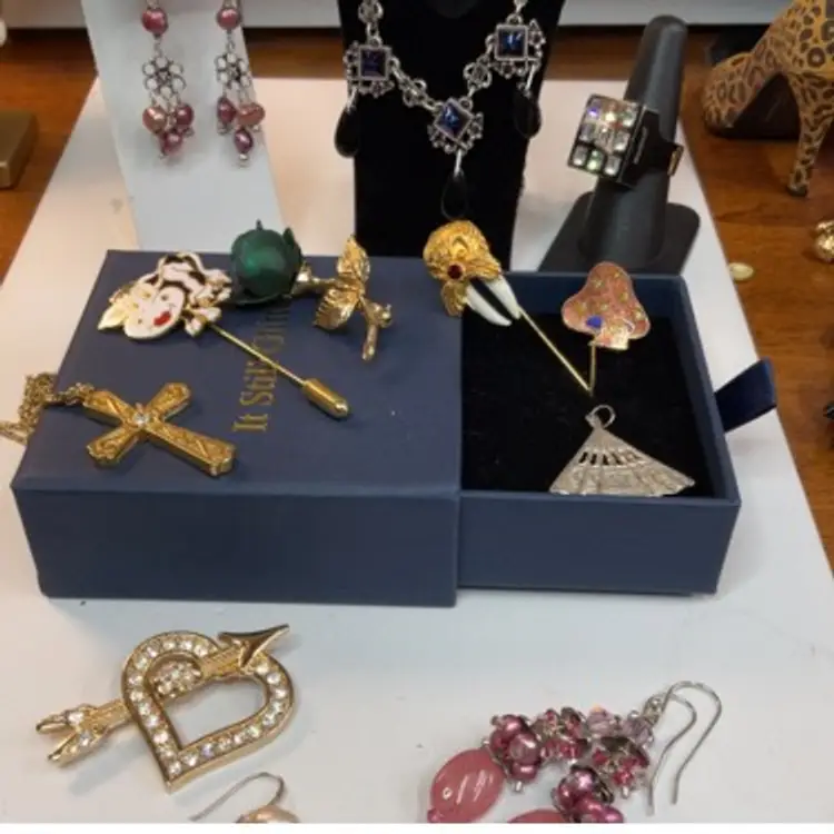 Welcome to our shop of mostly pre-owned and sometimes new jewelry treasures, trinket boxes, compacts - sometimes art and glass. Please follow us so you're in the know when we go live or add new items. Our curated beauties include a large selection of vintage pieces as well as many contemporary items. We also craft and design our own fun costume (and some fine) jewelry pieces, bookmarks, digital art and more in our small studio.