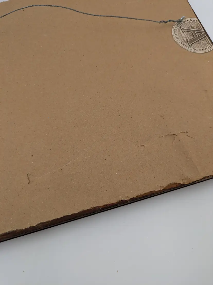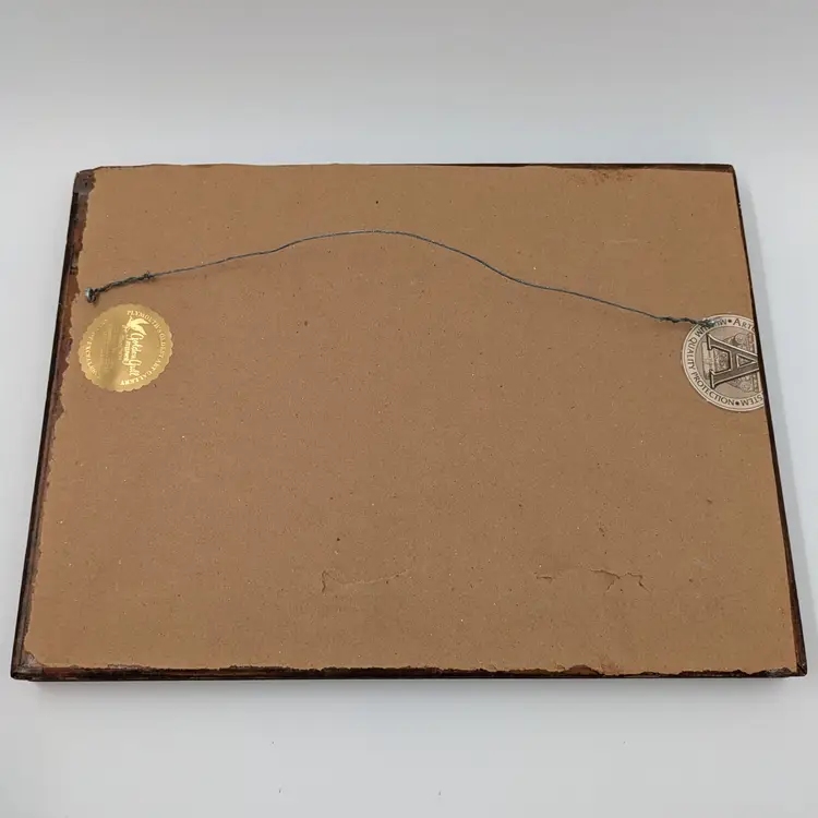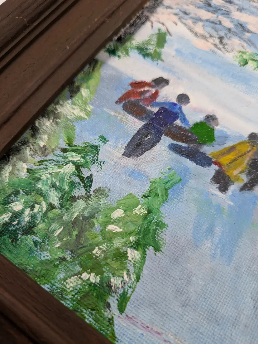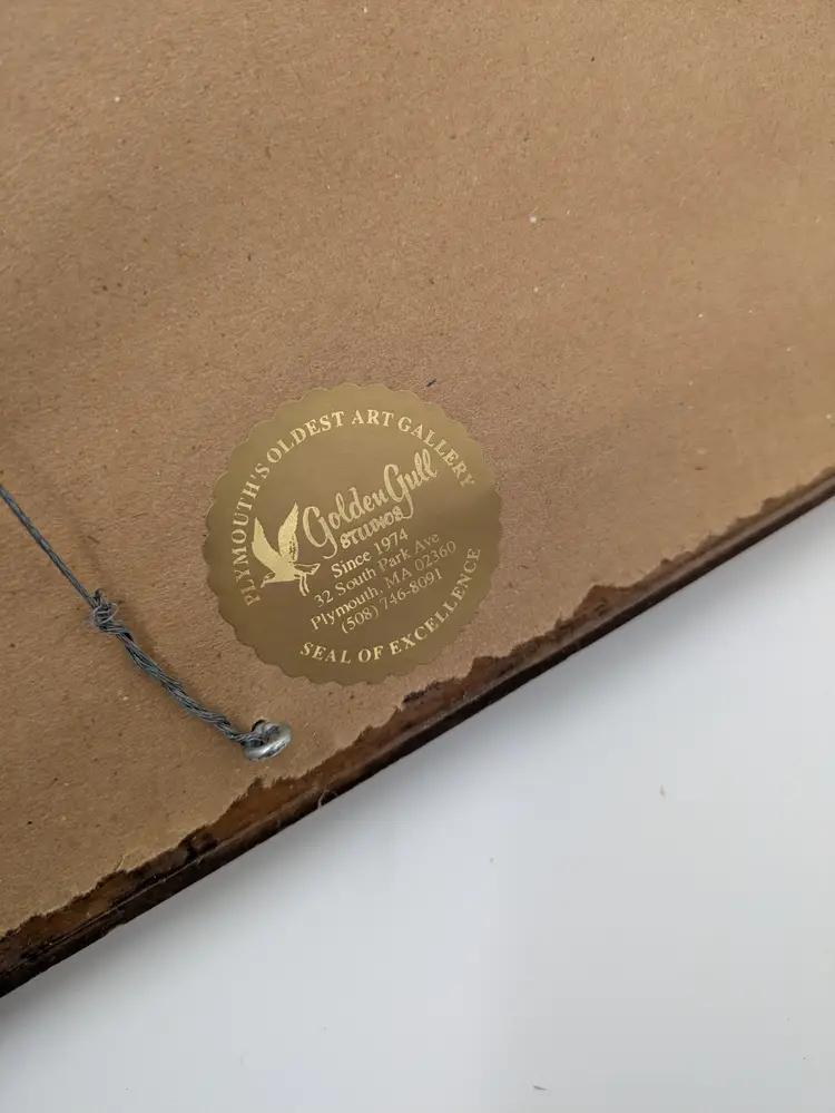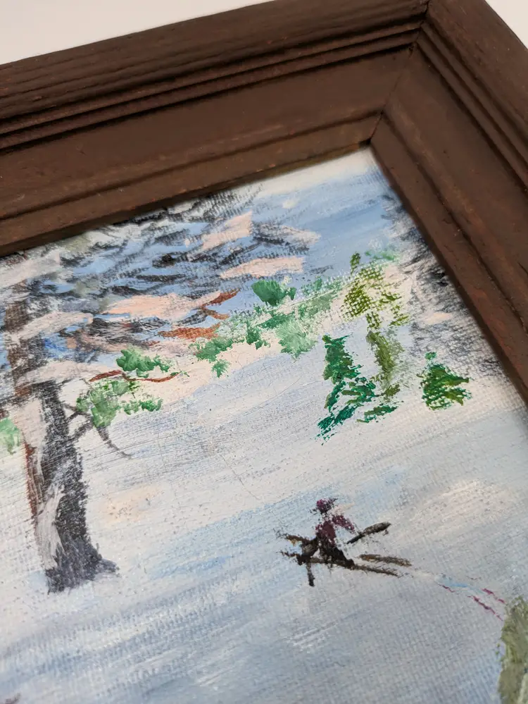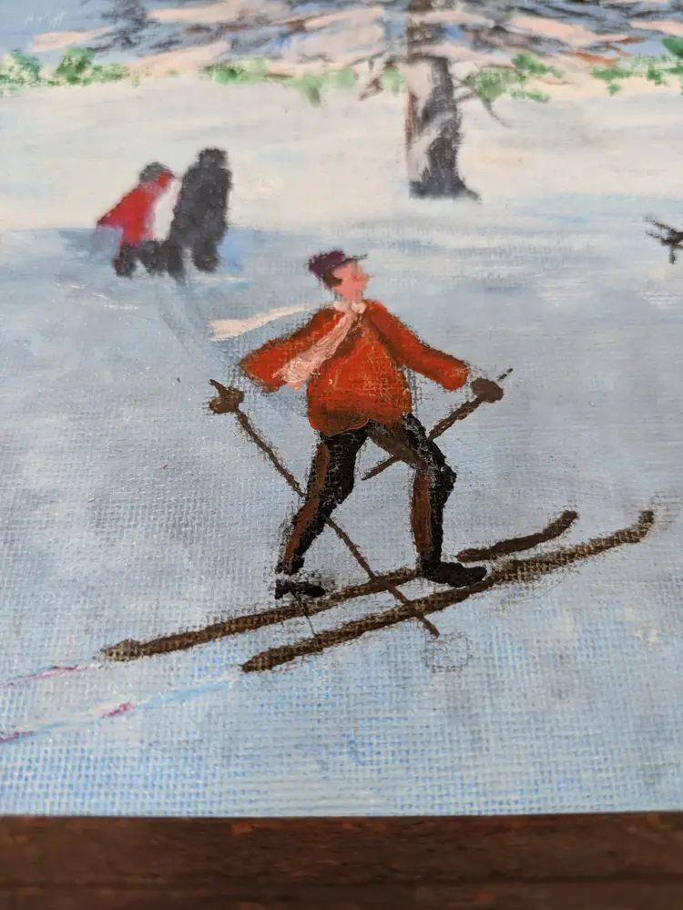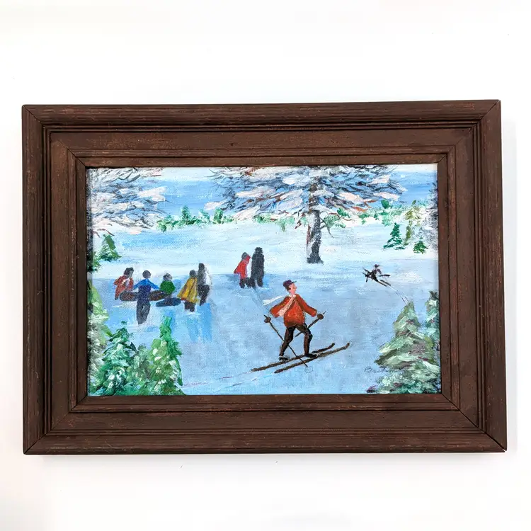 Charming hand-painted winter scene featuring skiers and families enjoying a snowy day. Bright colors and playful details capture the joy of outdoor fun, from a skier in a red sweater gliding through the snow to bundled-up figures gathering in the background. Painted on canvas in acrylics, this piece has a cozy folk-art feel that adds warmth and nostalgia to any space. Perfect for cabin décor, seasonal decorating, or vintage art collectors. Framed by local (now defunct) Golden Gull Studios in Plymouth, MA. Wooden frame with a brown glaze. Backing paper has a small tear. Signed by the artist on the front.