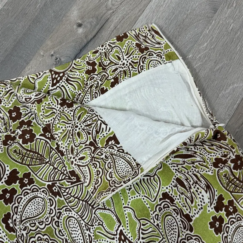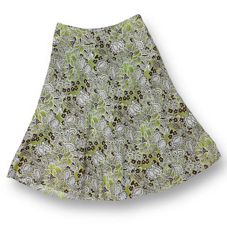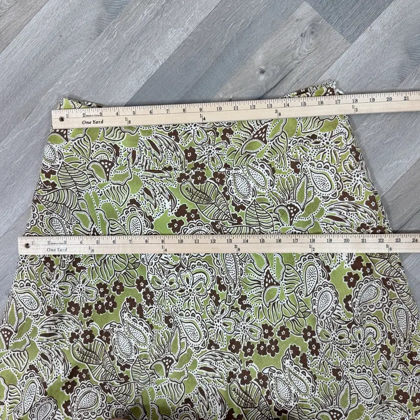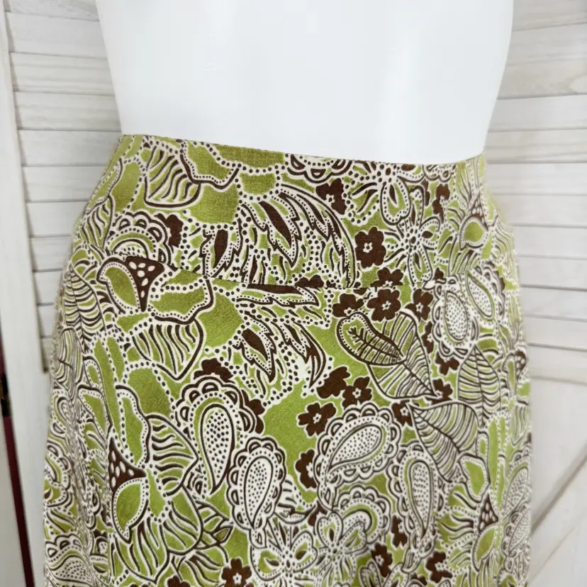 Sage lime green with brown white paisley floral print Palm leaf 100% linen Below knee midi length A-line flare Wide band waist Hidden side zipper Lined